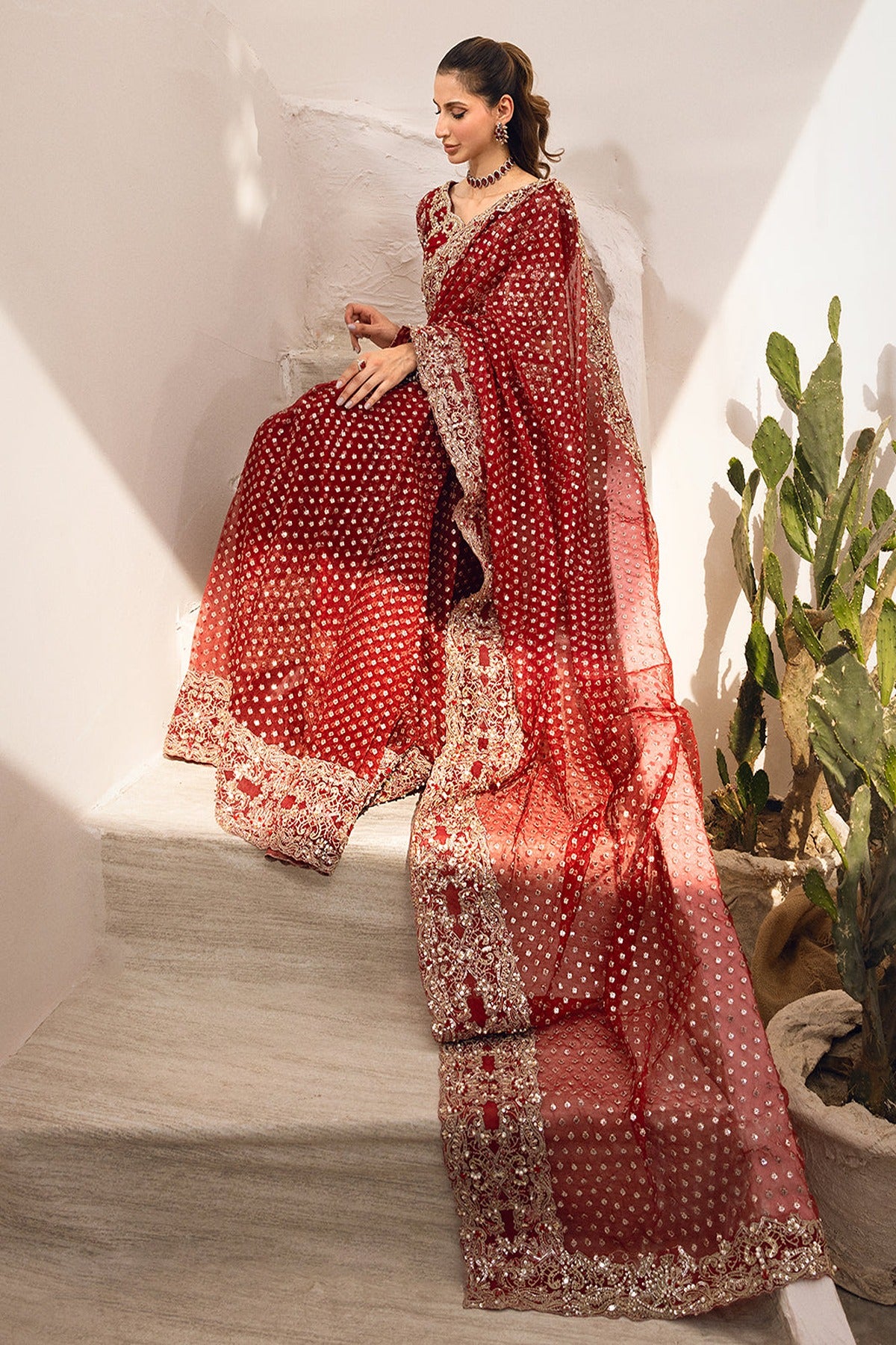 - Experience the epitome of luxury with our stunning maroon organza saree, an exquisite creation. The saree is adorned with meticulously hand-embellished borders, showcasing intricate craftsmanship that adds a touch of regal elegance to the flowing organza fabric.