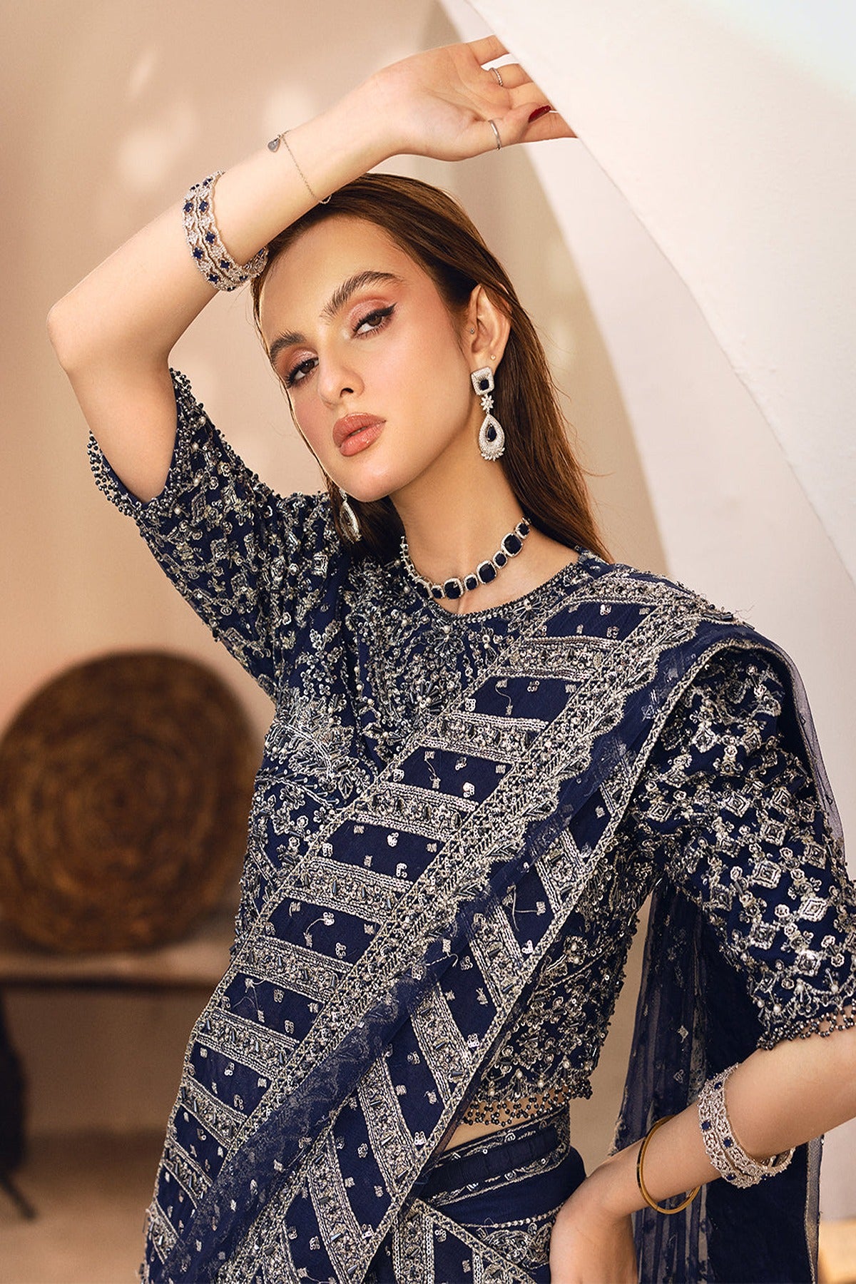 - Paired with a matching navy-blue blouse, this ensemble is a true celebration of intricate craftsmanship. The blouse is adorned with delicate silver handcrafting and adorned with shimmering beads, creating a harmonious blend of texture and sparkle. Each element of the blouse is meticulously designed, enhancing the overall opulence of the outfit.
