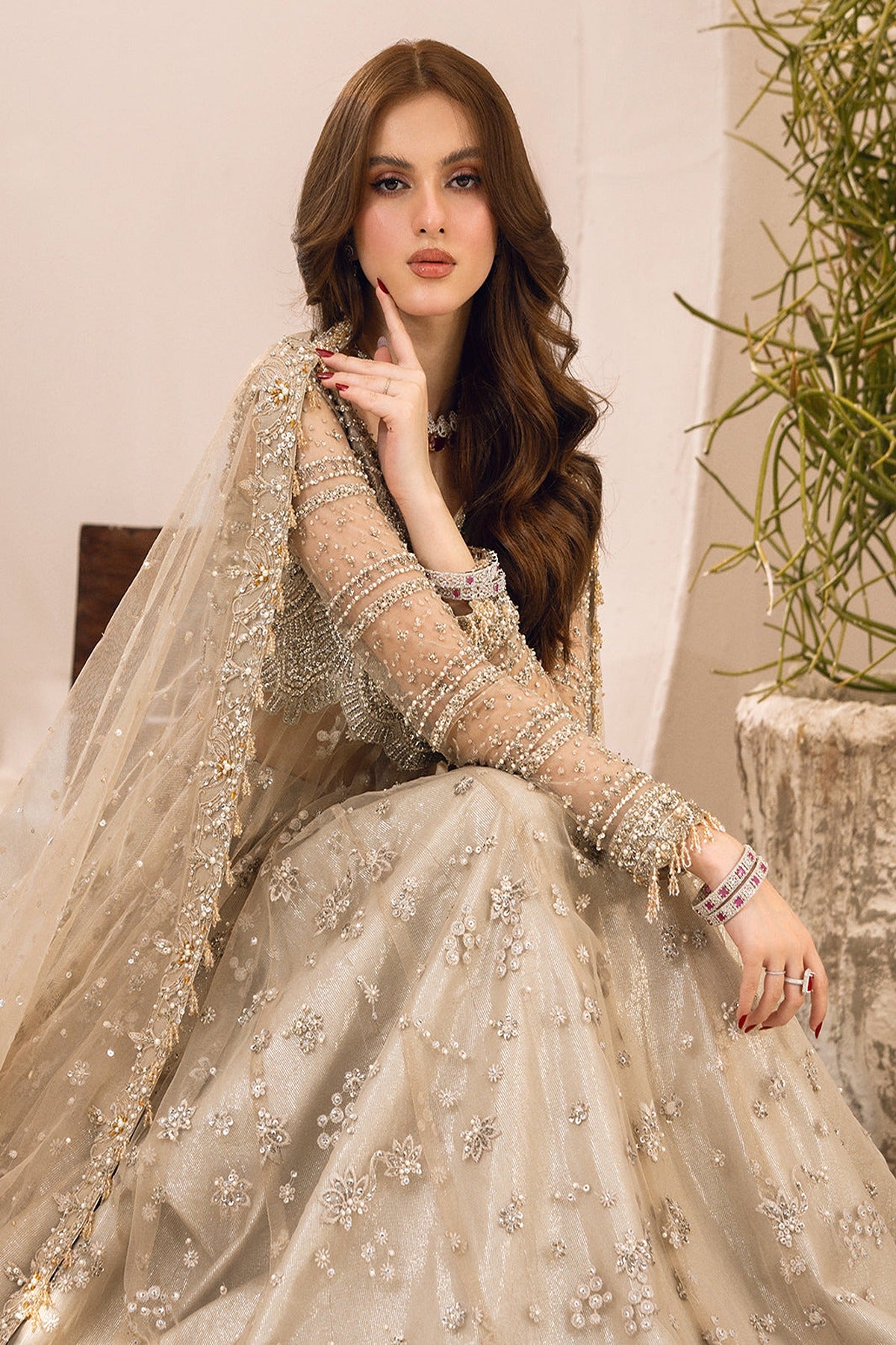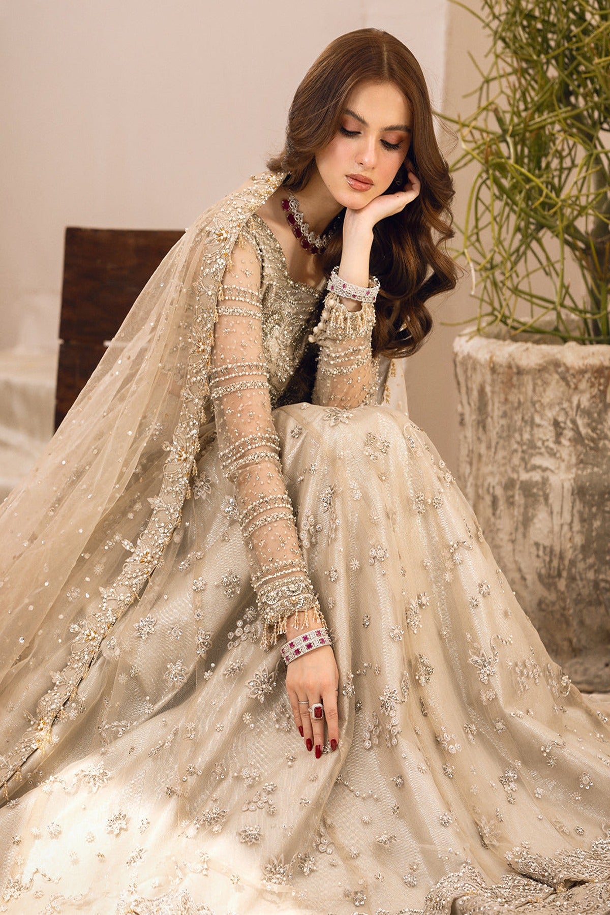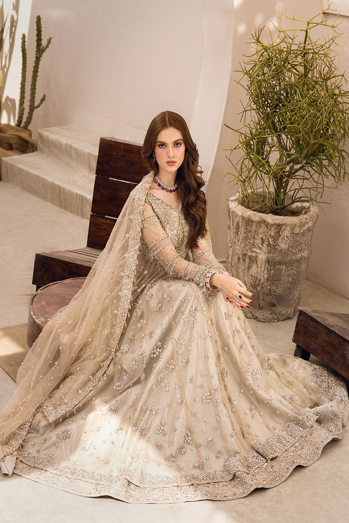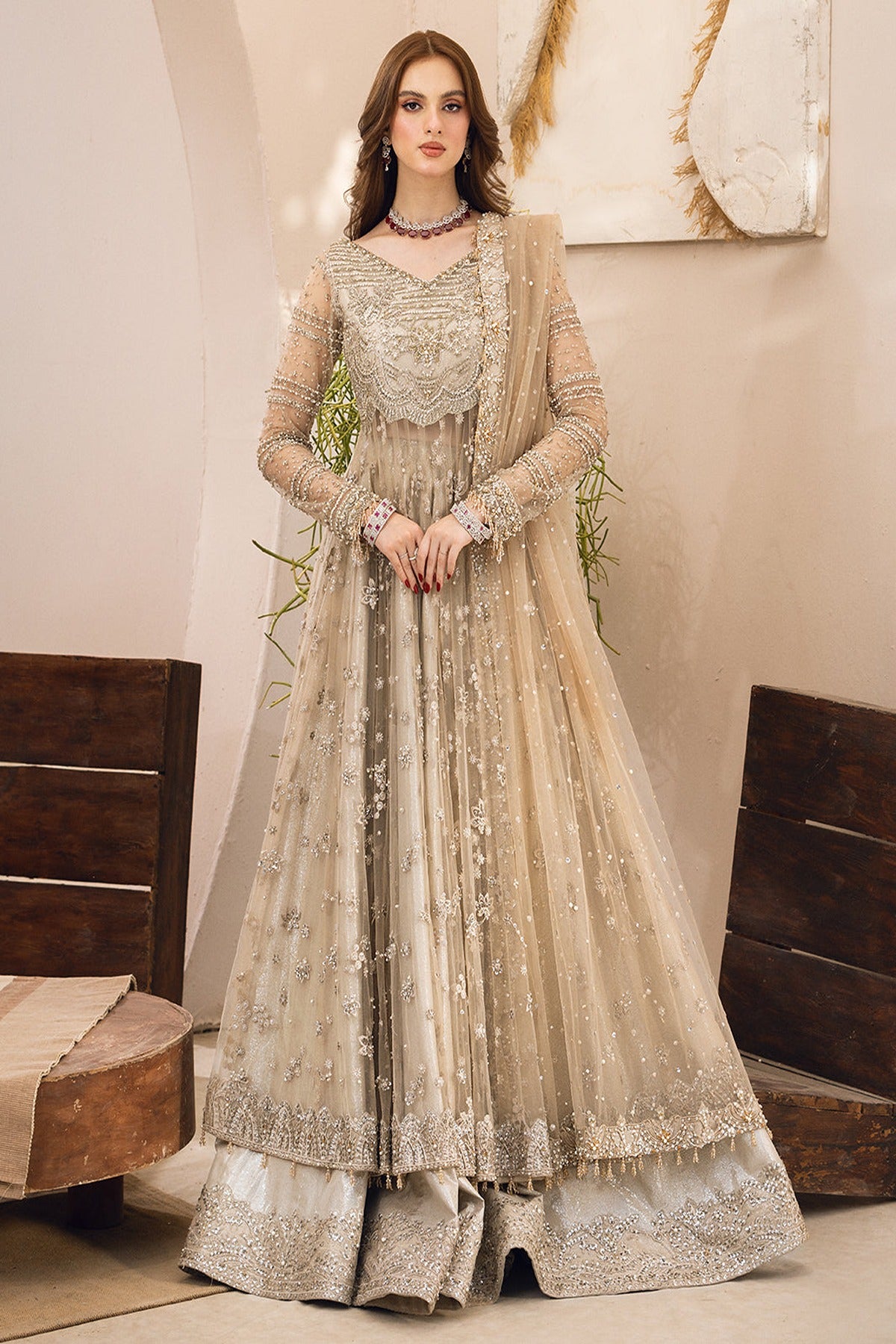 - The outfit is completed with a delicate net dupatta, enhancing the ensemble's grace and sophistication.