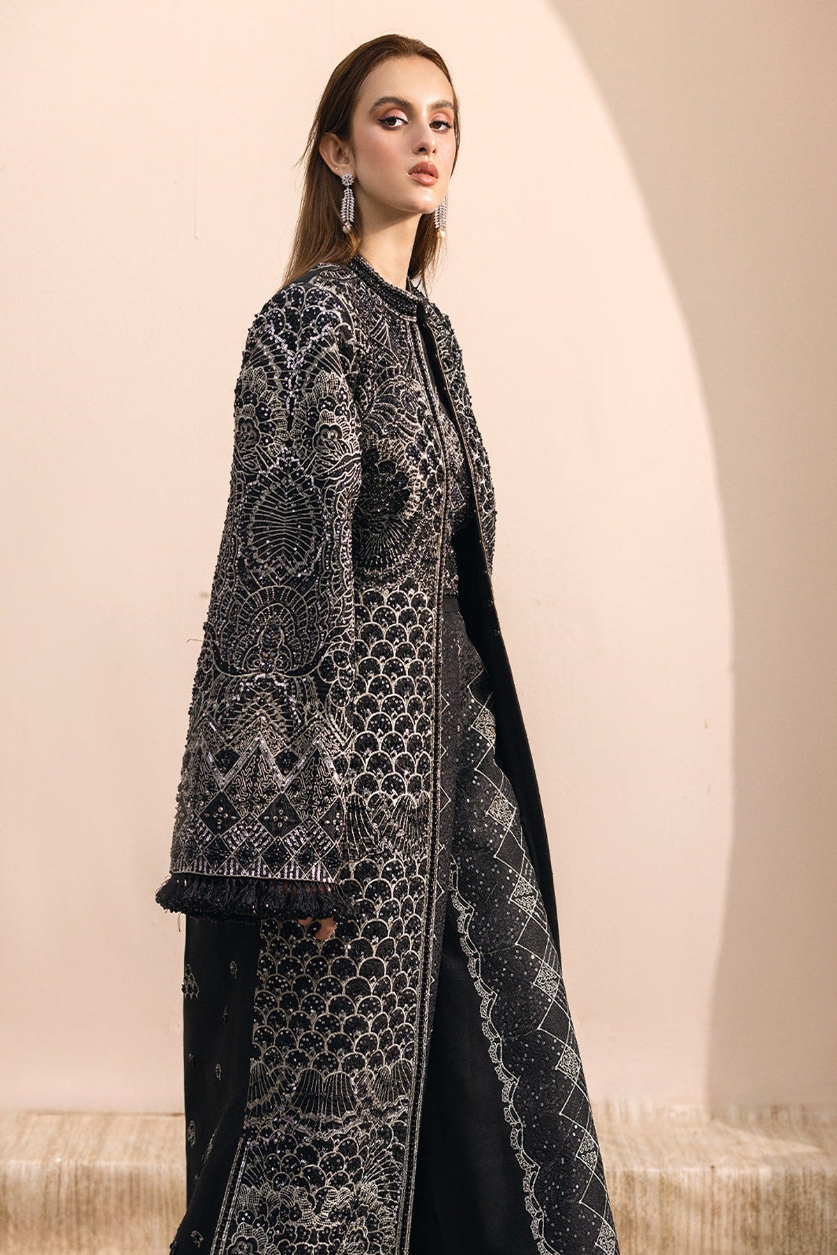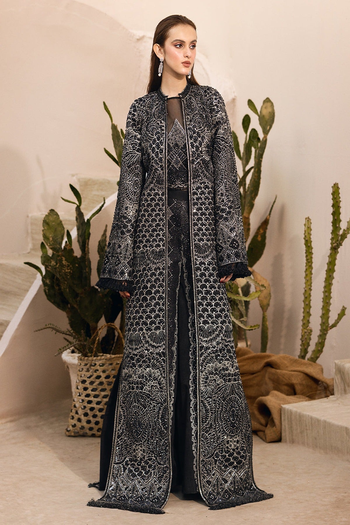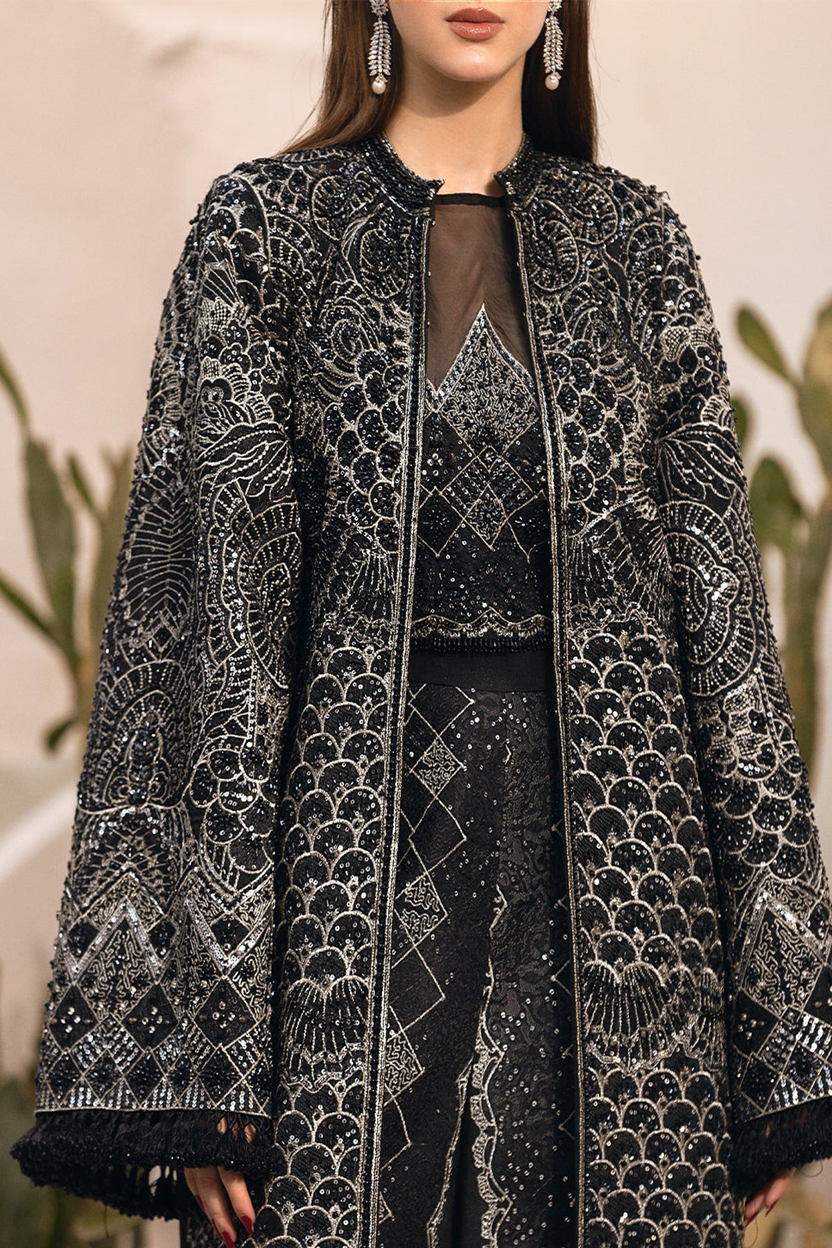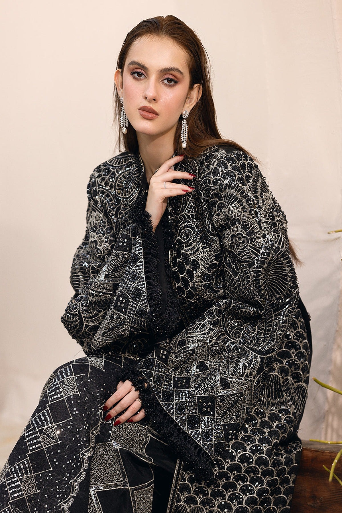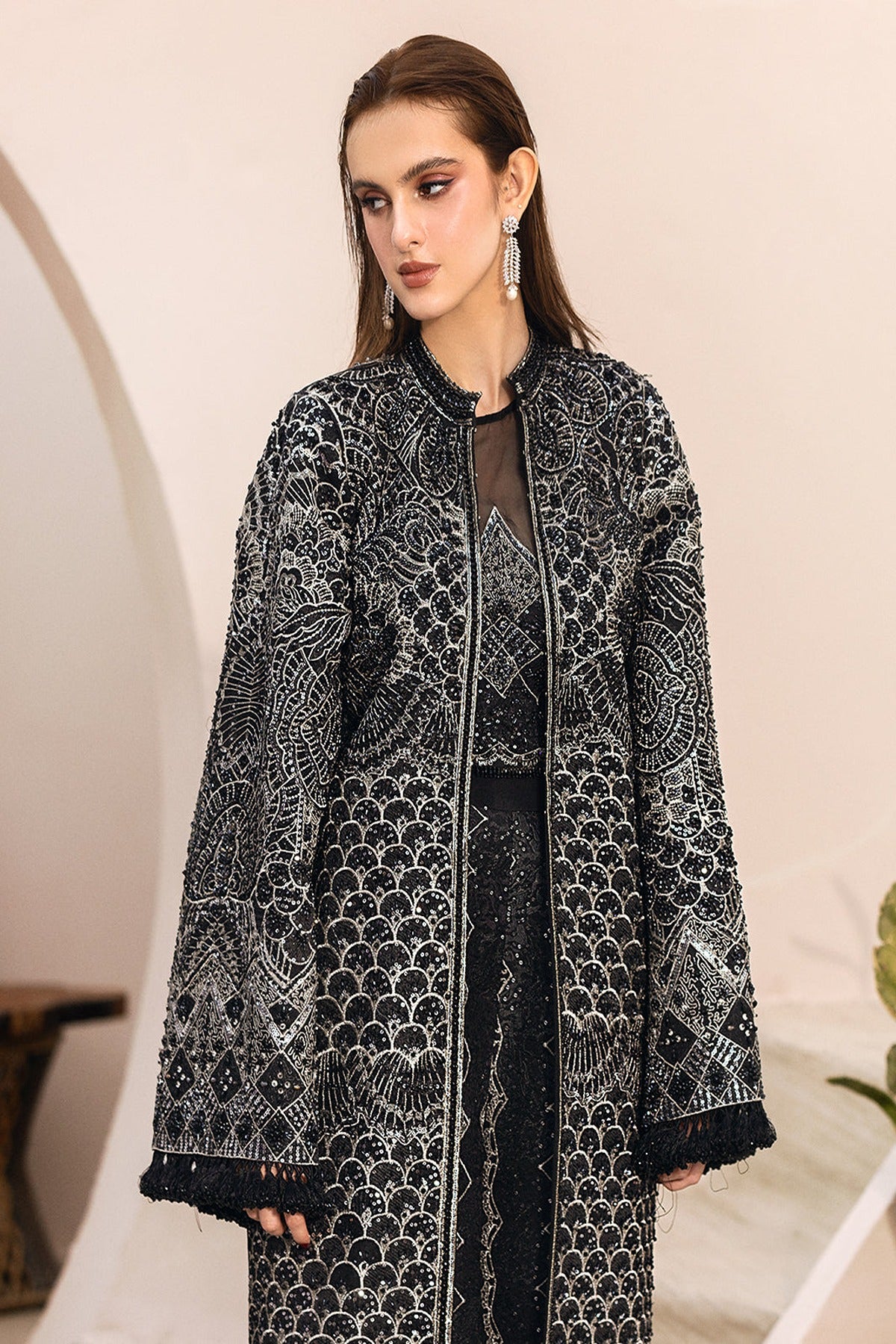 - Elevate your style with this exquisite black jacket dress, adorned with shimmering silver hand embellishments that add a touch of elegance and sophistication.