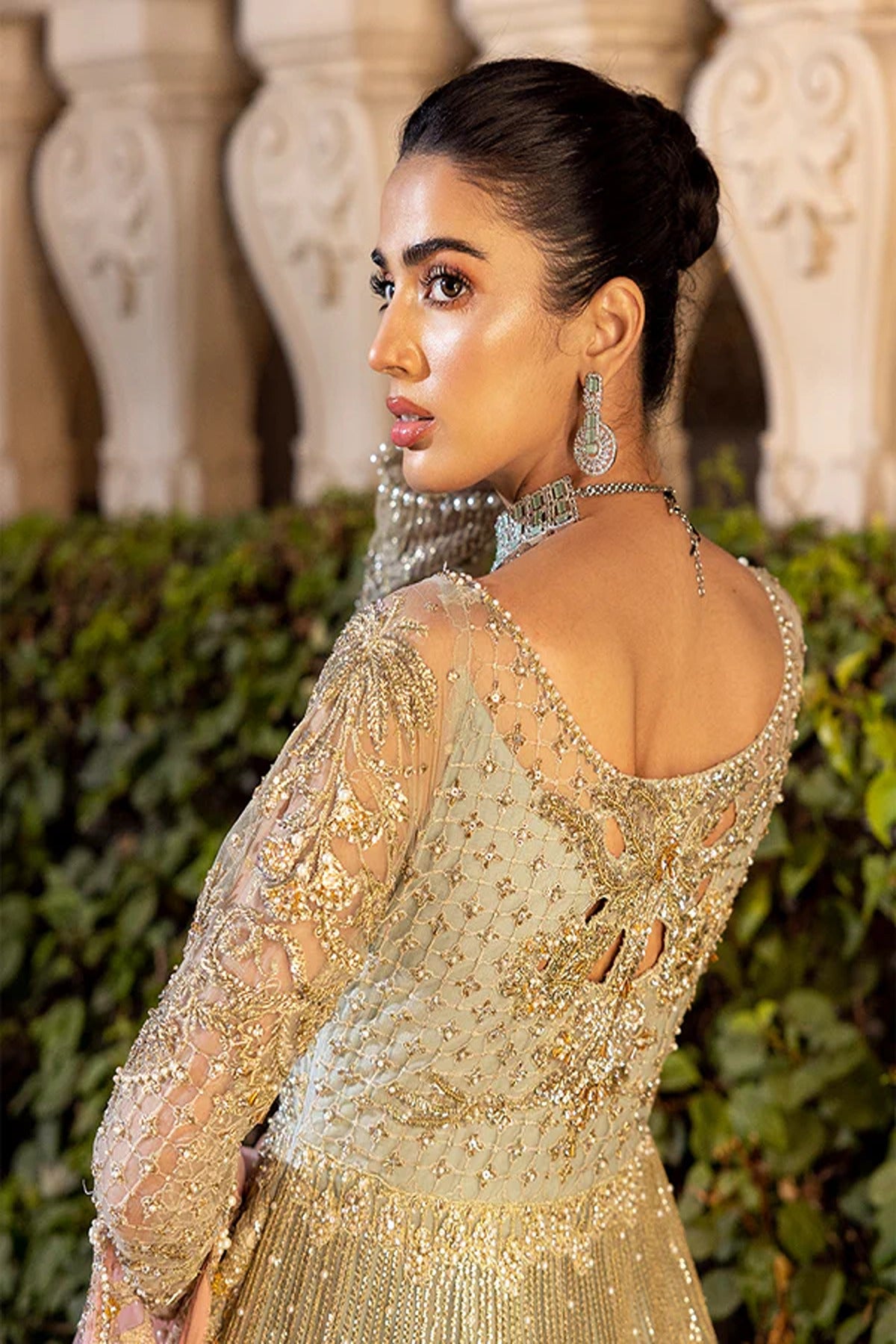 Meticulously crafted attire accompanied by rich festive shades of Pistachio green enhanced with spray of sitara, white pearls, nakshi, sequins, shimmer pani and meticulously rendered embroideries, this ensemble is sure to enchant the senses.