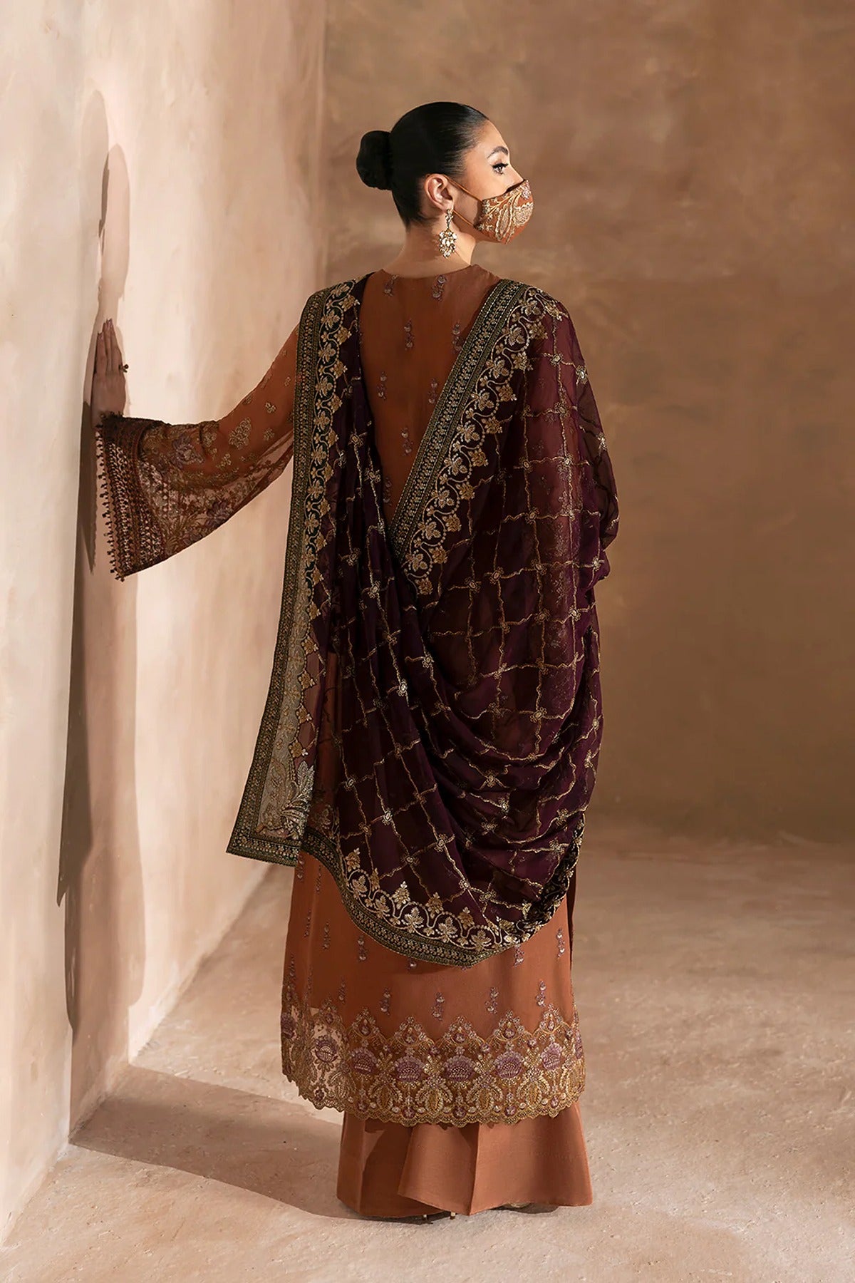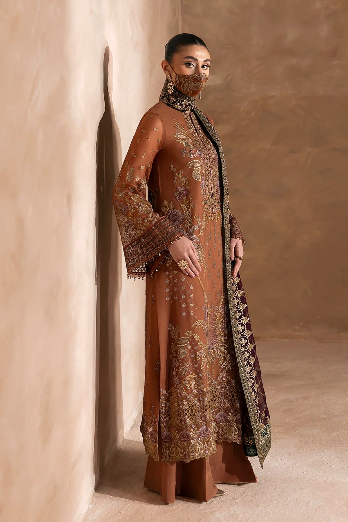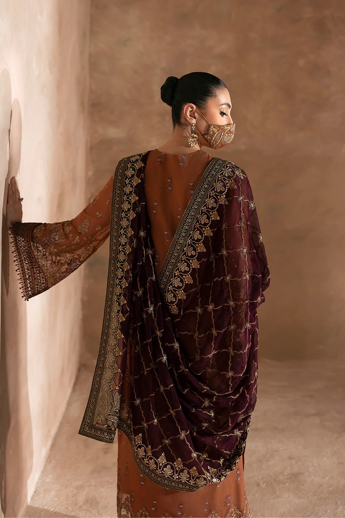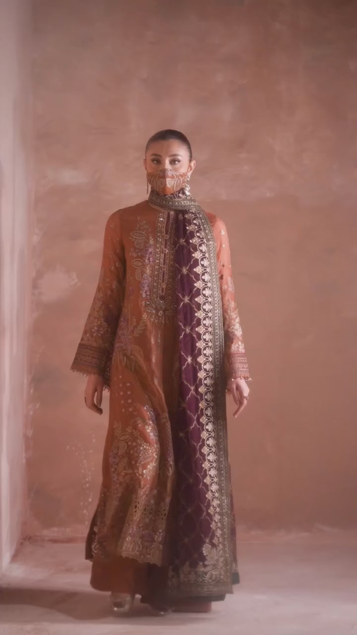 LACONIC by Flossie, featuring a meticulously crafted outfit, designed for a refined and timeless look. The ensemble includes an embroidered chiffon front, back, and sleeves, enhanced with a contrasting chiffon dupatta and intricately designed organza borders. The dupatta features exquisite embroidered pallus and edges that add a luxurious touch to the overall aesthetic. A hand-made embroidered organza neckline and plain silk trousers complete this elegant package. Creating a sophisticated, high-fashion statement.