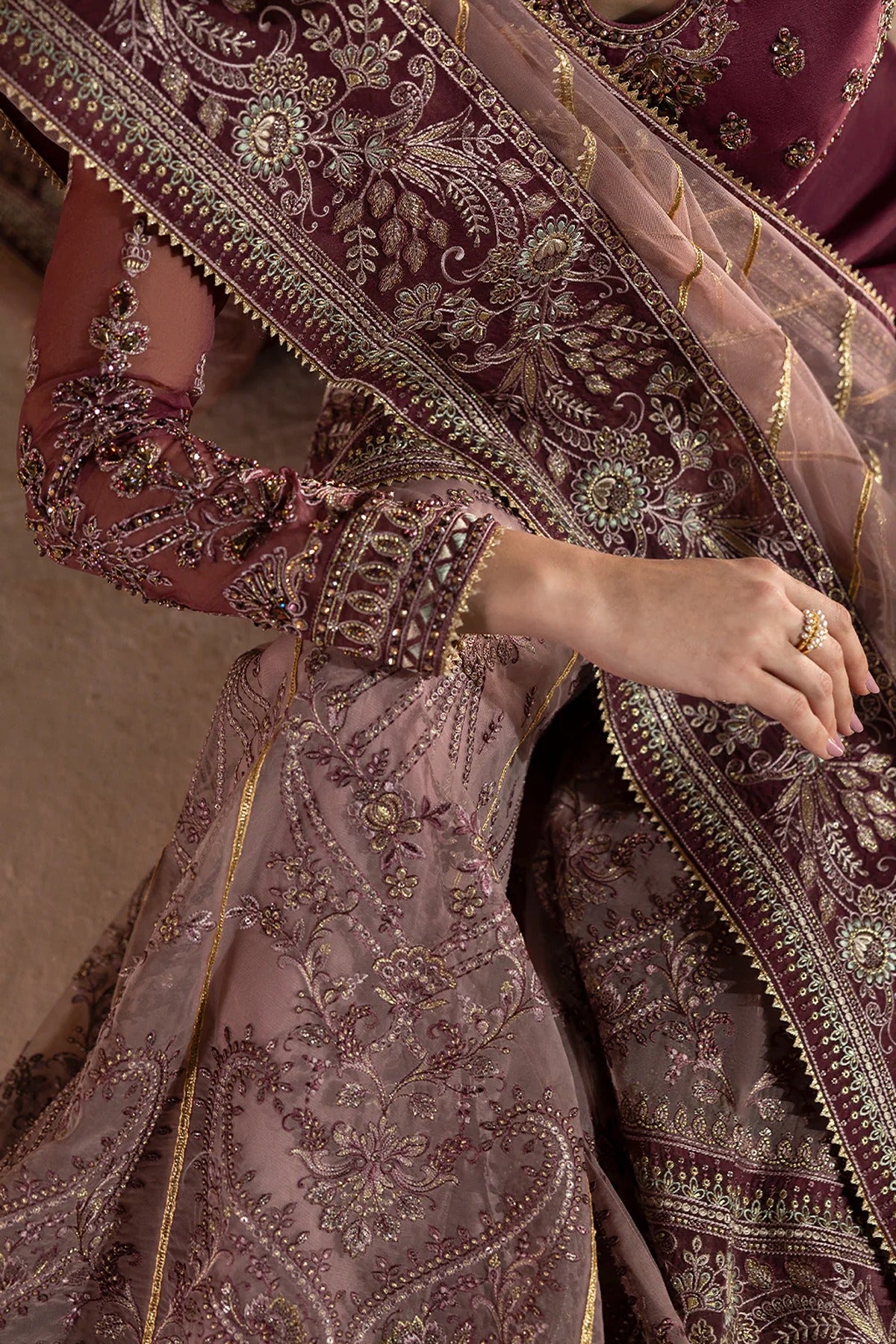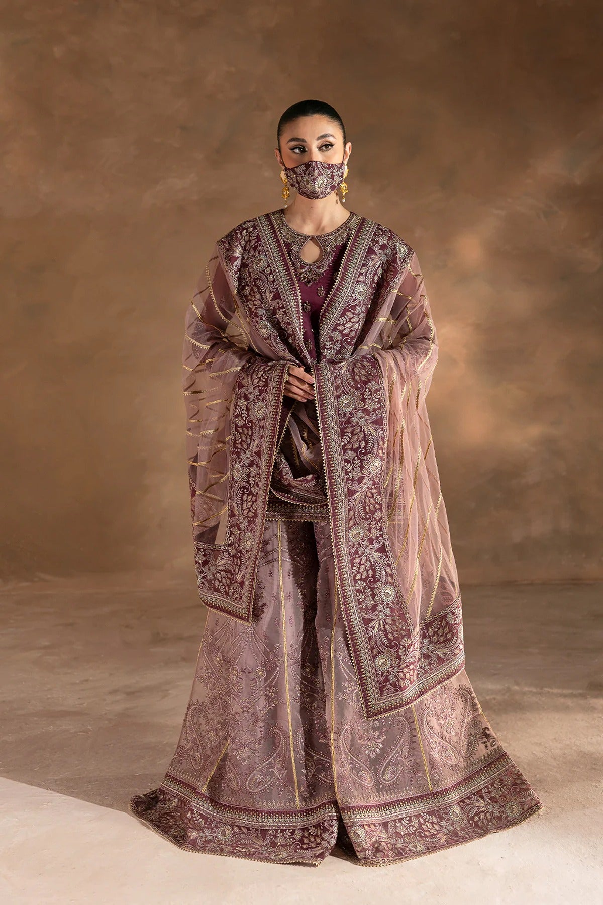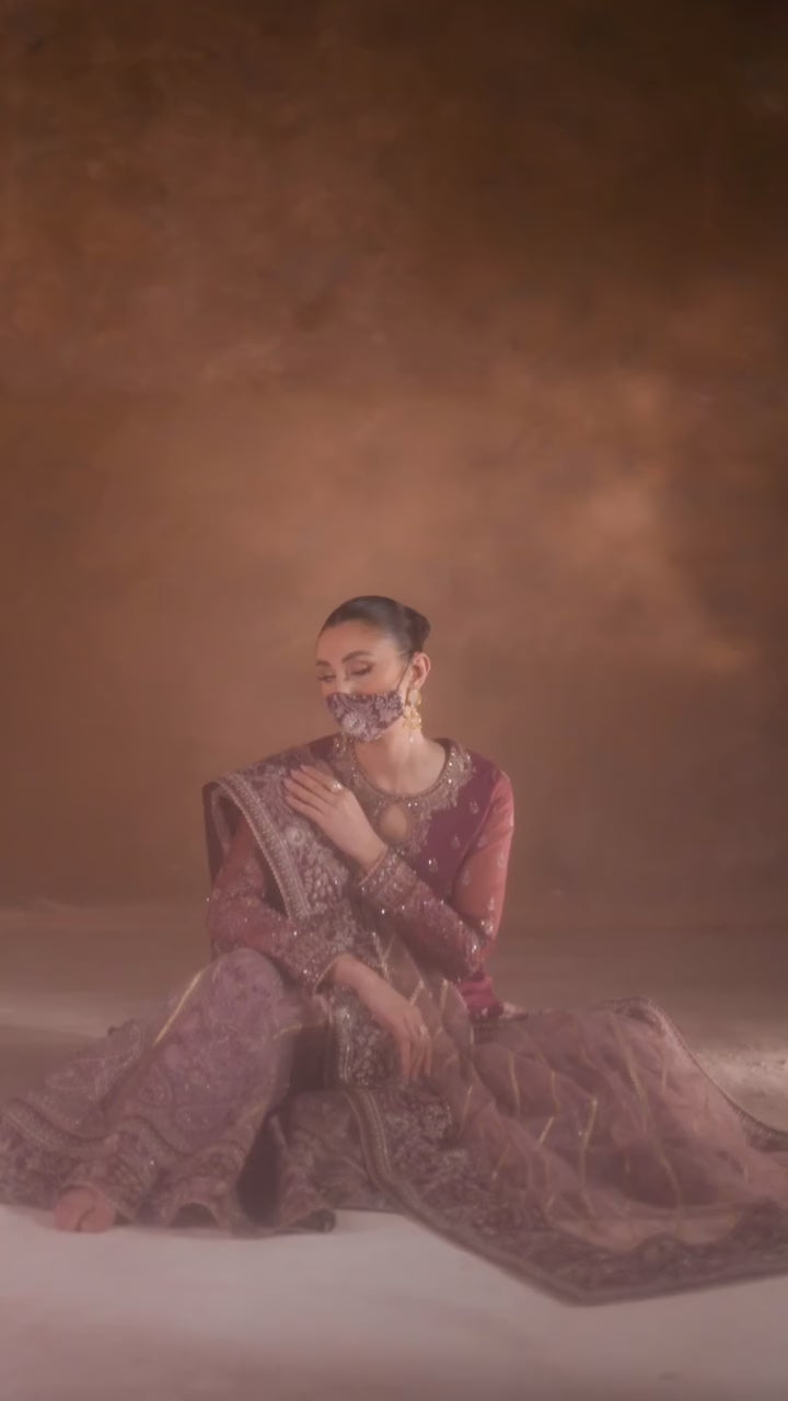 A regal ensemble featuring a hand-made embroidered organza front, back, and sleeves, paired with a plain net dupatta and a stunning organza kali sharara. Perfect for formal occasions, its deep purple hue and intricate detailing exude elegance.