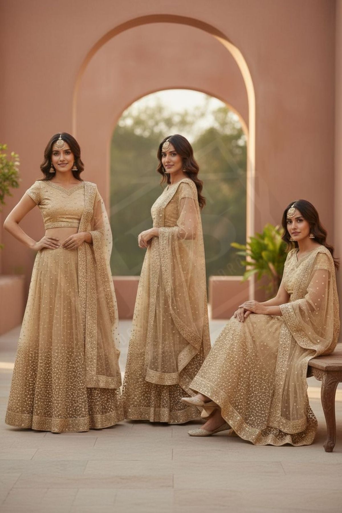 This elegant champagne-gold lehenga set is crafted in shimmer net with a soft, luminous flow. The silk blouse features delicate handwork, with a plain back finished with a refined border detailing. The shimmer net dupatta is enhanced with sheesha patti lace along the edges and subtle shimmer throughout. Timeless, graceful, and effortlessly luxurious — perfect for a modern yet classic look.