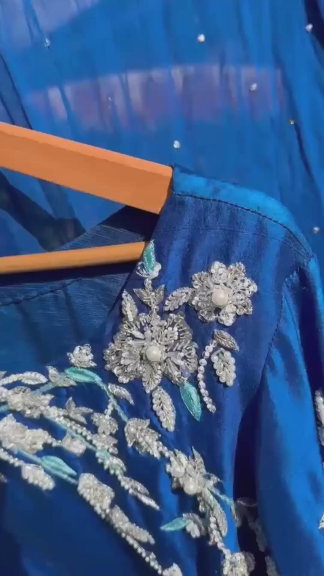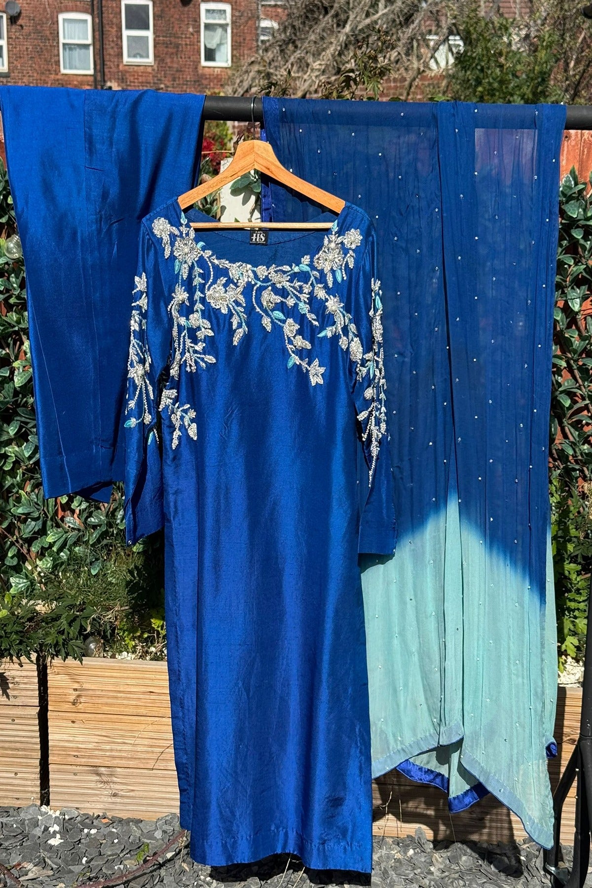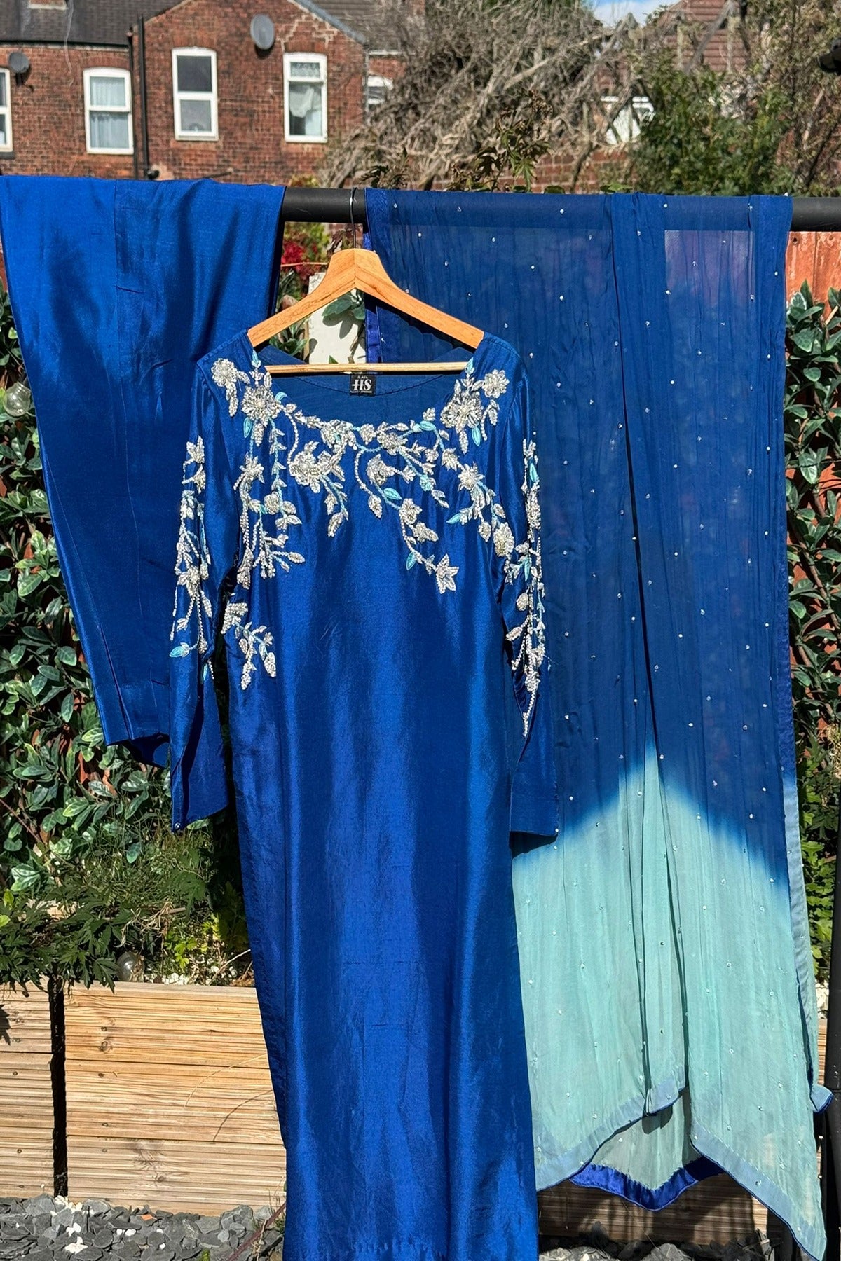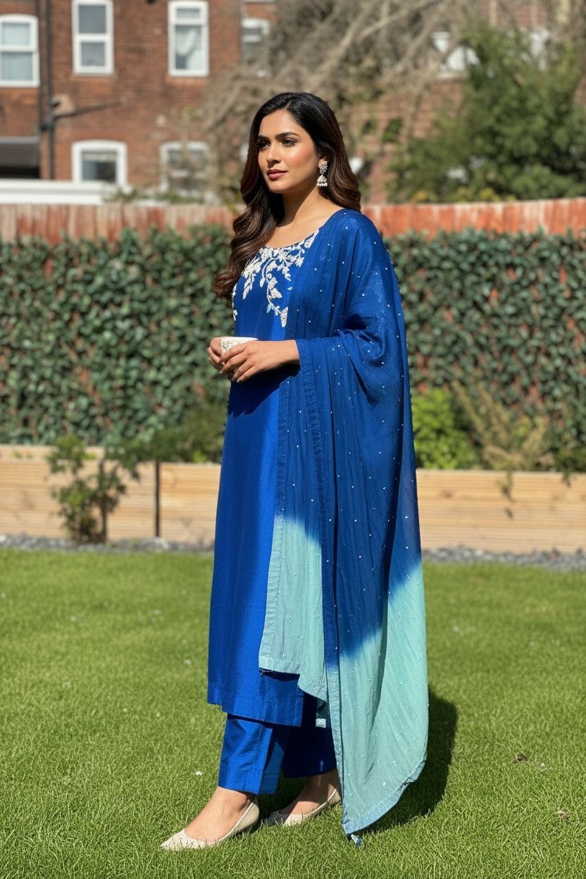 A striking royal blue three-piece ensemble crafted from a lustrous fabric that catches the light beautifully. The straight-cut kameez features intricate silver and light blue threadwork embroidery across the neckline and sleeves, designed with delicate floral and leafy patterns that add elegance and sophistication. Paired with plain matching trousers for a sleek finish, the outfit is complemented by a gradient chiffon dupatta, transitioning from deep blue to a soft aqua shade. The dupatta is subtly adorned with scattered sequins, lending a graceful sparkle.