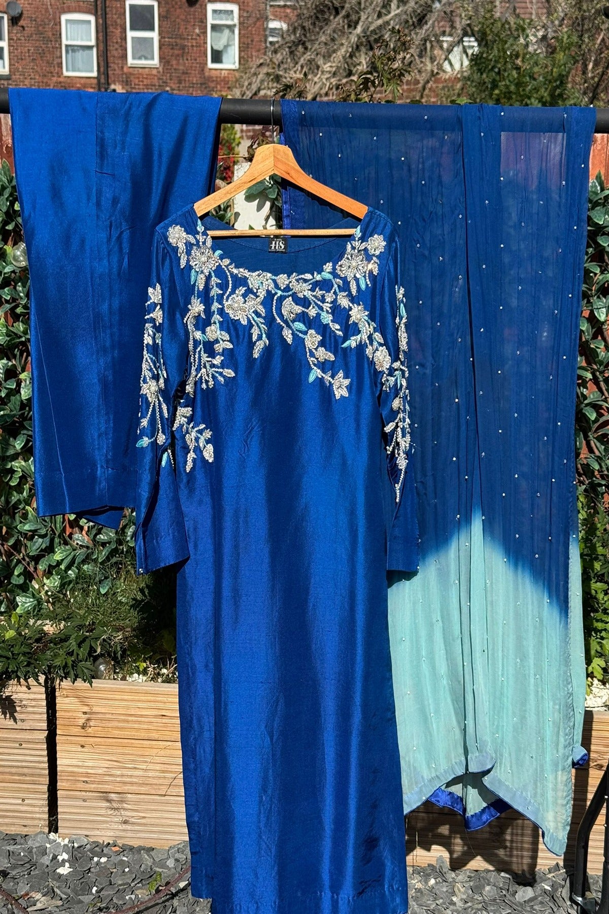 - This ensemble can be tailored in design, fabric, colour, and embellishment, and is available in all sizes up to UK 32. It can also be made into a heavier couture piece for a more luxurious finish, with pricing reflecting the level of detail.