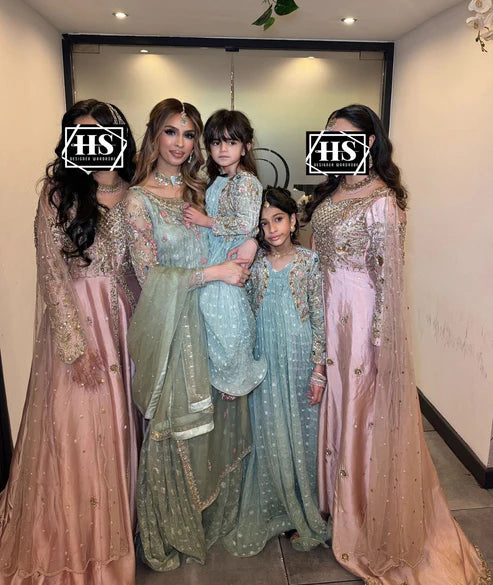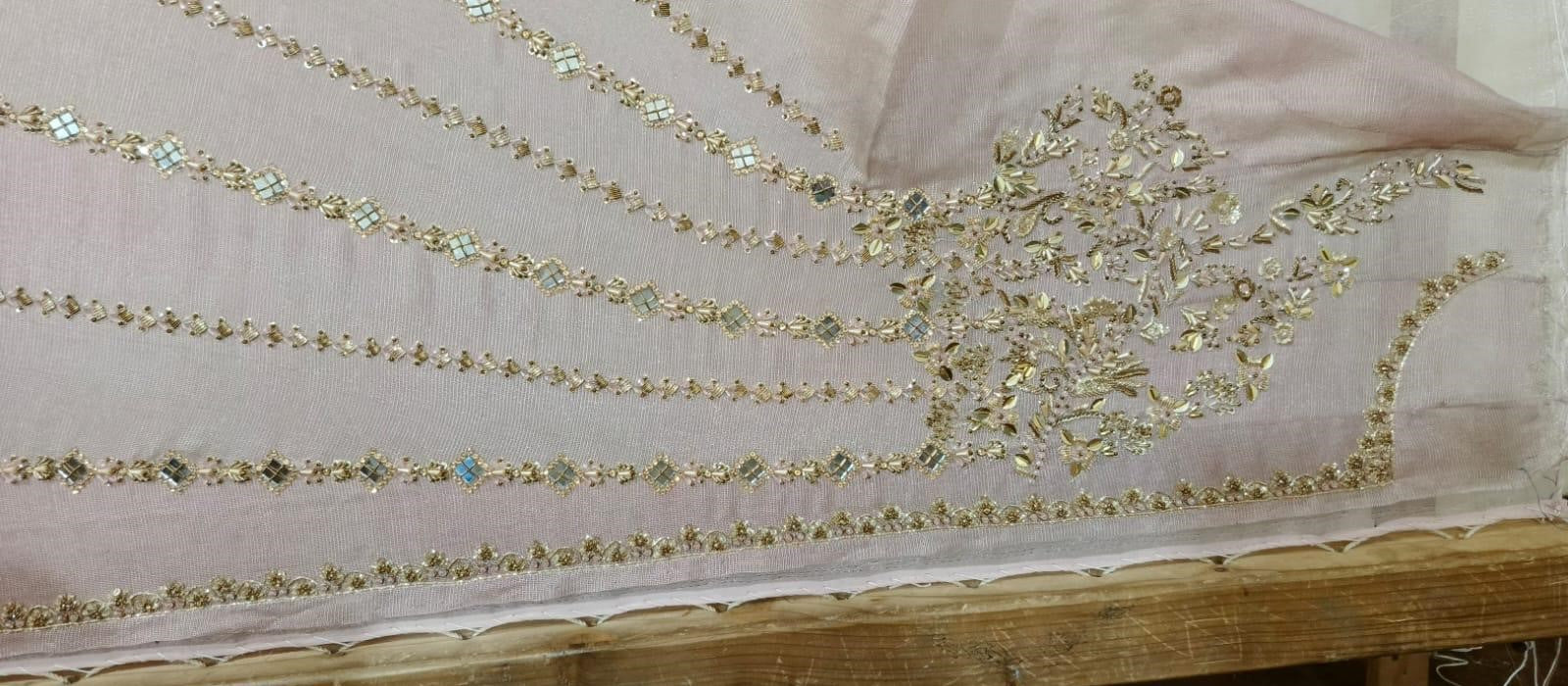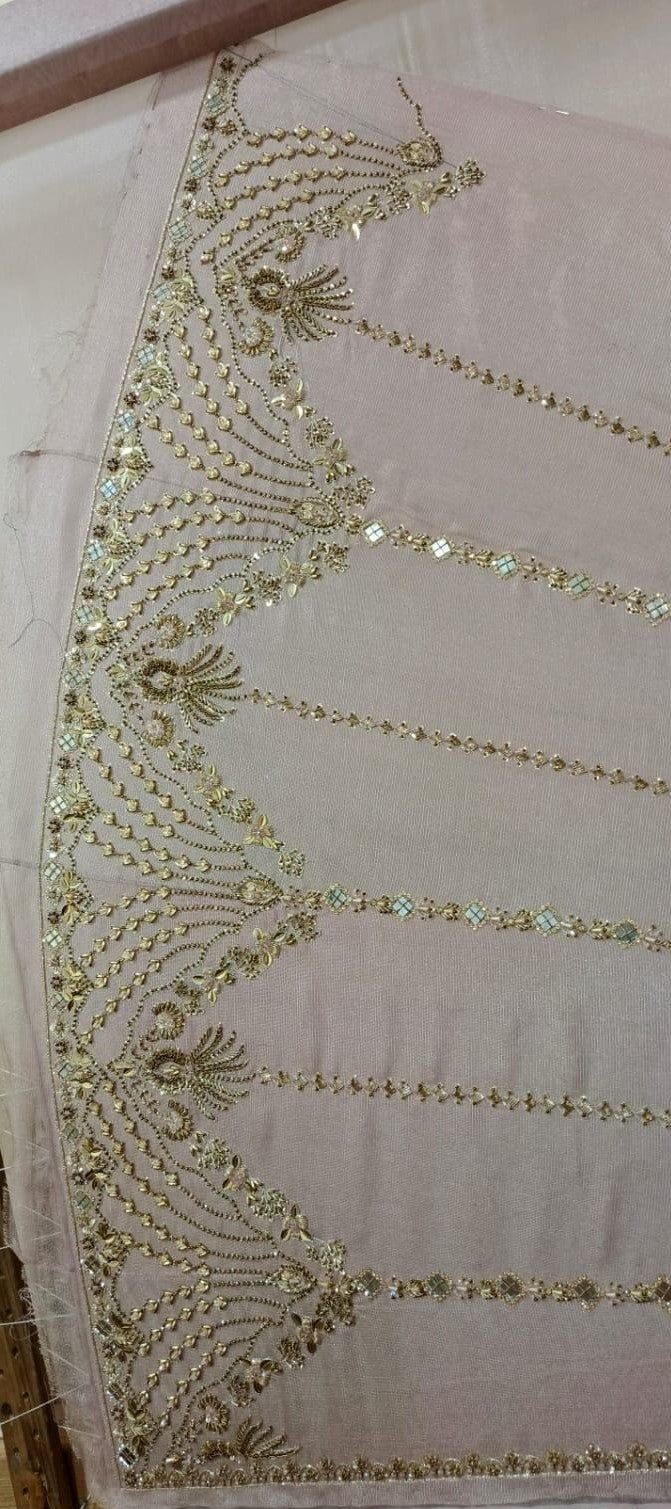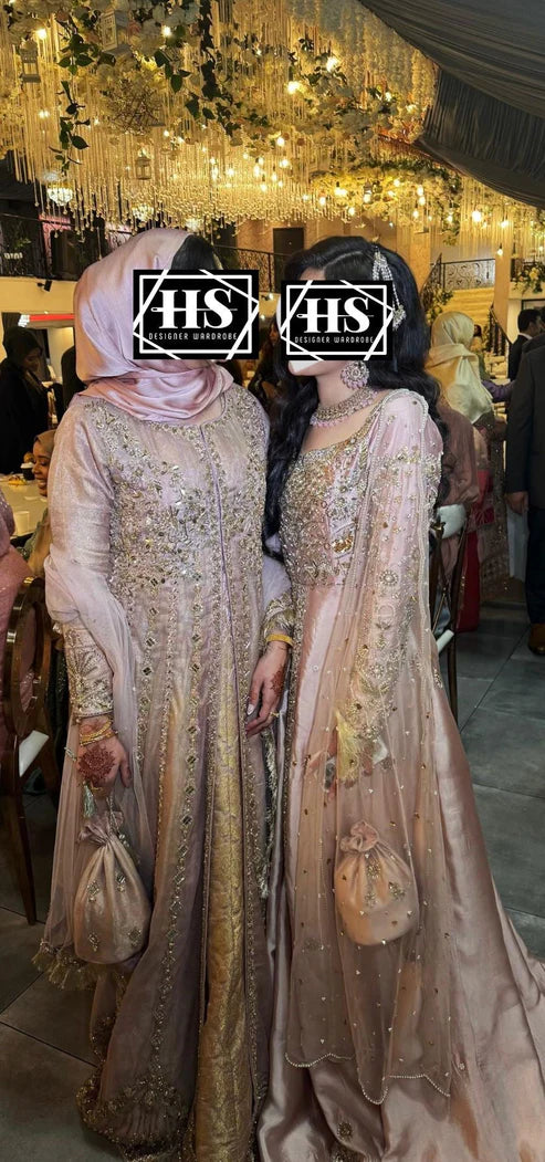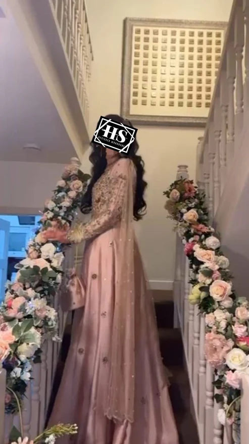 This exquisite *3-piece pishwas set* is crafted on premium Indian silk, intricately embellished with rose gold and gold zari, adda, and dabka work that showcases timeless craftsmanship. The pishwas is paired with a *flowing lehnga* to add volume and grandeur, giving the outfit a truly regal presence.