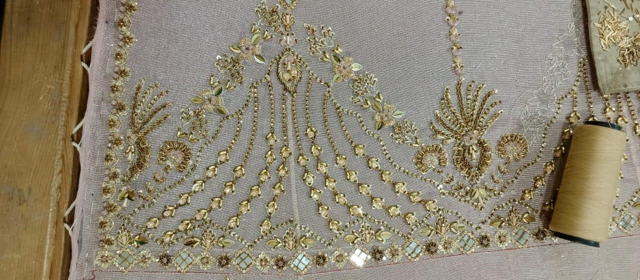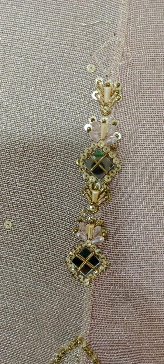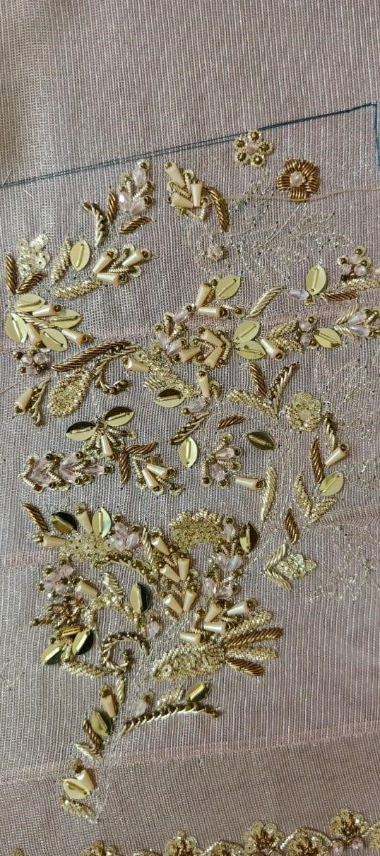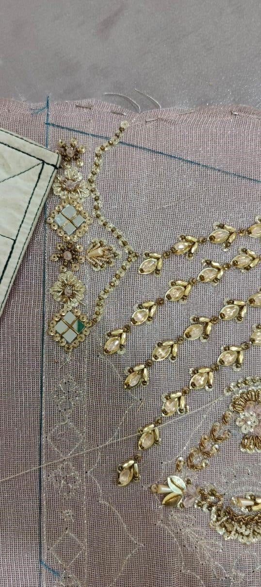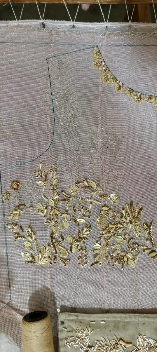 This exquisite *3-piece pishwas set* is crafted on premium Indian silk, intricately embellished with rose gold and gold zari, adda, and dabka work that showcases timeless craftsmanship. The pishwas is paired with a *flowing lehnga* to add volume and grandeur, giving the outfit a truly regal presence.