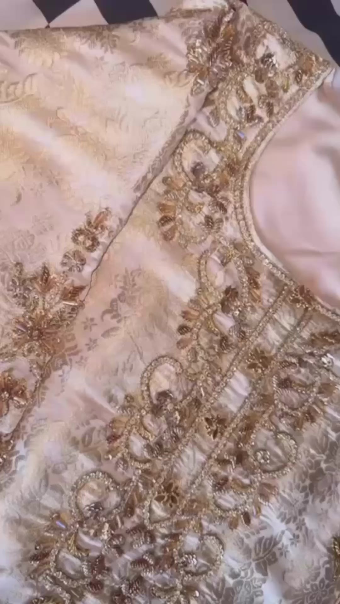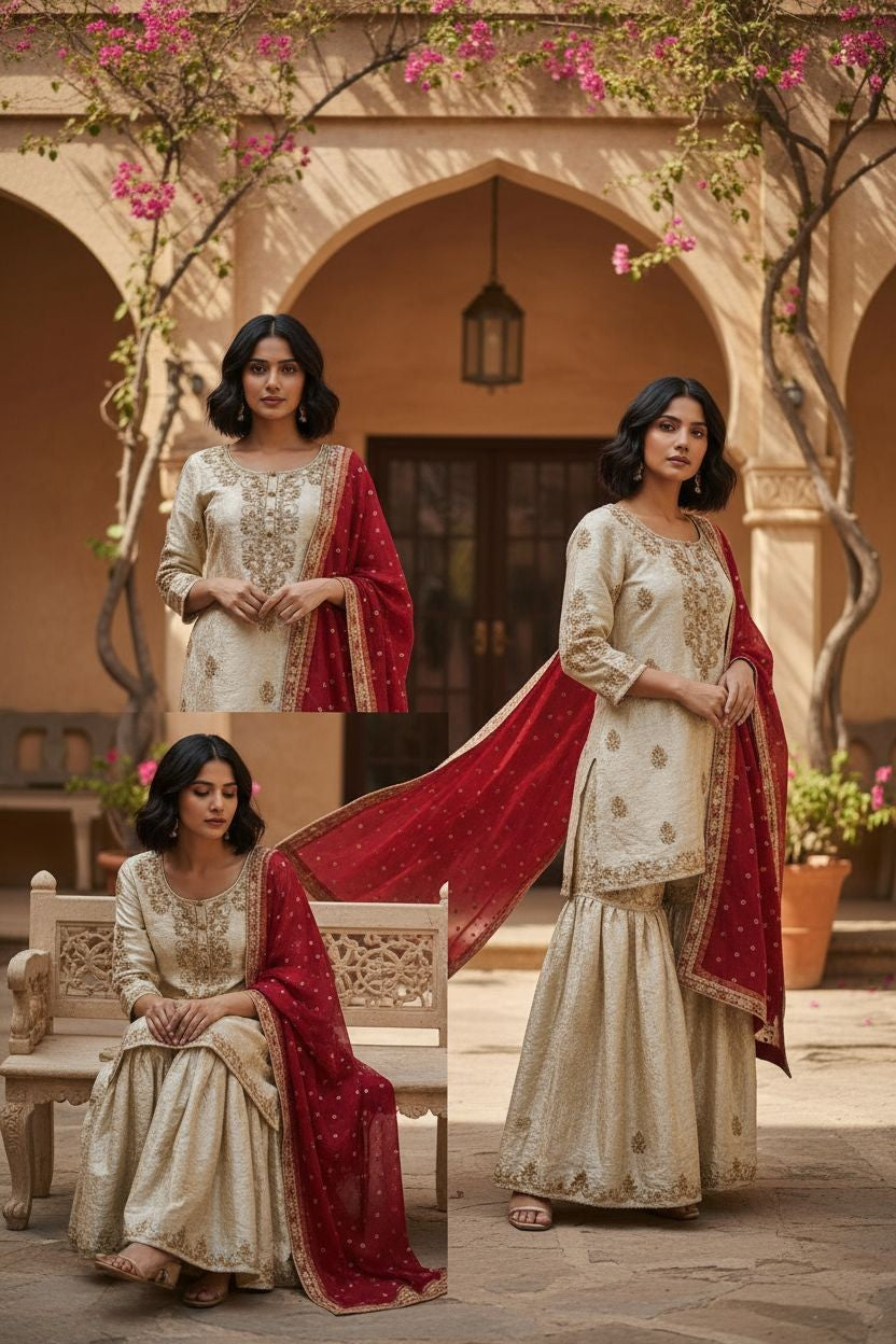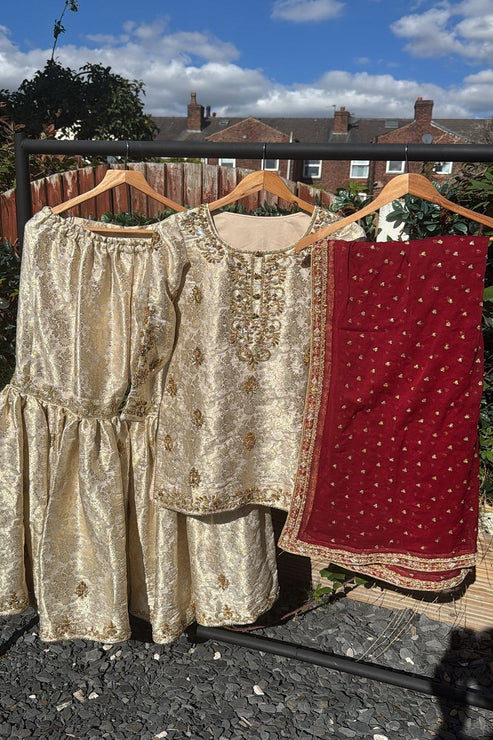 An opulent ensemble crafted in rich gold brocade, adorned with intricate zari and handwork detailing. The kameez features delicate embellishments along the neckline and borders, paired with a flowing gharara for that regal silhouette. Completing the look is a deep crimson dupatta, highlighted with gold sequin sprays and a finely embroidered border — the perfect blend of tradition and sophistication. -