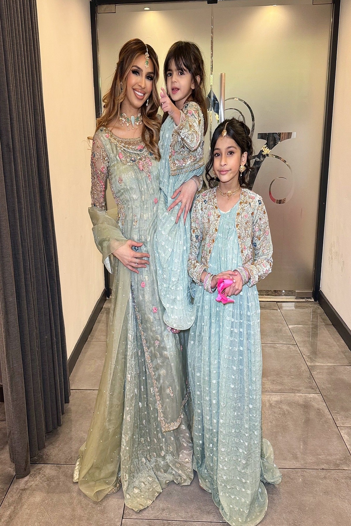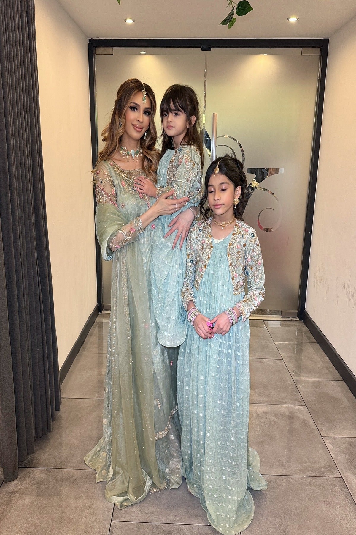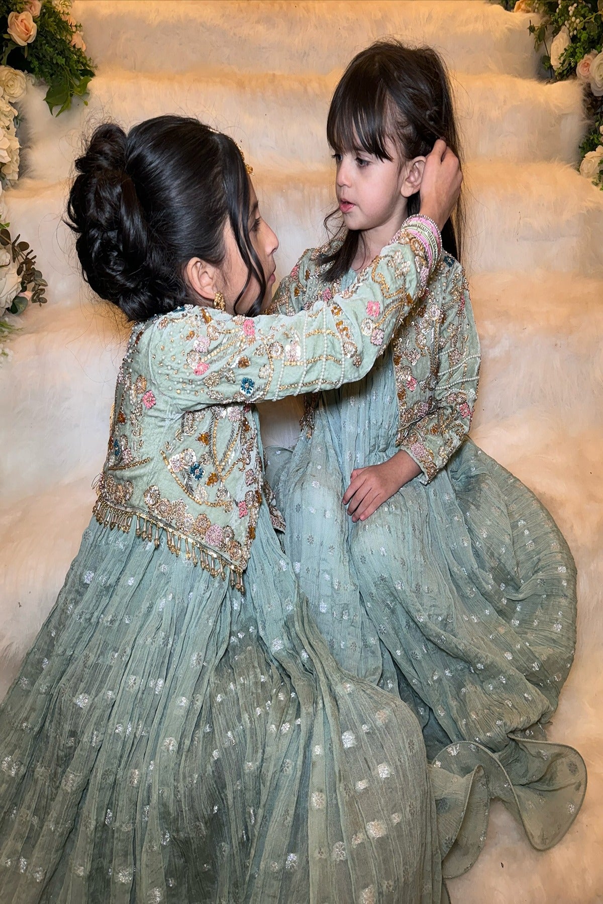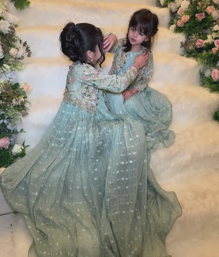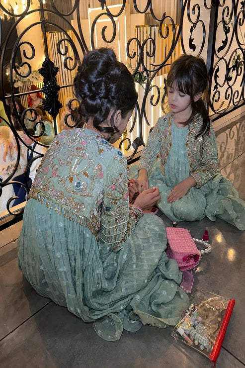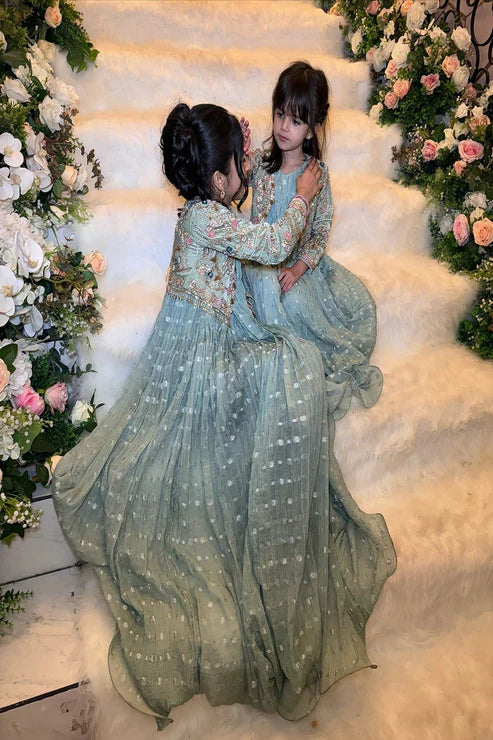 This pastel mint two-piece outfit velvet cropped jackets and crinkled maxi is the perfect blend of charm and elegance for little fashionistas. The flowy dress is designed in premium fabric with delicate resham, zari, and sequin embellishments, creating a soft yet festive look. It is paired with a beautifully embroidered jacket that adds a regal finishing touch. Comfortable yet stylish, this outfit is ideal for weddings, parties, and special occasions, making your little one stand out with grace and sparkle.