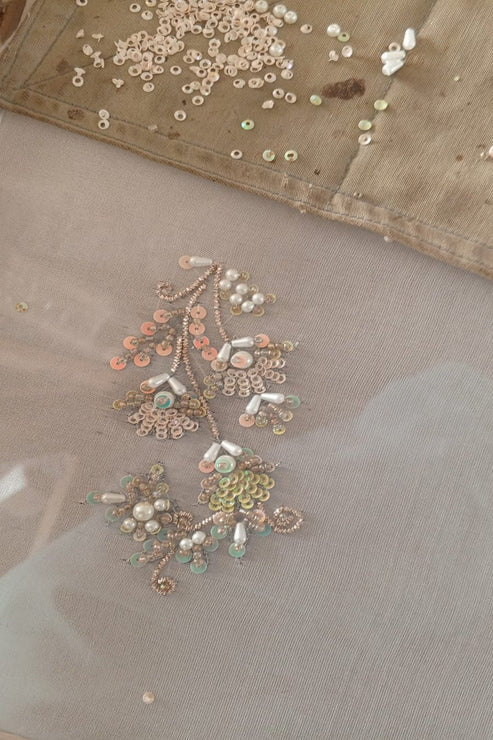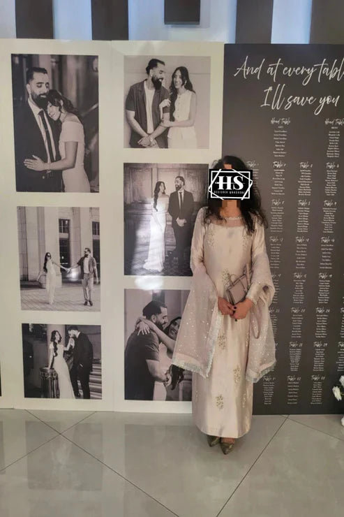 An outfit that exudes grace and sophistication — this elegant three-piece suit is crafted from premium tassel silk and features an exquisitely handworked shirt adorned with dabka, zari, pearls, and sequins. Each detail is intricately placed to create a statement piece, perfect for making an impression at any occasion.