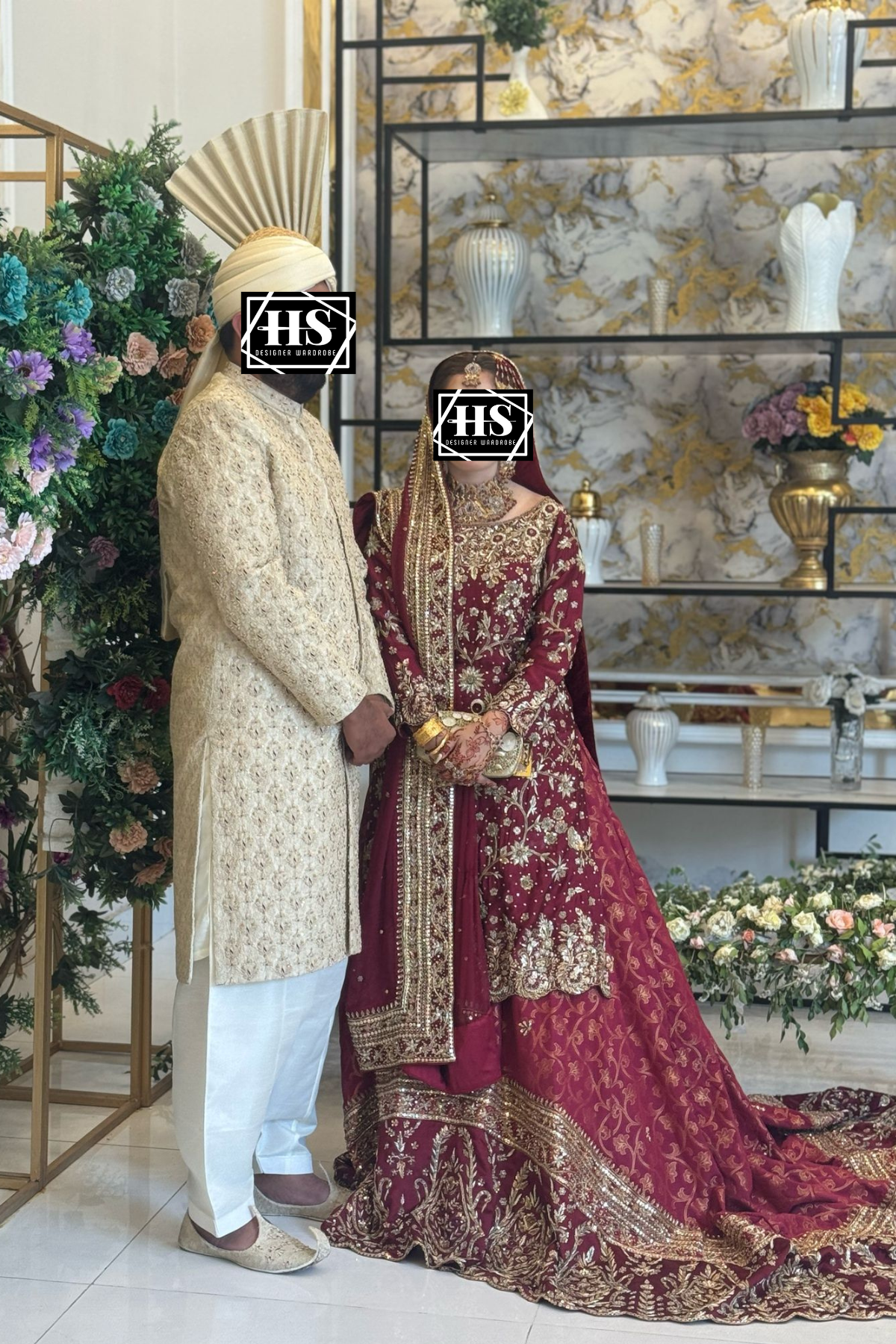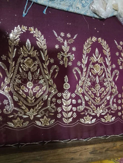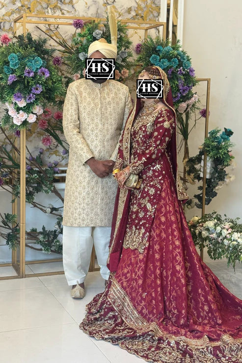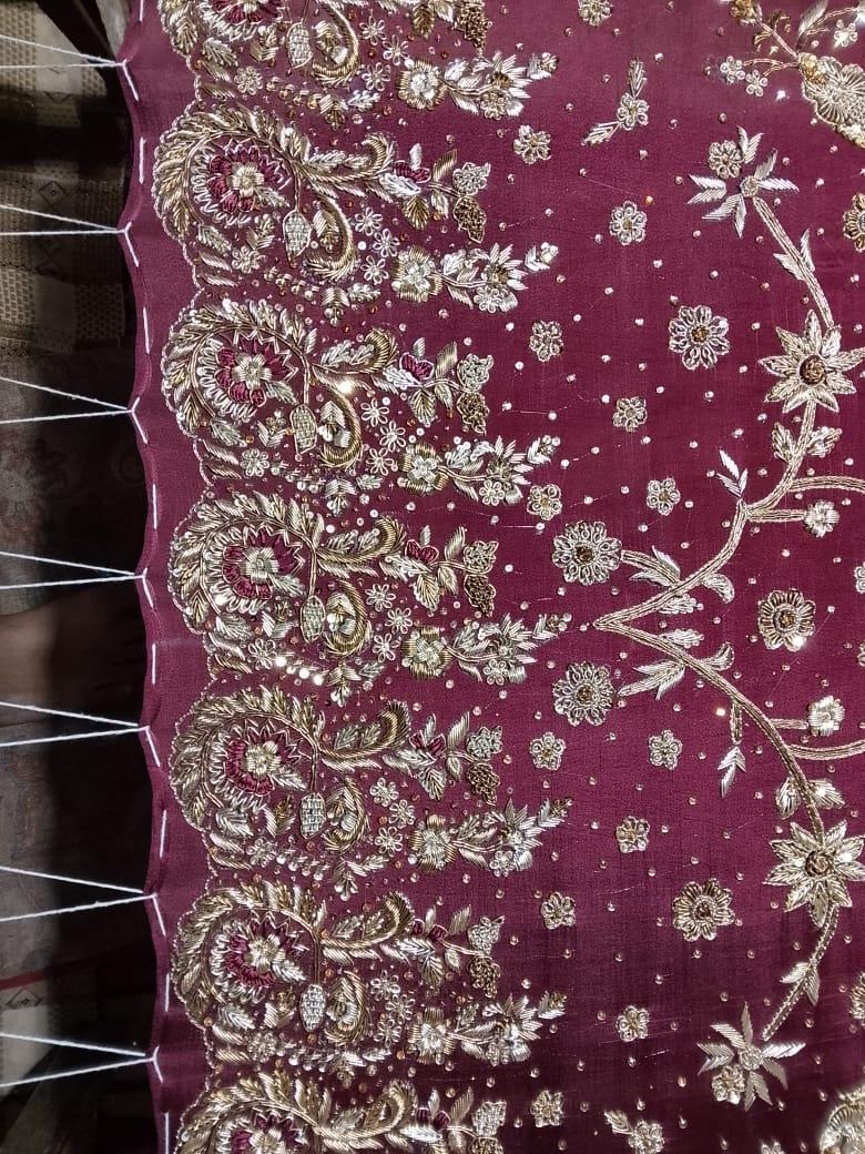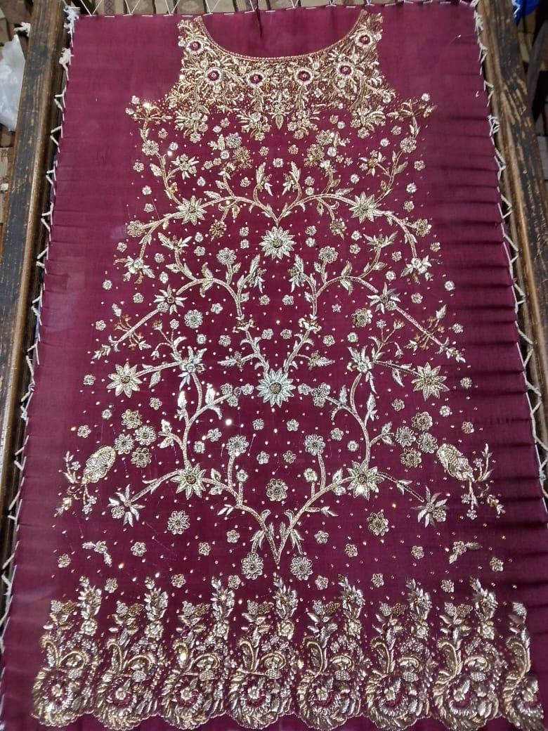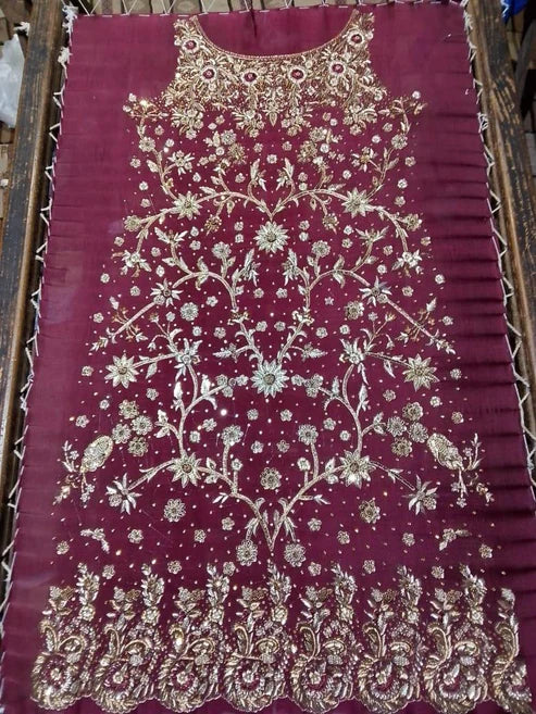 - This exquisite bridal ensemble is crafted on a deep maroon base, brought to life with meticulous handwork in dabka, zari, sequins, resham, and crystal embellishments. The long kameez silhouette is richly adorned with cascading floral vines and ornate trellises, balanced with a heavily worked hem and sleeves.