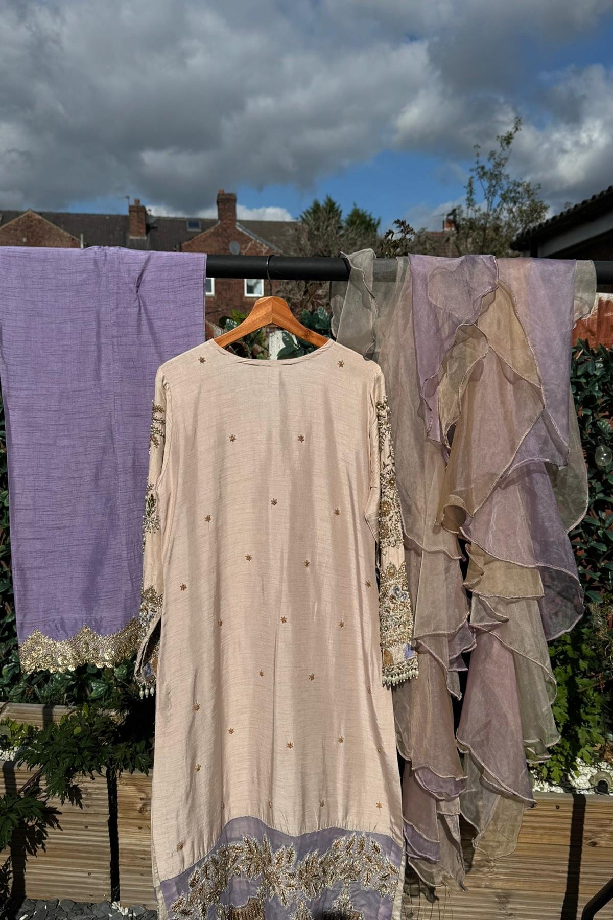 - A soft pink canvas beautifully adorned with intricate hand-embellished motifs, pearls, sequins, and zari detailing. The kameez features a regal neckline and statement borders finished with lilac accents, adding a touch of subtle charm. Paired with a lilac trouser for balance and a dreamy organza dupatta in ombré tones with layered ruffles — this look is the perfect harmony of sophistication and modern flair.