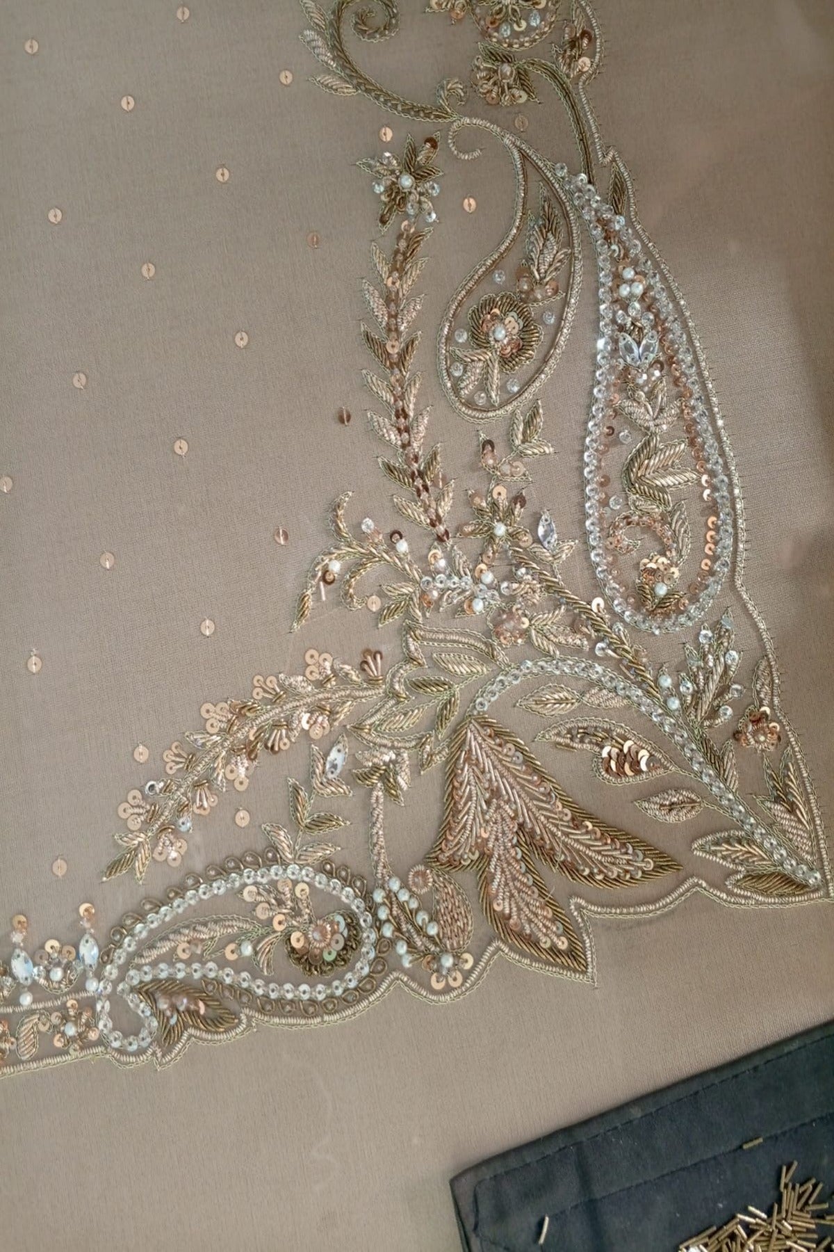 An elegant three-piece ensemble featuring a luxurious tassel silk kameez, beautifully adorned with heavy dabka, zari, pearl, and sequin handwork around the neckline, daman, and sleeves, complemented by a delicate scattered spray of embellishments across the front.