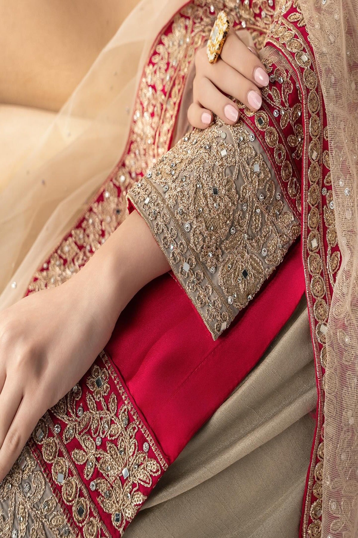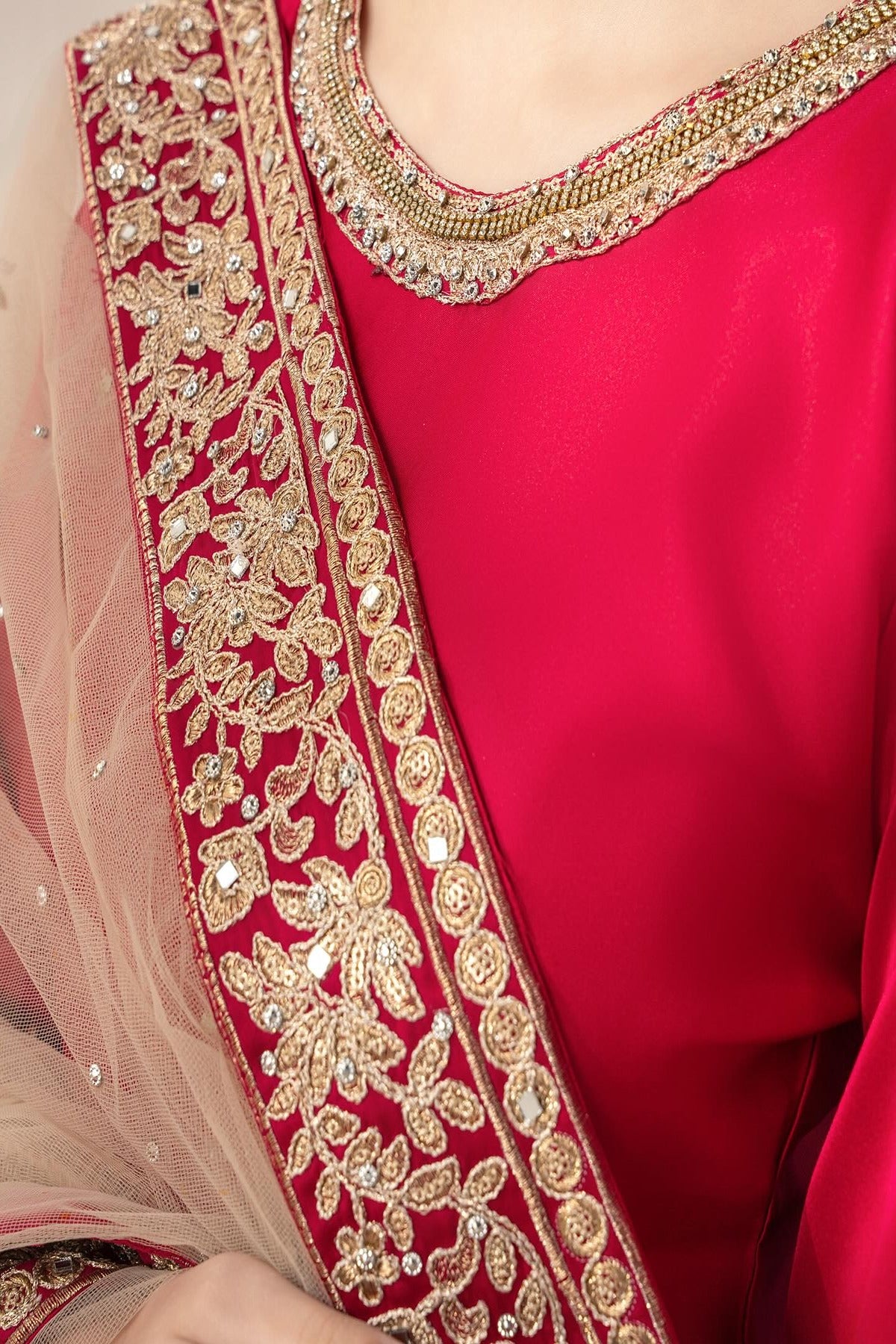 The centerpiece of this ensemble is the rich crimson red kameez, designed with a classic round neckline and full sleeves. The simplicity of the kameez is elevated by intricate beige threadwork along the neckline, cuffs, and hem. The threadwork embroidery features zari work in floral and vine motifs, embellished with sequins and mirror-work. The beige trousers provide the perfect contrast to the vibrant kameez, featuring a straight cut and embroidery along the hem. The ensemble is completed with a beige net dupatta with red embroidered borders and scattered sequins.