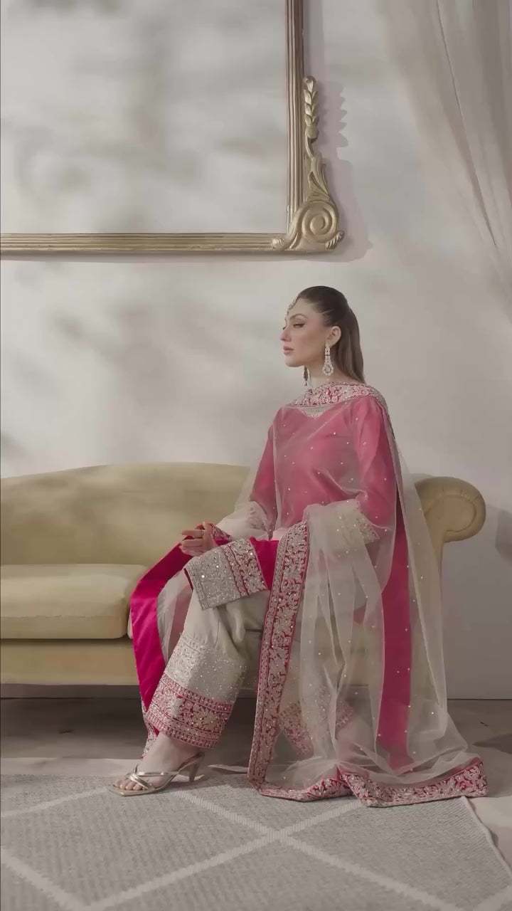 Introducing “Lalee”, a bold and timeless ensemble in stunning red and beige. This ensemble features a short kameez and straight trousers.