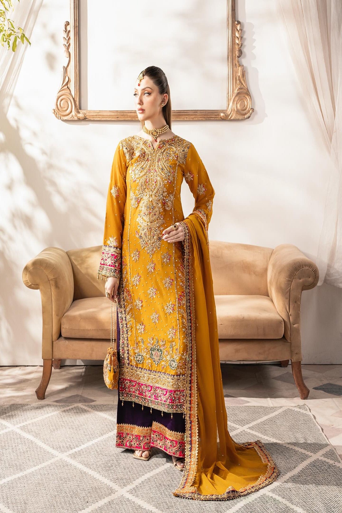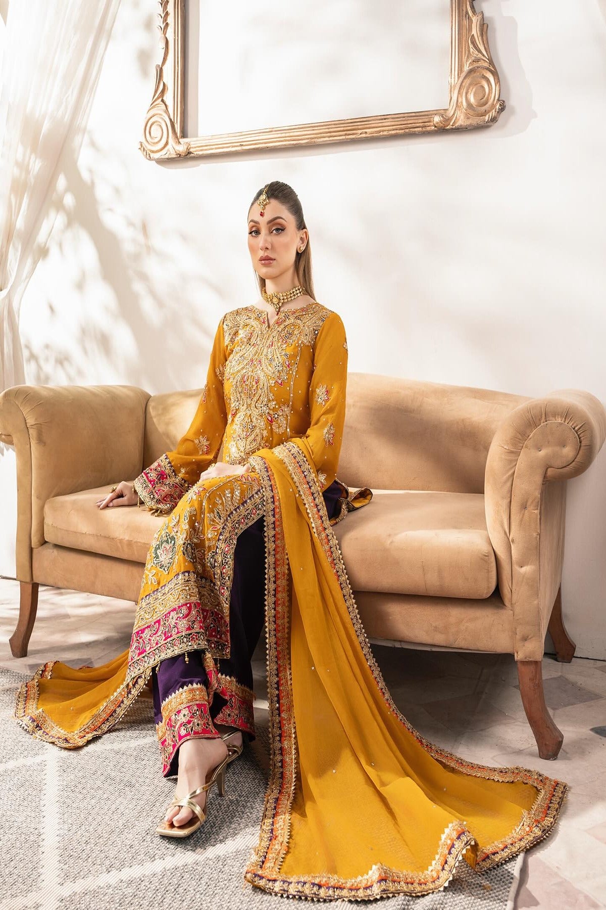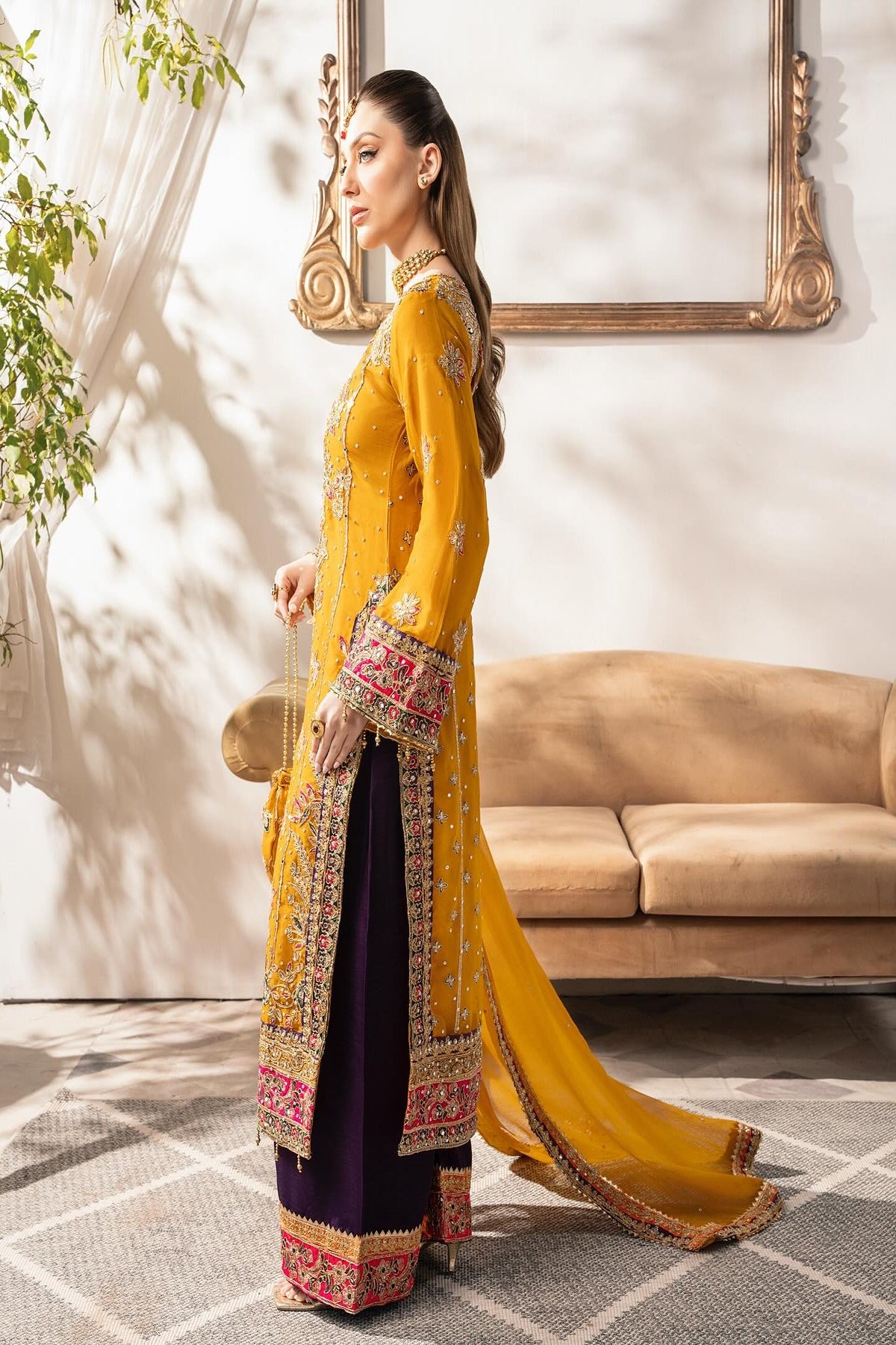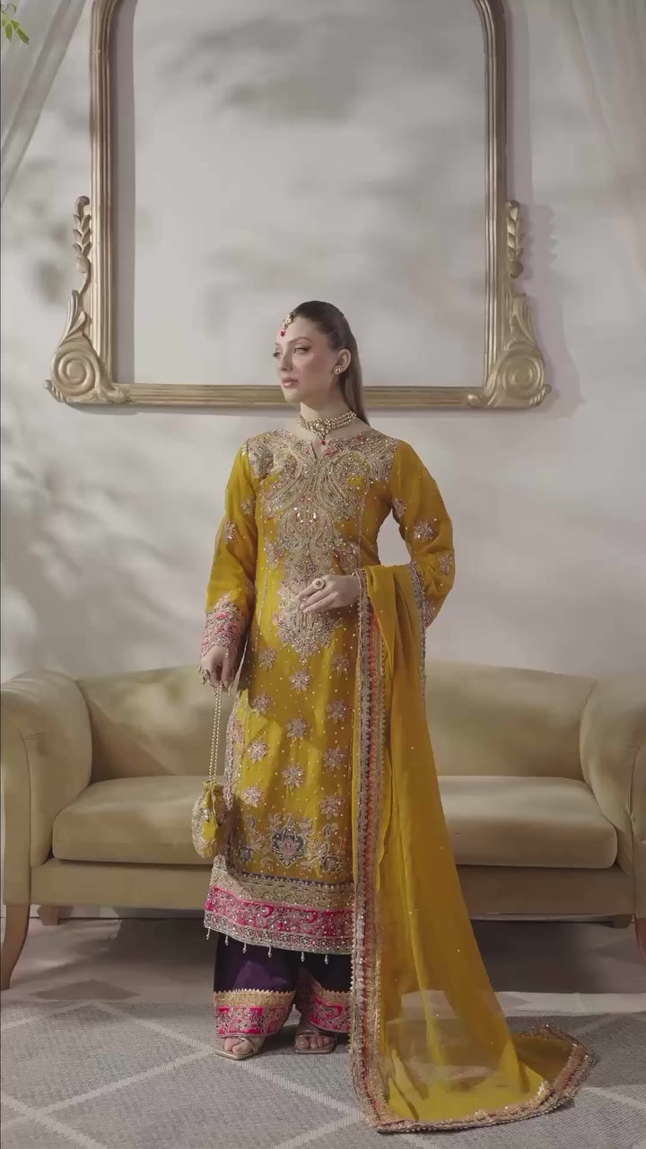 The mustard kameez is a masterpiece, richly adorned with exquisite embroidery and embellishments featuring shimmering zari work, resham threadwork, sequins, and beads Delicate floral motifs are artfully spread across the bodice and sleeves, with a grand and ornate border at the hemline that adds a luxurious touch. The kameez is heavily embellished, and scattered floral motifs all across, with a subtle hint of hot pink and violet on the hem, neckline and cuffs. Paired with the kameez are striking violet wide trousers, embellished with intricate detailing at the hem with a contrasting pop of color to the ensemble. The violet tone beautifully complements the mustard. Completing the look is a chiffon dupatta in mustard, delicately adorned with an embroidered border in violet and orange and scattered sequins throughout.