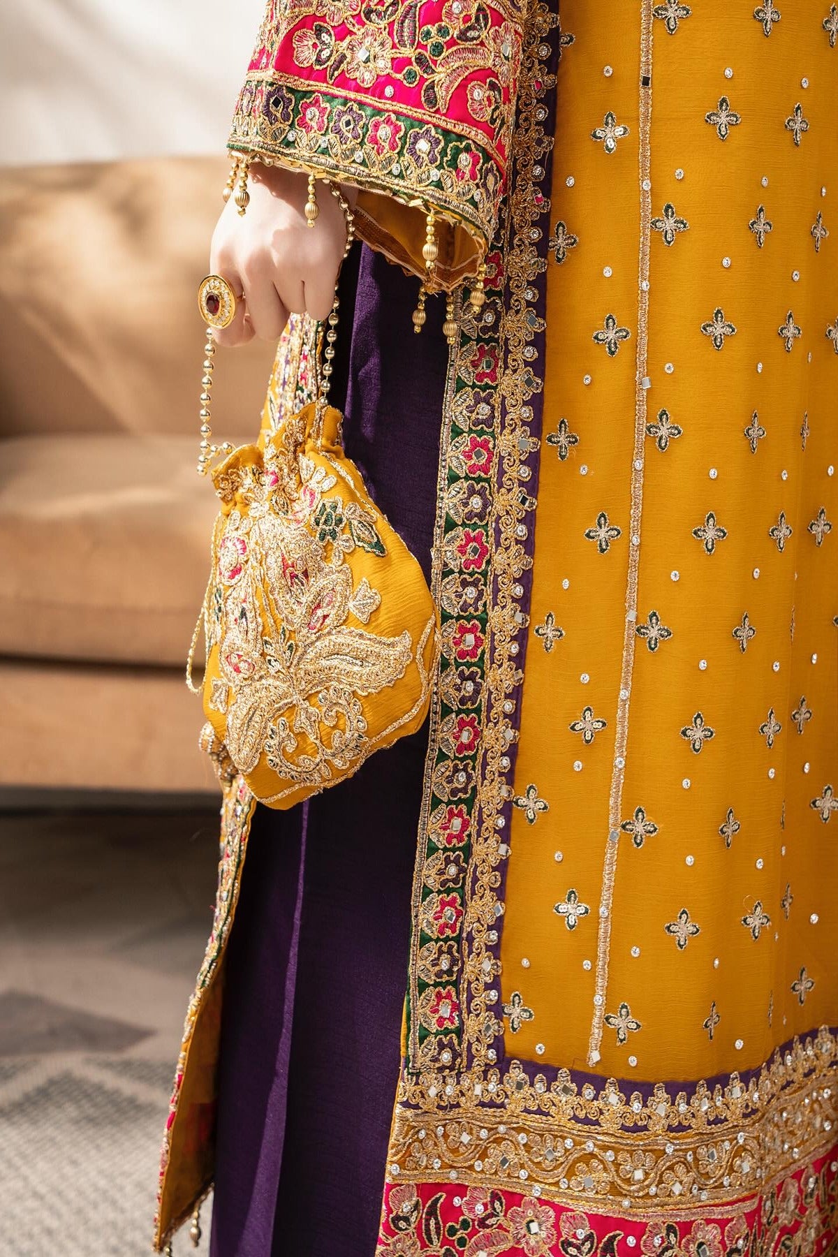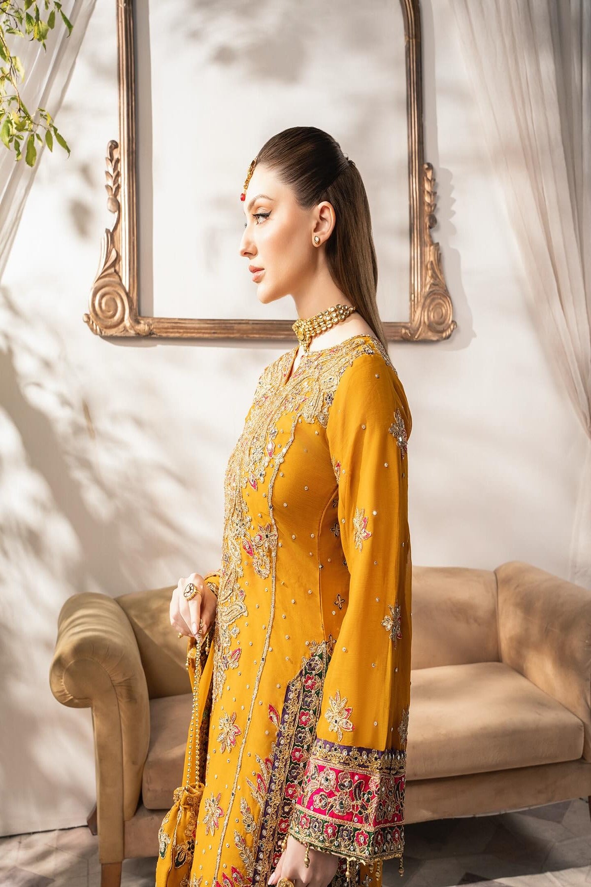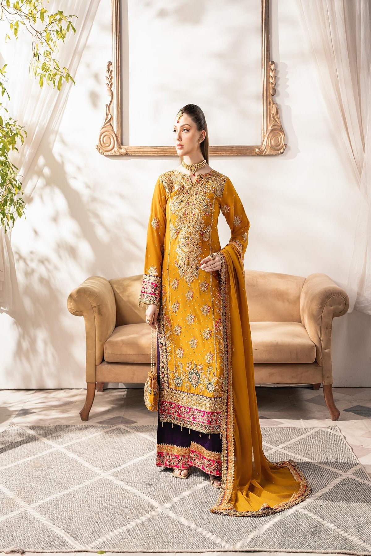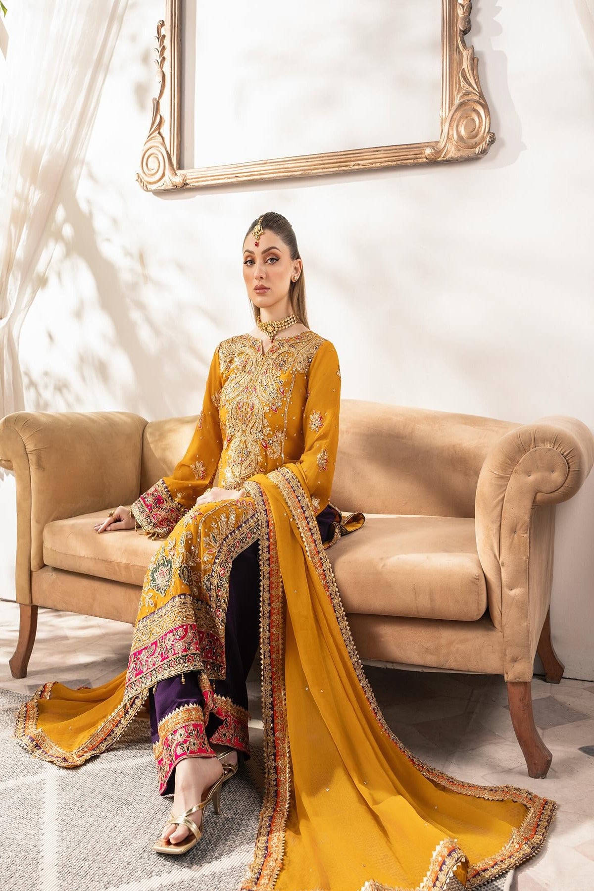 The mustard kameez is a masterpiece, richly adorned with exquisite embroidery and embellishments featuring shimmering zari work, resham threadwork, sequins, and beads Delicate floral motifs are artfully spread across the bodice and sleeves, with a grand and ornate border at the hemline that adds a luxurious touch. The kameez is heavily embellished, and scattered floral motifs all across, with a subtle hint of hot pink and violet on the hem, neckline and cuffs. Paired with the kameez are striking violet wide trousers, embellished with intricate detailing at the hem with a contrasting pop of color to the ensemble. The violet tone beautifully complements the mustard. Completing the look is a chiffon dupatta in mustard, delicately adorned with an embroidered border in violet and orange and scattered sequins throughout.