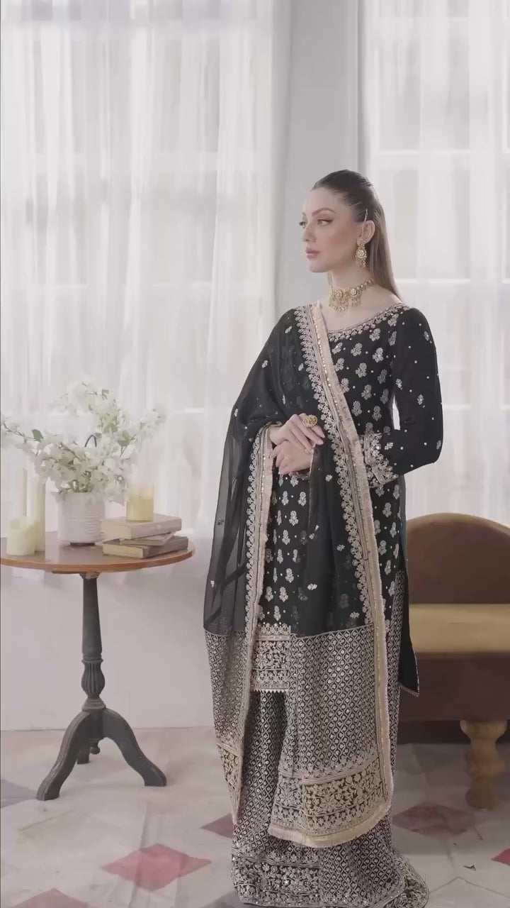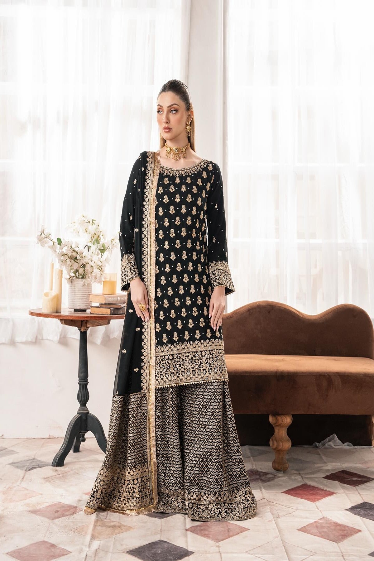 The rich black kameez is adorned with intricate golden embroidery, featuring delicate motifs scattered across the kameez. The neckline and cuffs are beautifully embellished with ornate detailing and golden embroidery. The embroidery features delicate zari work and resham threadwork with stunning embellishments of sitara work. The kameez is paired with a striking embroidered sharara with mesmerizing geometric and floral patterns in golden threadwork. The ensemble is completed with a matching dupatta, heavily embroidered with golden borders and scattered motifs.