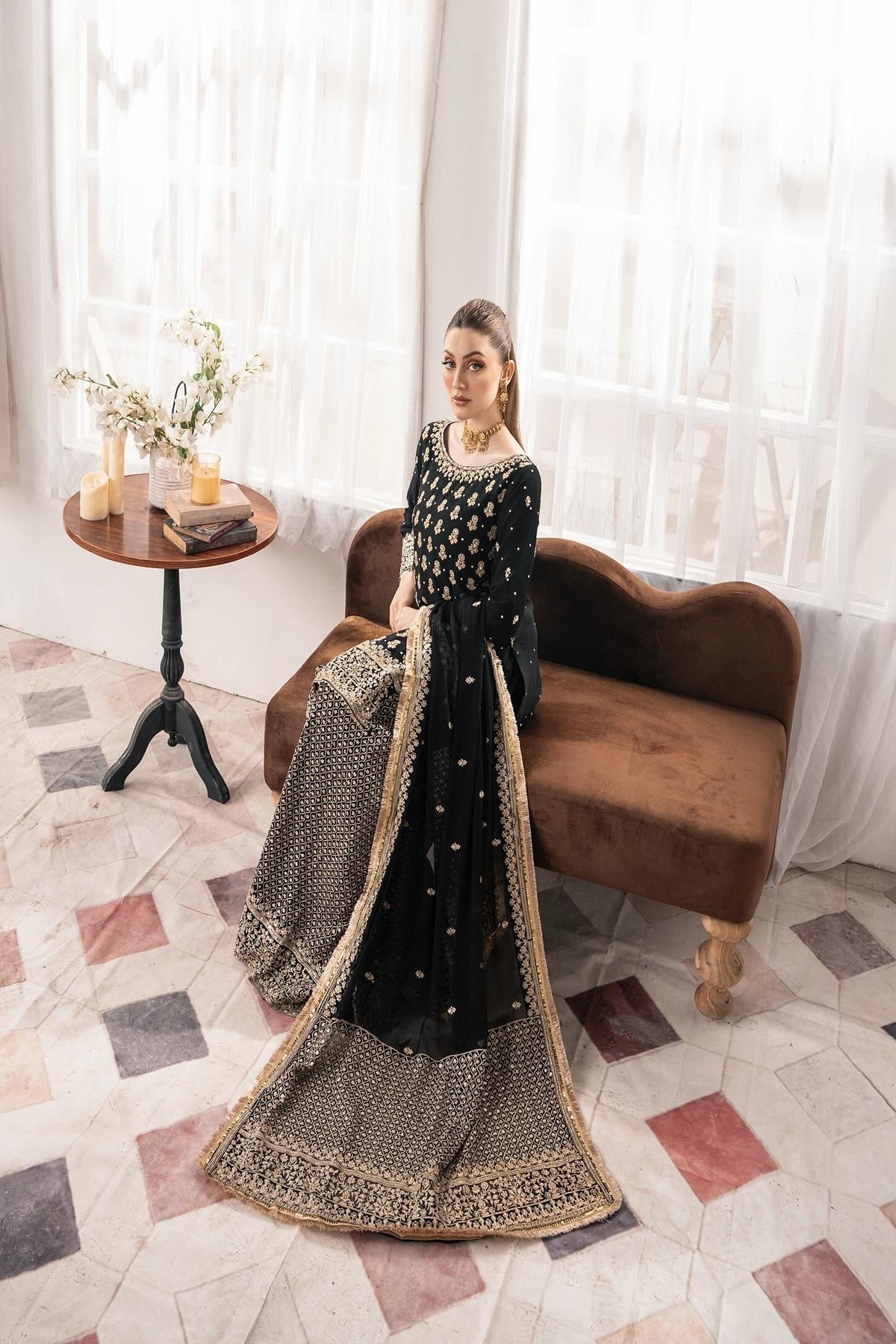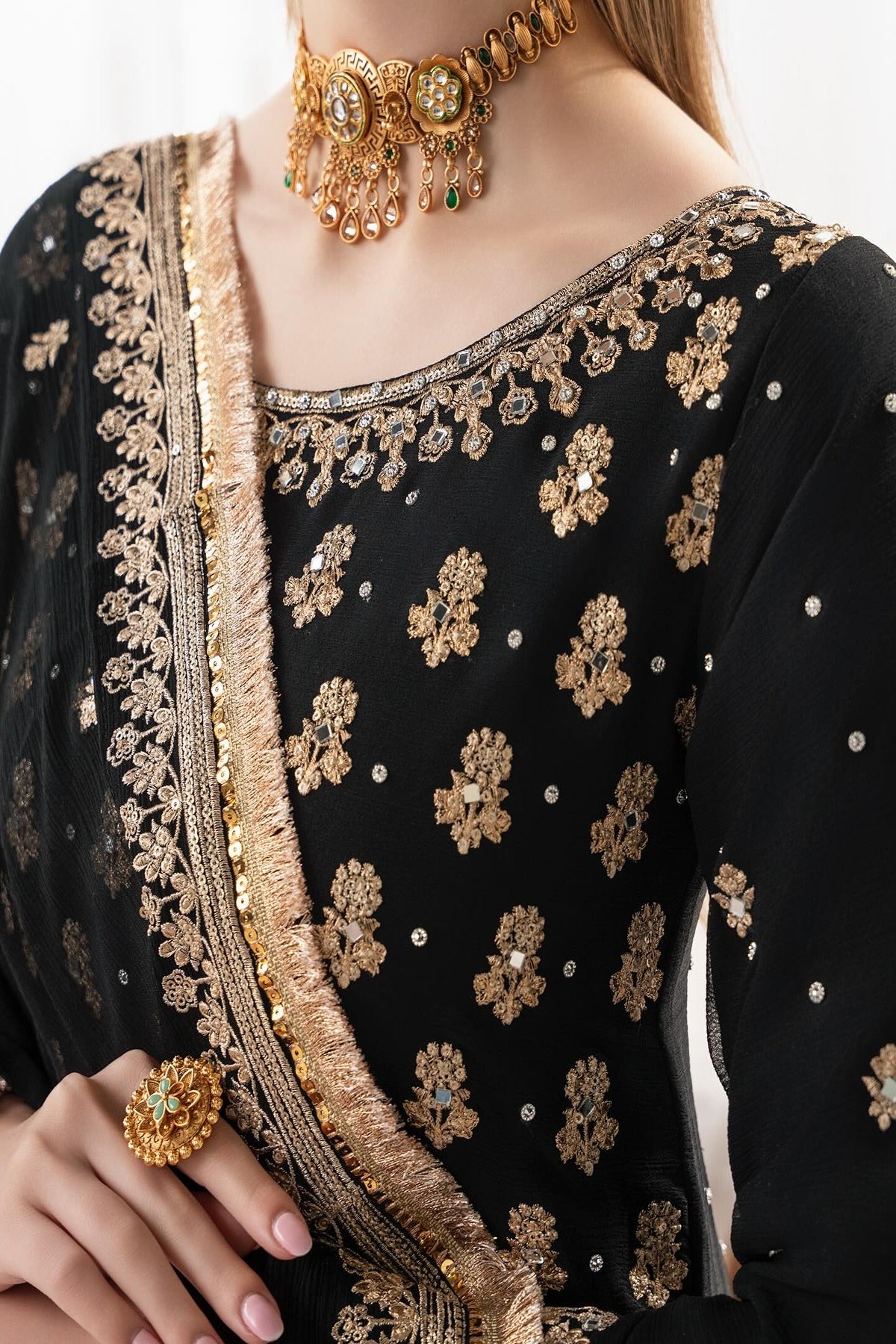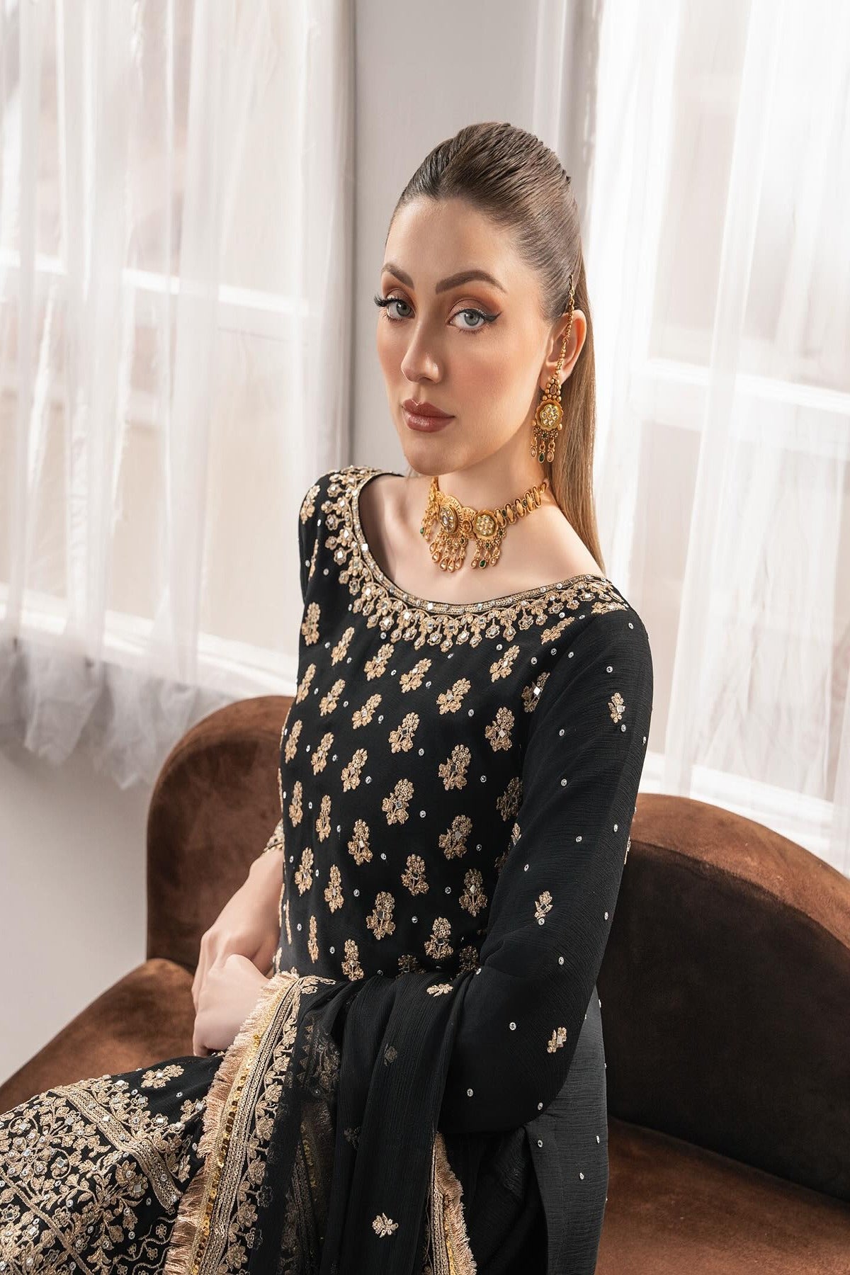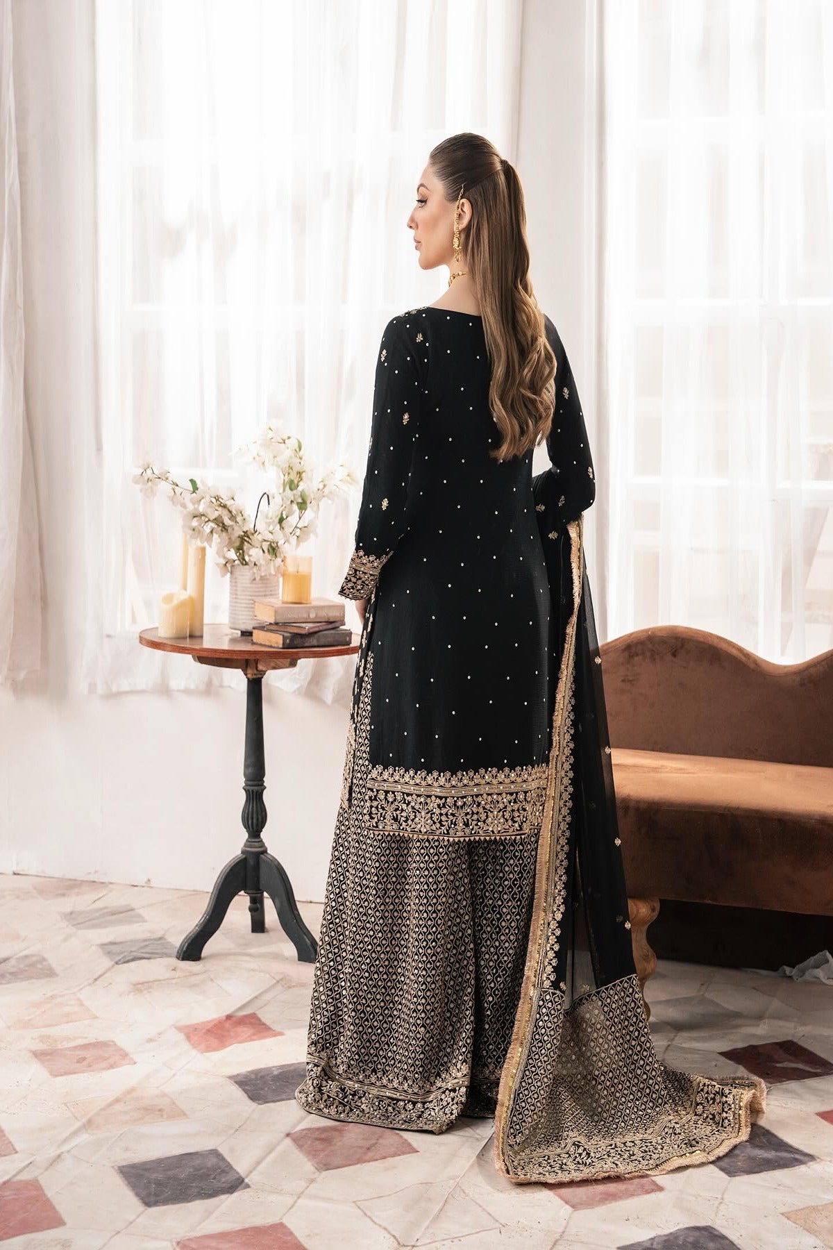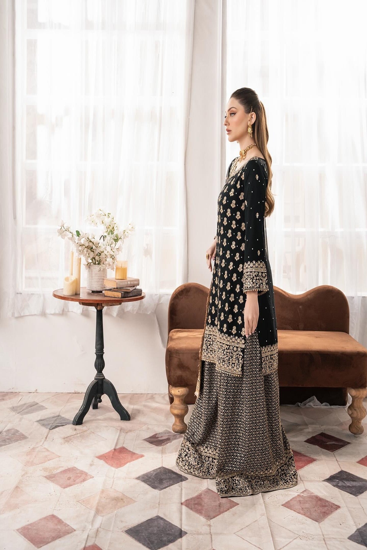 “Madiha”, an elegant black-and-gold ensemble featuring a short kameez and a flowy