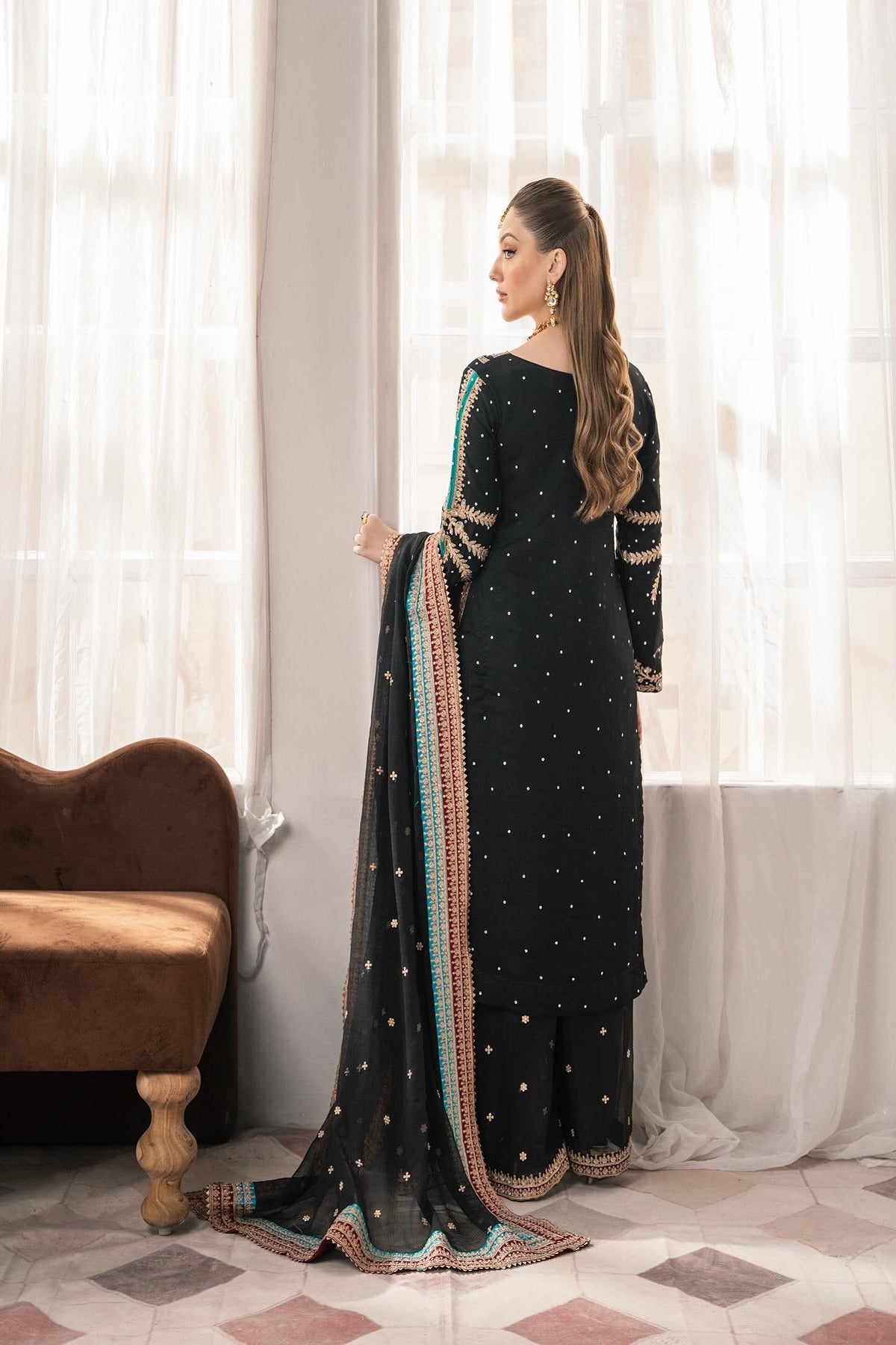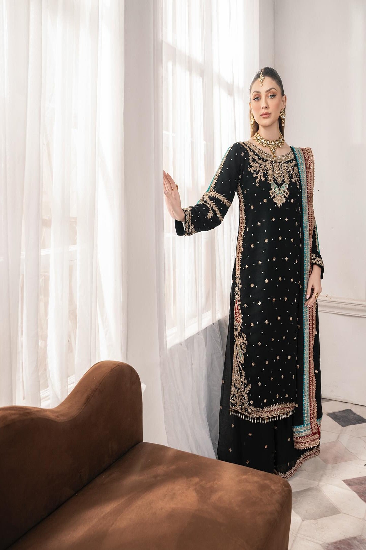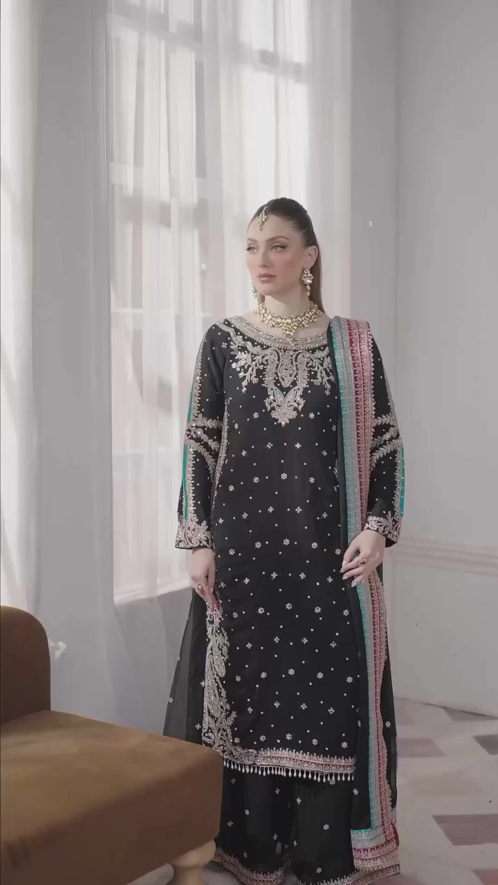 Introducing “Sadiya”, an exquisite black ensemble featuring a long kameez with wide-legged trousers.