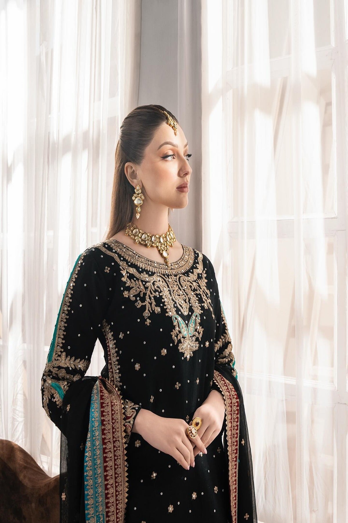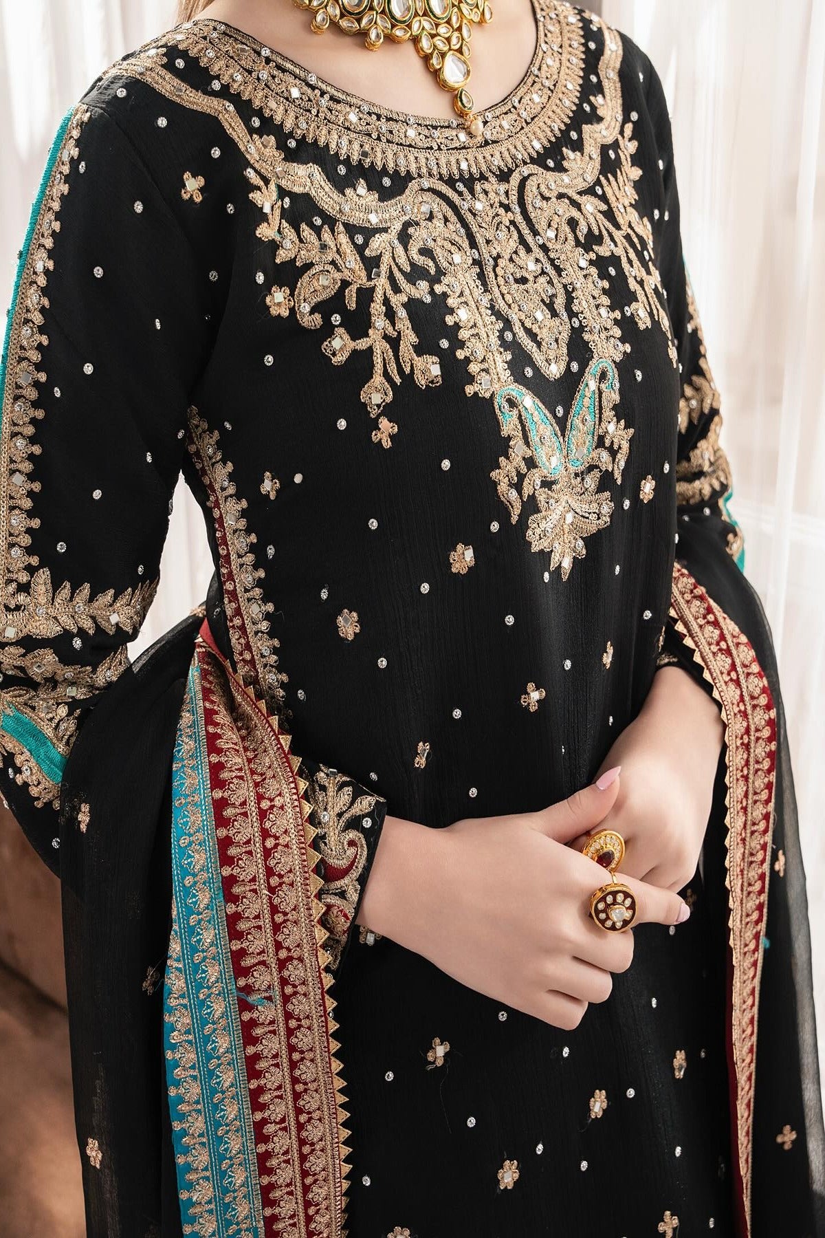 The long black kameez strikes the perfect balance between grace and comfort. The intricate embroidery steals the spotlight with golden and silver accents adorning the neckline, sleeves, and hem. The embroidery forms a combination of floral vines and geometric patterns in delicate zari work and sequin embellishment. The sleeves are embroidered in the same motifs as the kameez with a hint of teal and red hues. The front of the kameez is adorned by small floral motifs and sequins with dangling pearls at the hem. The kameez is paired with matching black wide-legged trousers with an embroidered hem and small scattered floral motifs. The ensemble is completed by a black chiffon dupatta with teal and red embroidered borders and scattered sequins all over.