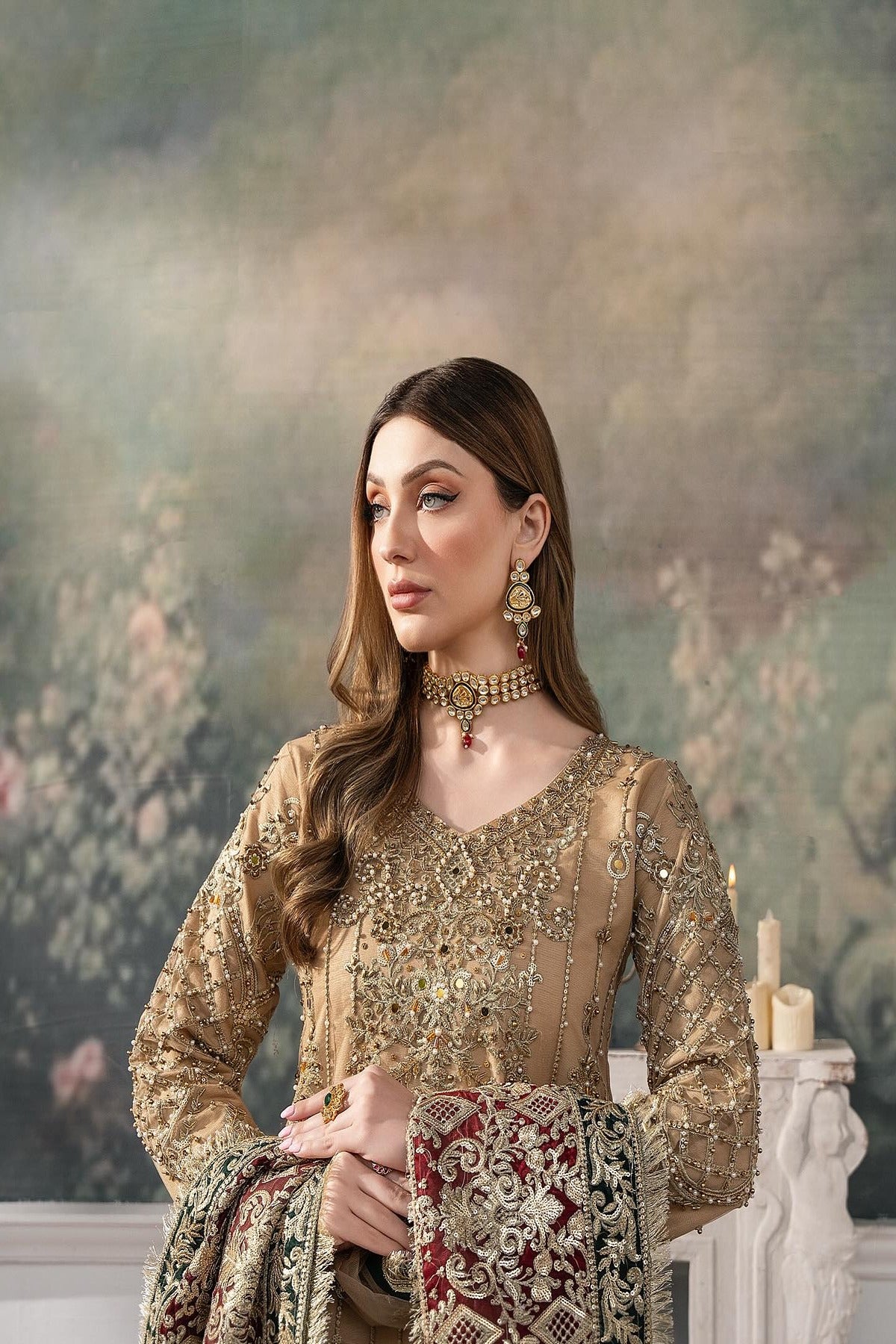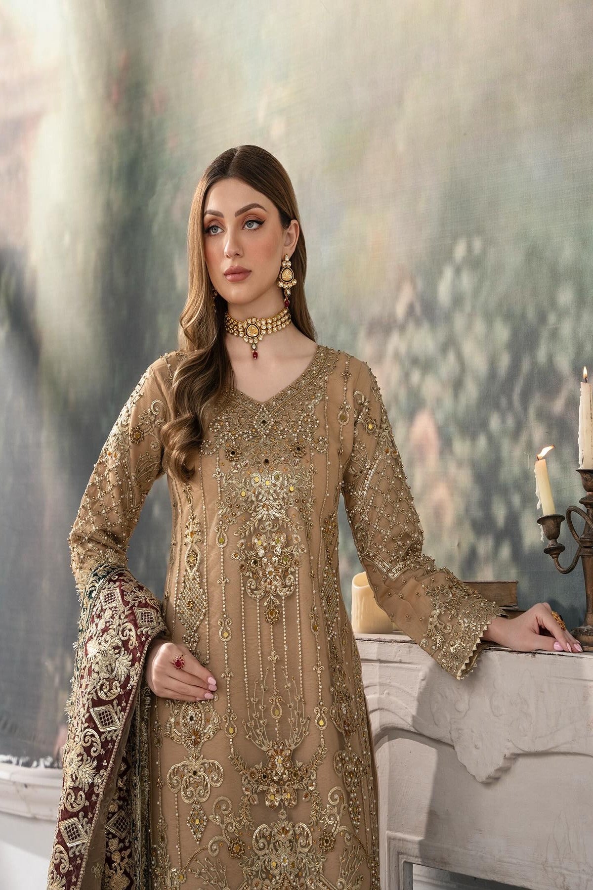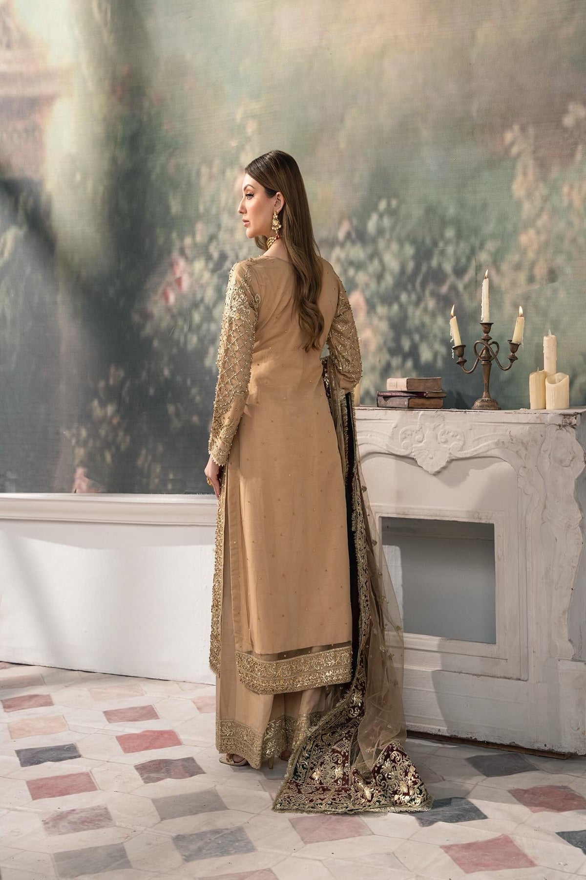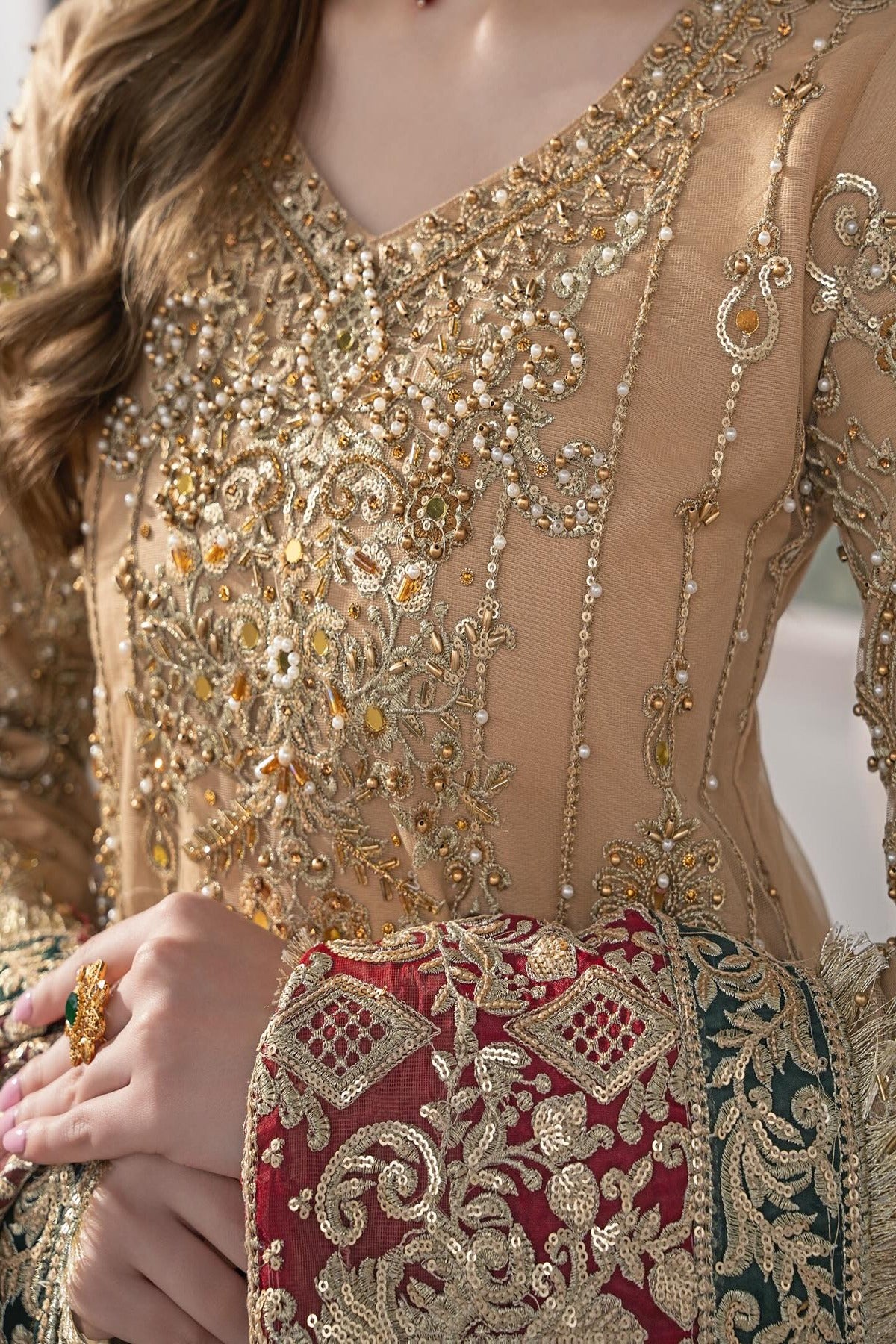 The kameez is made in a warm beige hue and is adorned with exquisite threadwork and embellished details. Gold and champagne threads intertwine and create elaborate floral and paisley patterns, giving a vintage vibe. The embroidery is further accentuated with shimmering sequins, beads, and pearls. The rich embroidery features a combination of zari work, resham threadwork, sitara work, and beadwork in a unique design. The trousers, in matching beige, are made to perfection with subtle sequin embellishments and embroidery along the hem Completing the ensemble is the gorgeous dupatta, made from sheer fabric featuring an intricately embroidered maroon and green border with golden threadwork and sparkling accents. The contrast of the deep maroon against the beige ensemble creates a striking visual appeal.