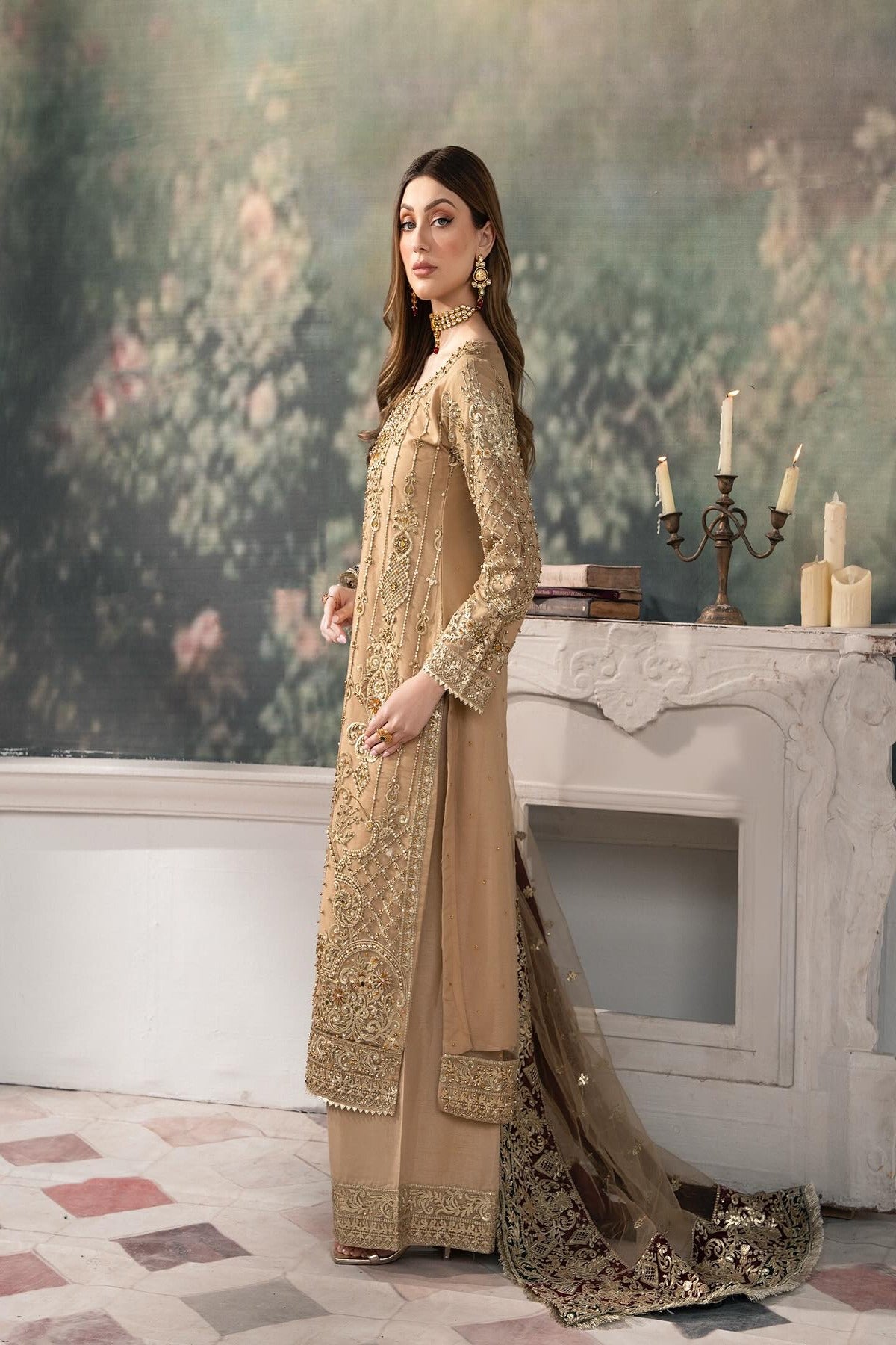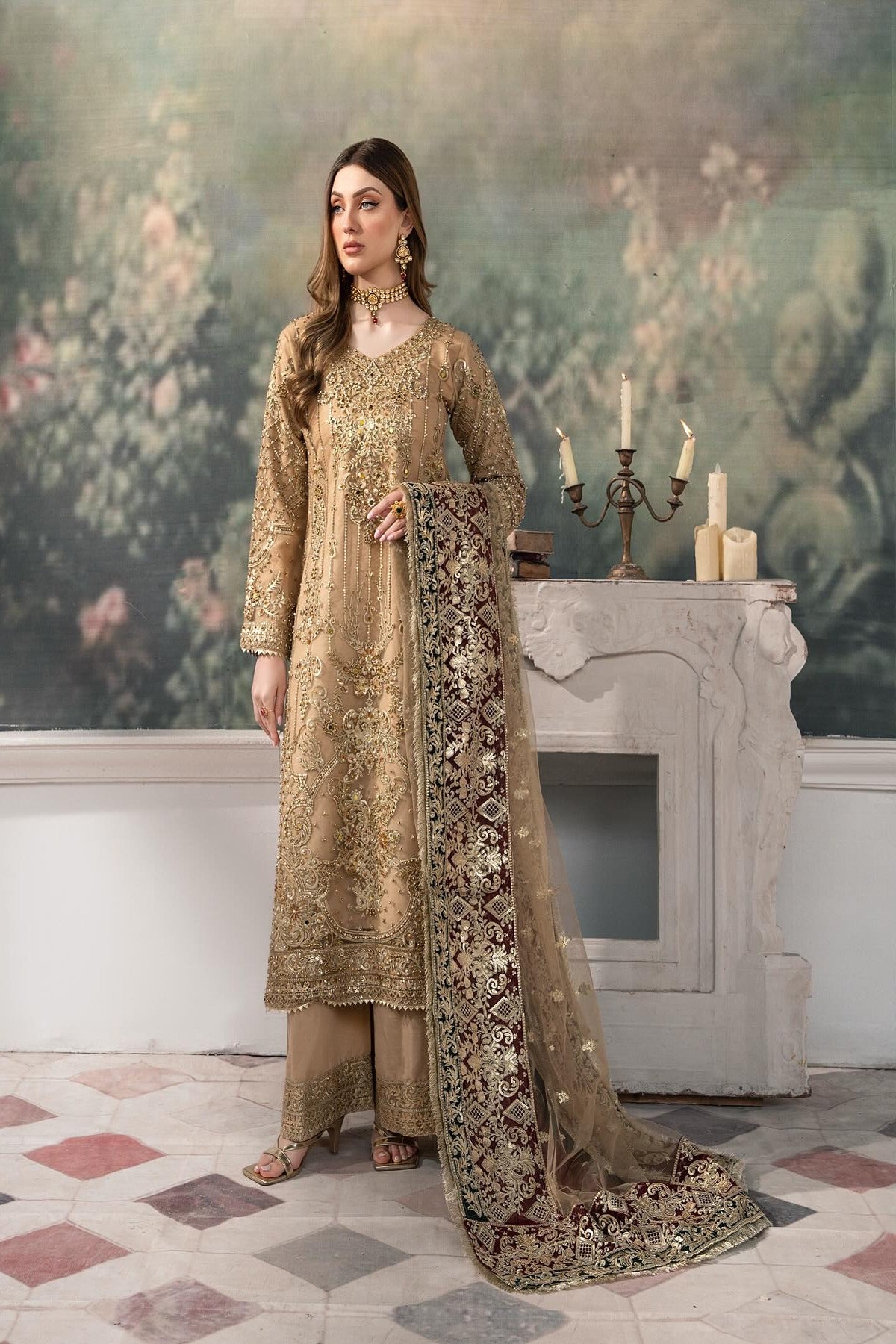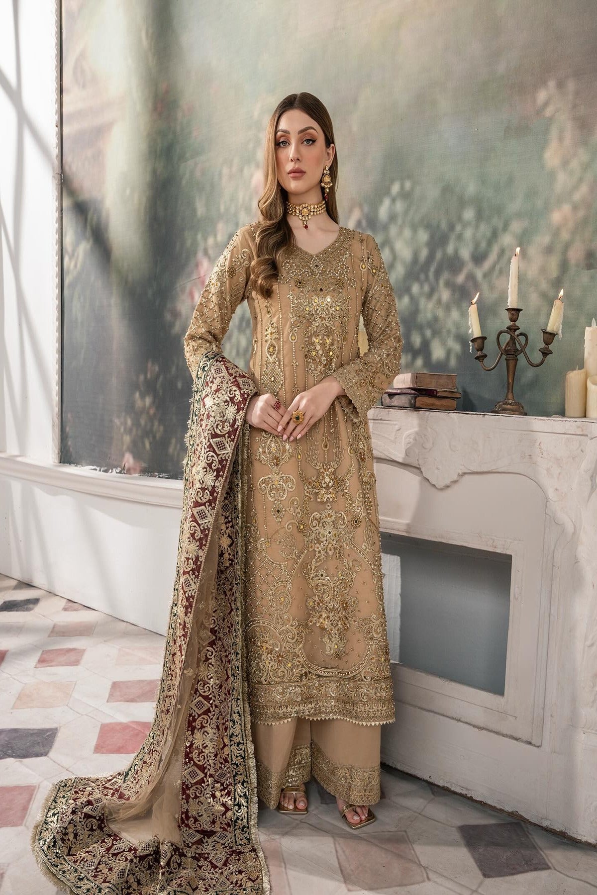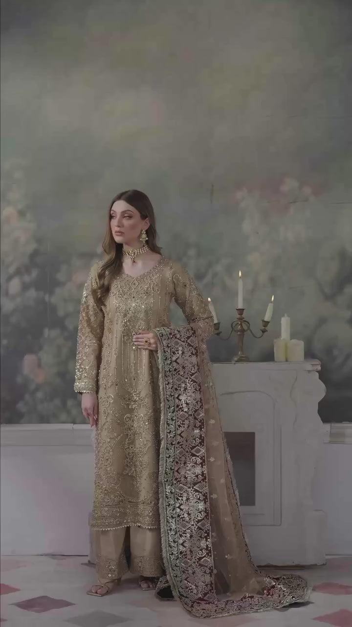 The kameez is made in a warm beige hue and is adorned with exquisite threadwork and embellished details. Gold and champagne threads intertwine and create elaborate floral and paisley patterns, giving a vintage vibe. The embroidery is further accentuated with shimmering sequins, beads, and pearls. The rich embroidery features a combination of zari work, resham threadwork, sitara work, and beadwork in a unique design. The trousers, in matching beige, are made to perfection with subtle sequin embellishments and embroidery along the hem Completing the ensemble is the gorgeous dupatta, made from sheer fabric featuring an intricately embroidered maroon and green border with golden threadwork and sparkling accents. The contrast of the deep maroon against the beige ensemble creates a striking visual appeal.