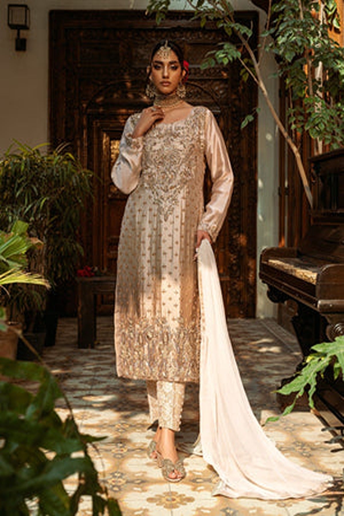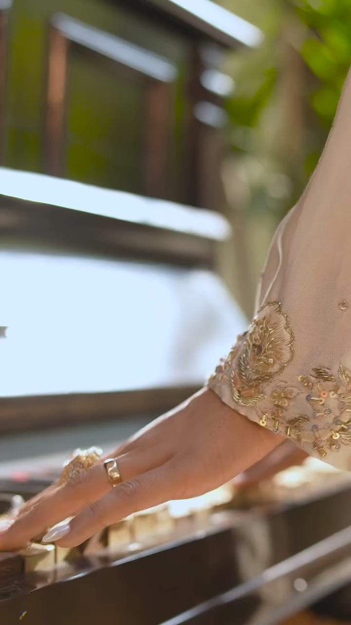 Introducing “Ansa”, a champagne-hued ensemble that radiates sophisticated charm. This ensemble features a long kameez with straight trousers.