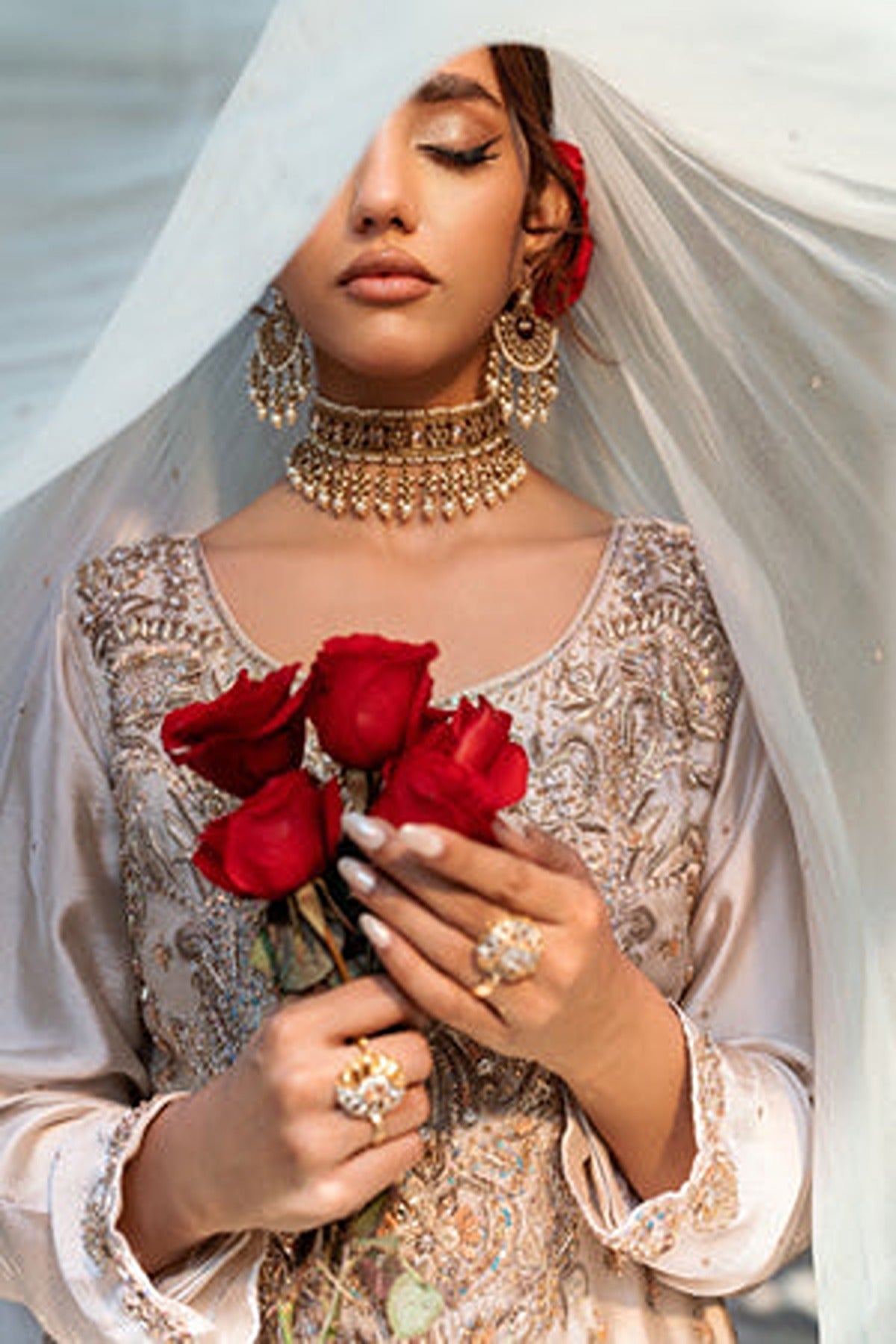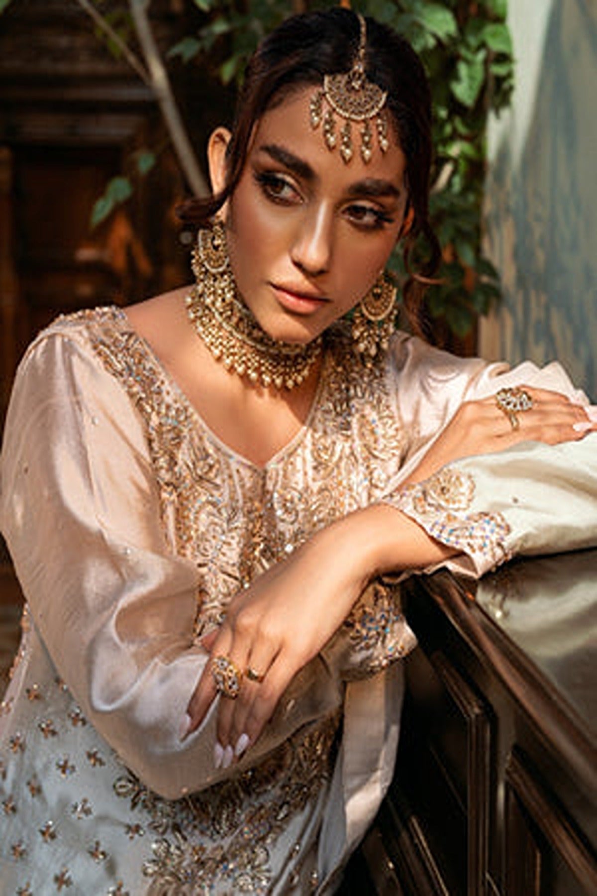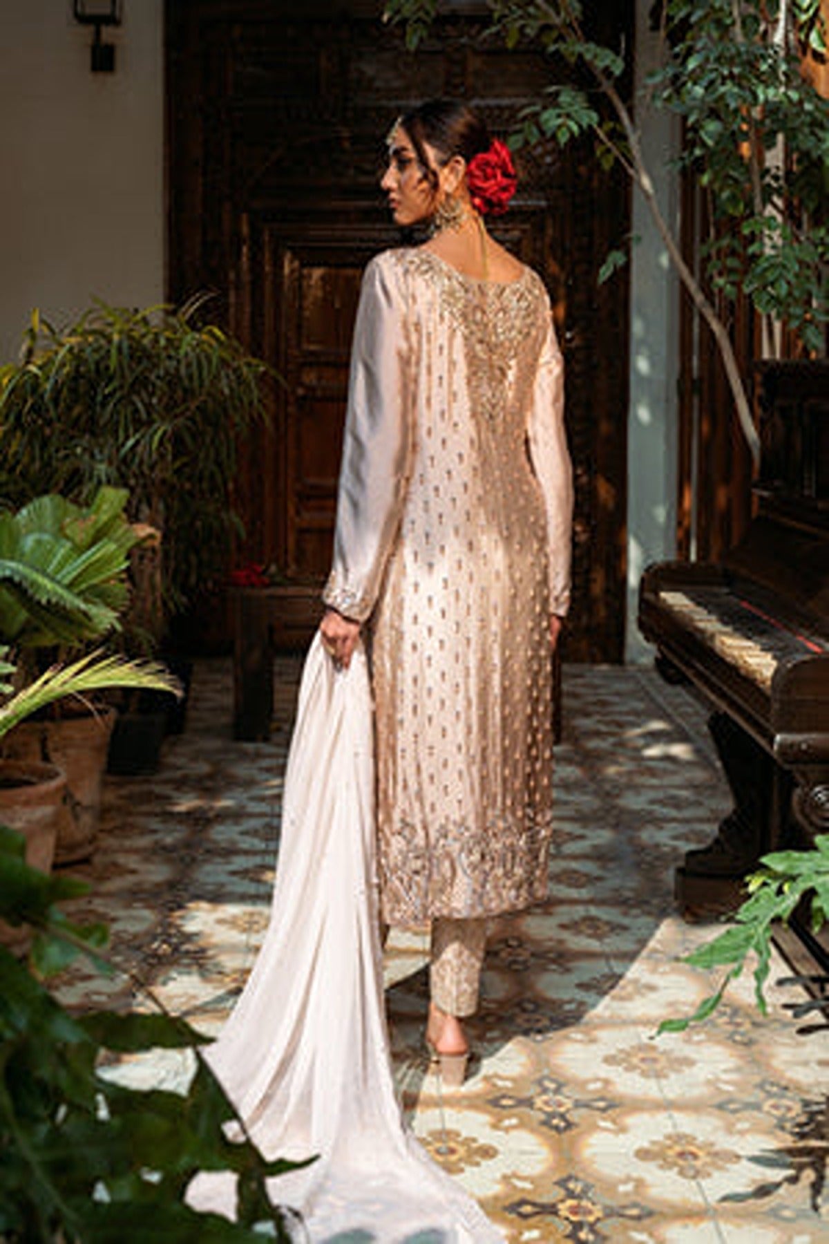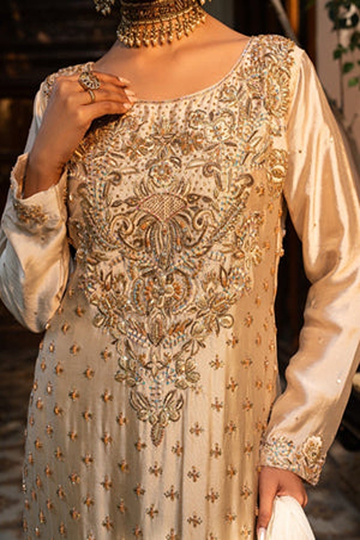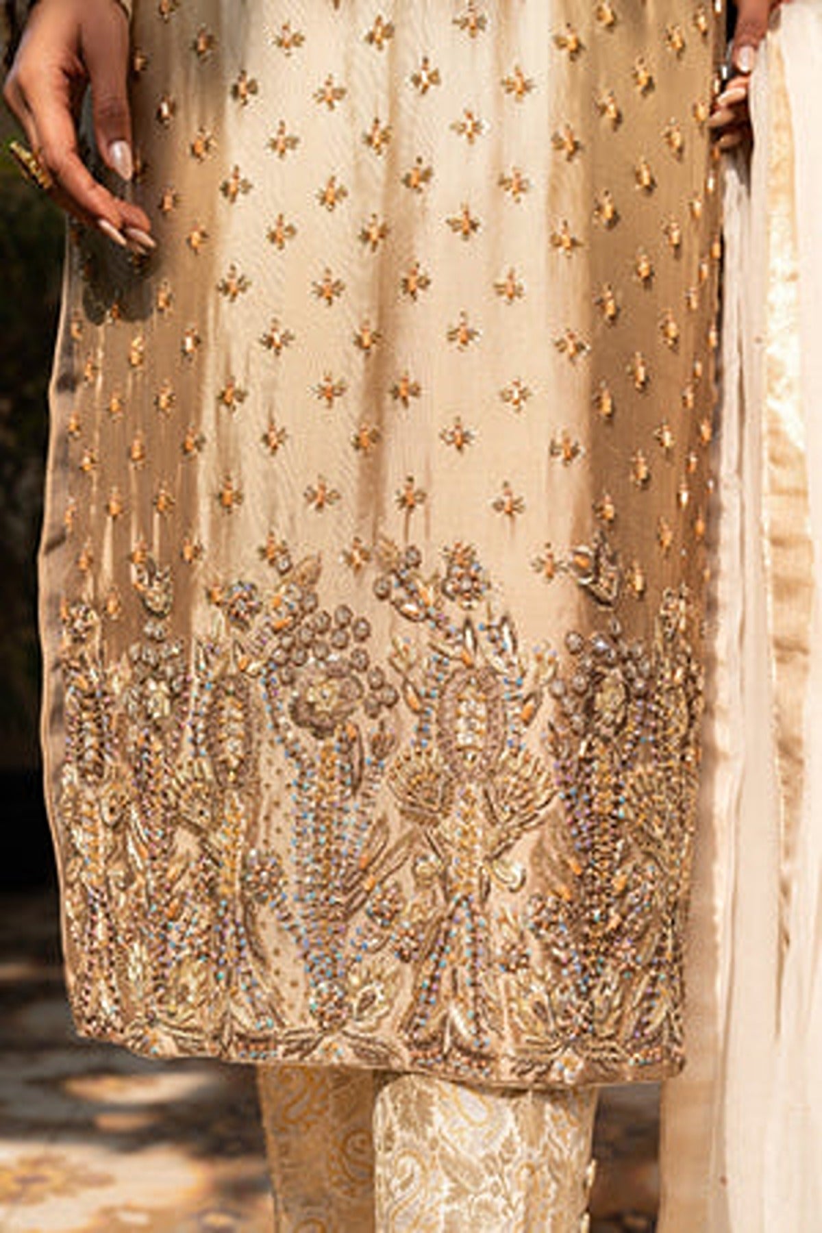 The straight-cut kameez is made in a gorgeous satin fabric that beautifully reflects light. The front of the shirt is a canvas for breathtakingly detailed hand embroidery, featuring a blend of zari, sequins, pearls, and resham threadwork. The embroidery forms delicate floral and geometric patterns that cascade from the neckline to the hem. Tiny embellishments and floral motifs are scattered throughout the shirt and the hemline and sleeves are adorned with intricate embroidered borders. Paired with the shirt are elegant straight-cut trousers in the same champagne tone which features embroidered detailing at the hem.