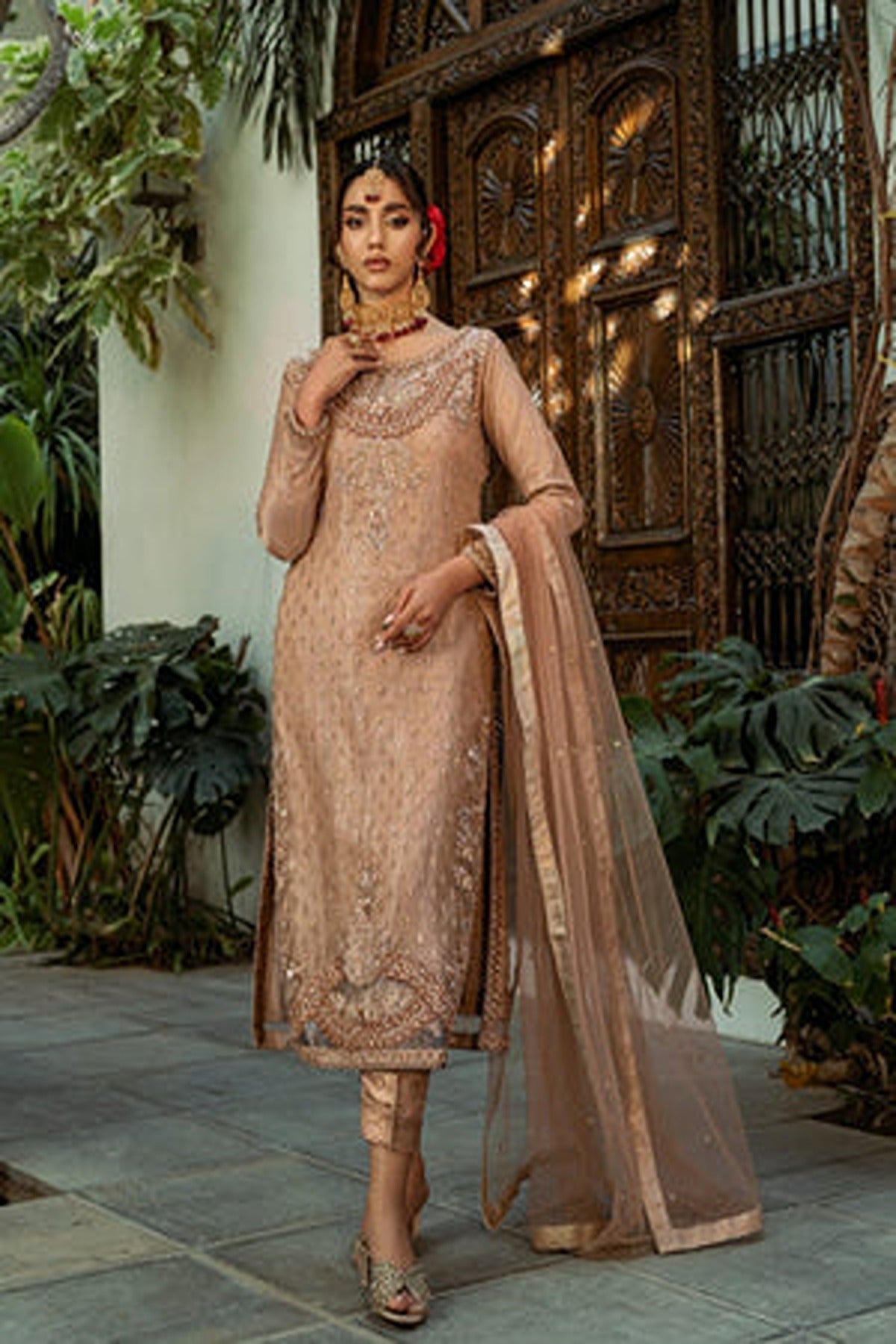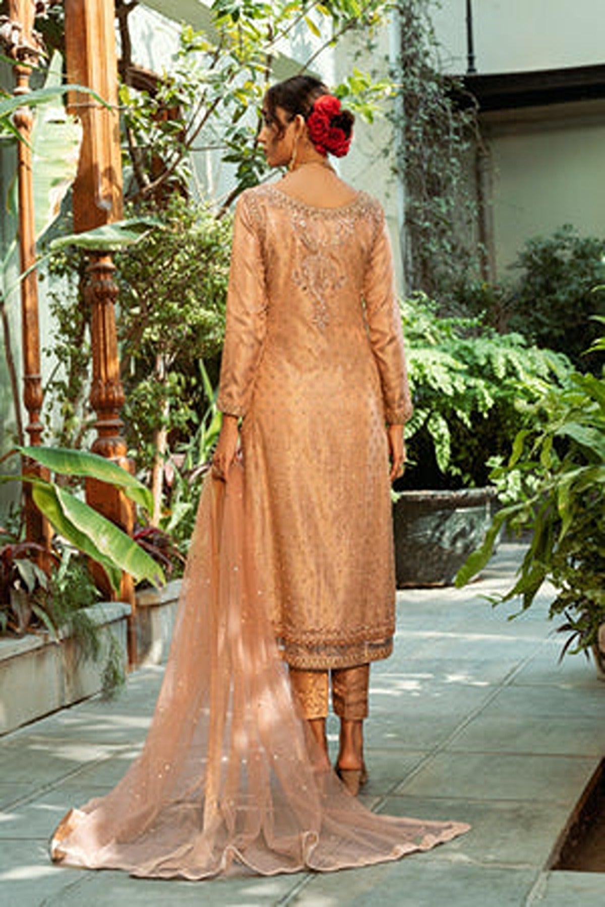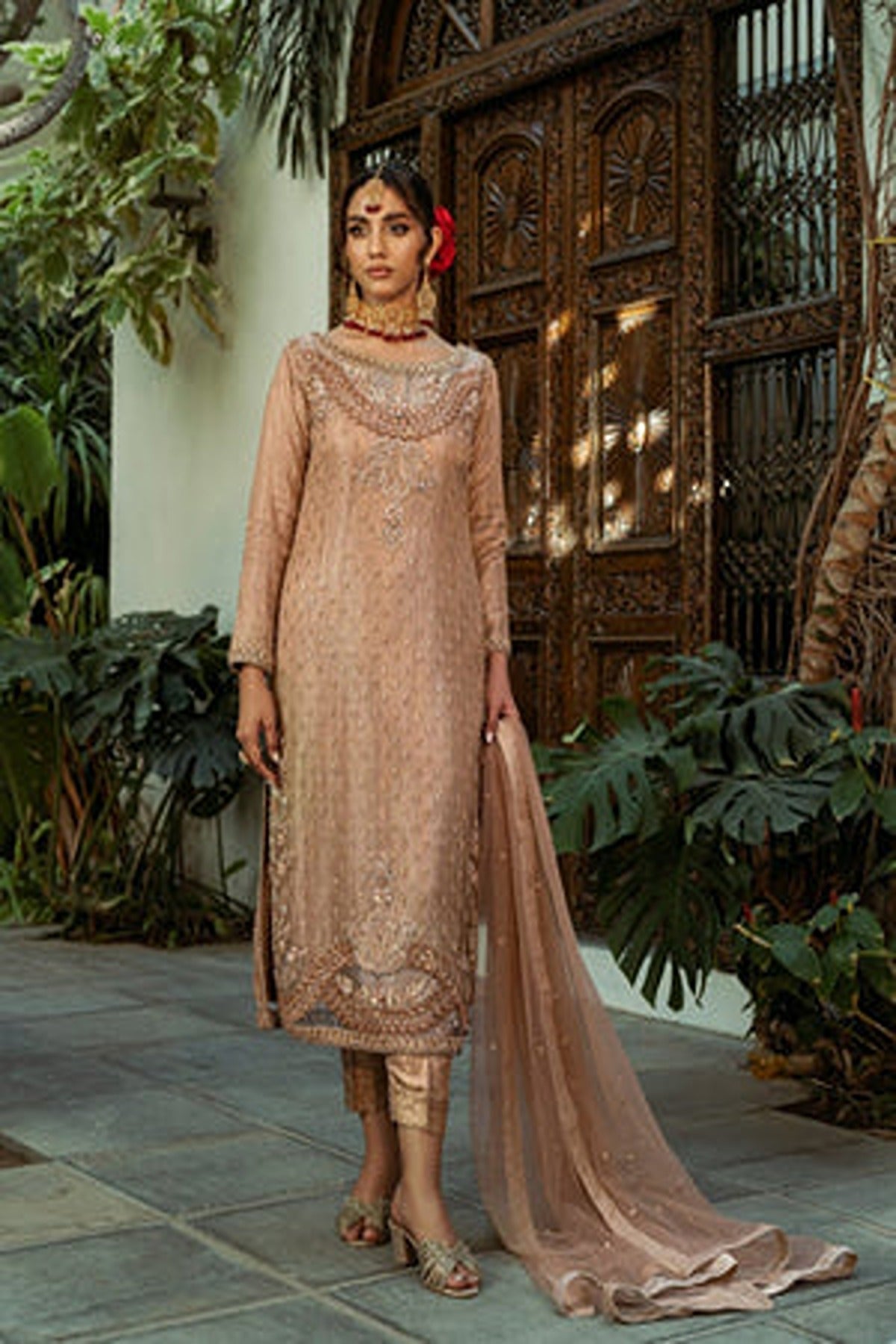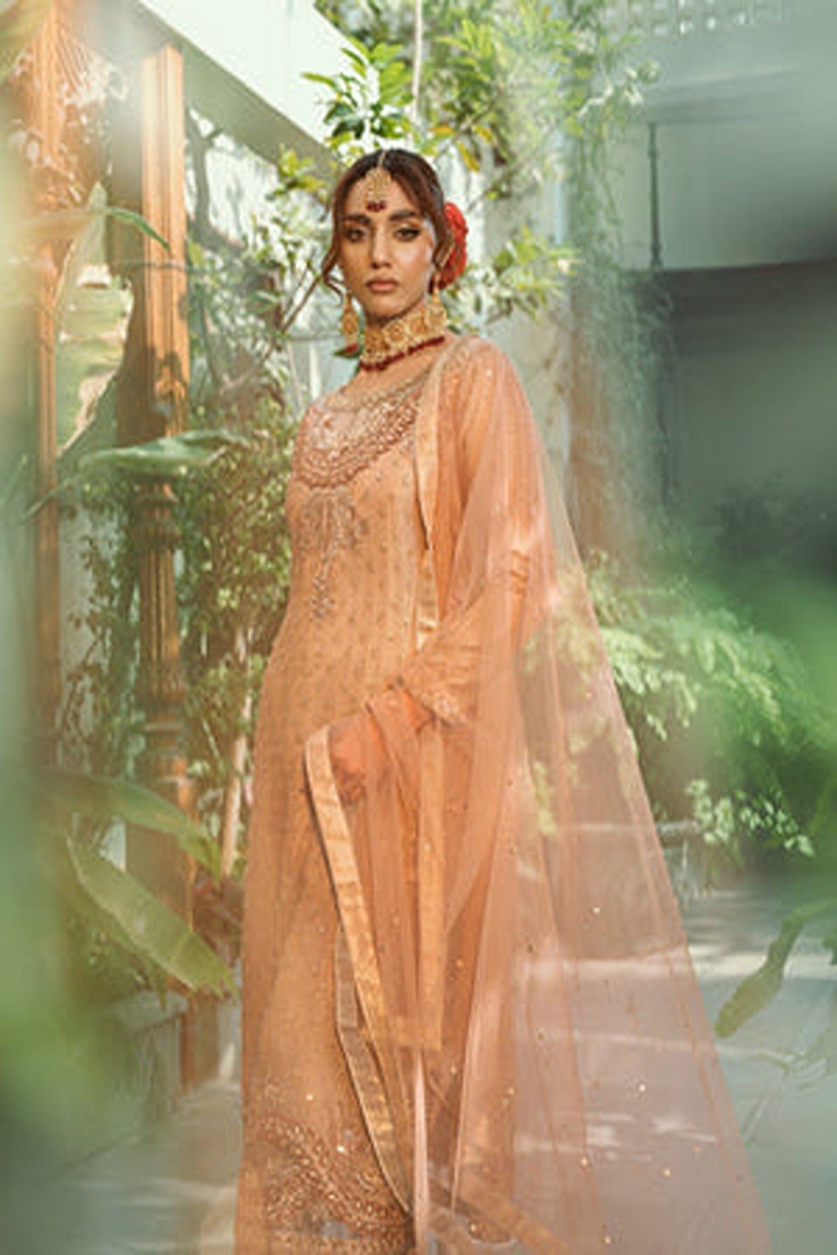 Introducing “Maheen”, an elegant ensemble in a light peach hue. This ensemble features a long kameez with straight trousers. The long kameez is made in light peach tissue fabric and is intricately embellished with shimmering sequins, delicate beads, and zari work. The neckline showcases ornate detailing in zari work and resham threadwork that cascades down the bodice, merging with scattered sitara work throughout the kameez. The simple jamawar trousers harmonize beautifully with the kameez's embellishments. The sheer netted dupatta adds an ethereal touch to this ensemble, with its delicate sitara-work.