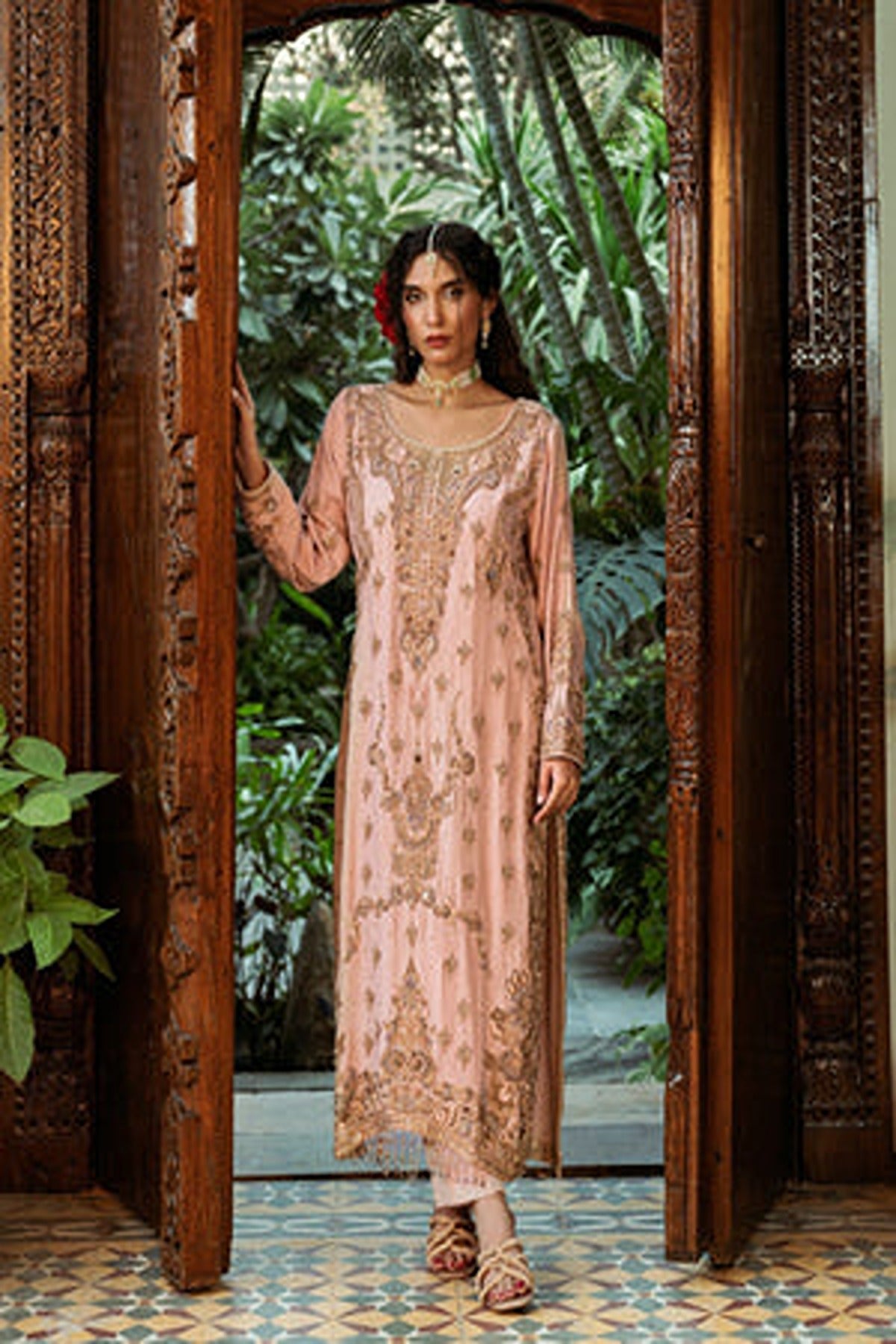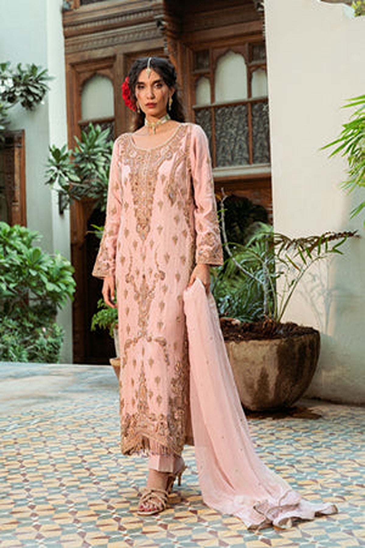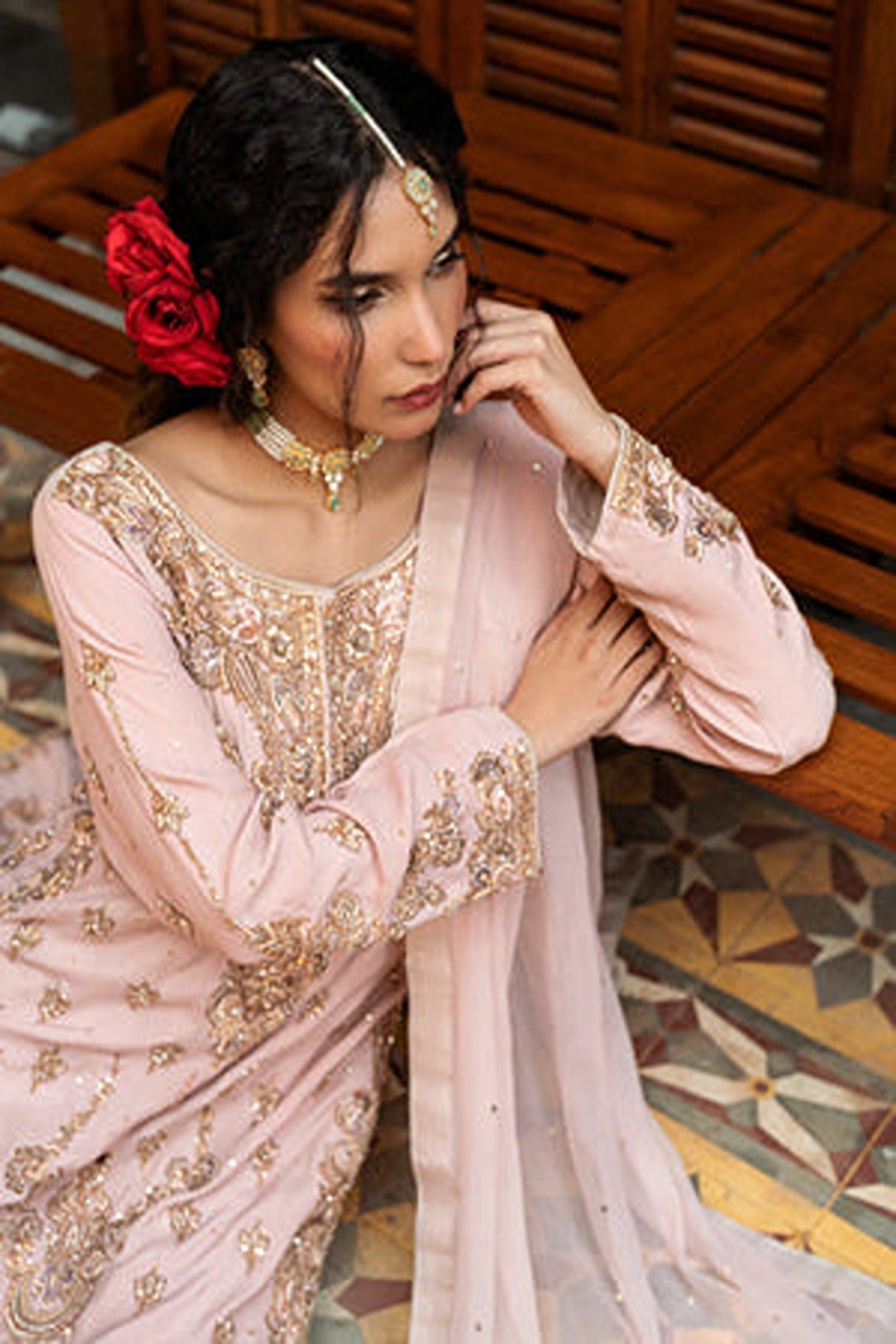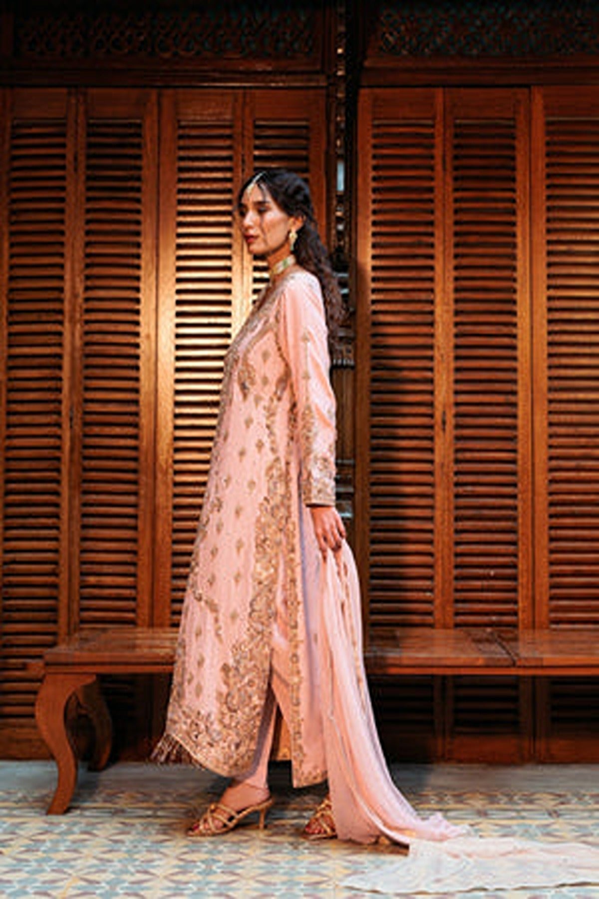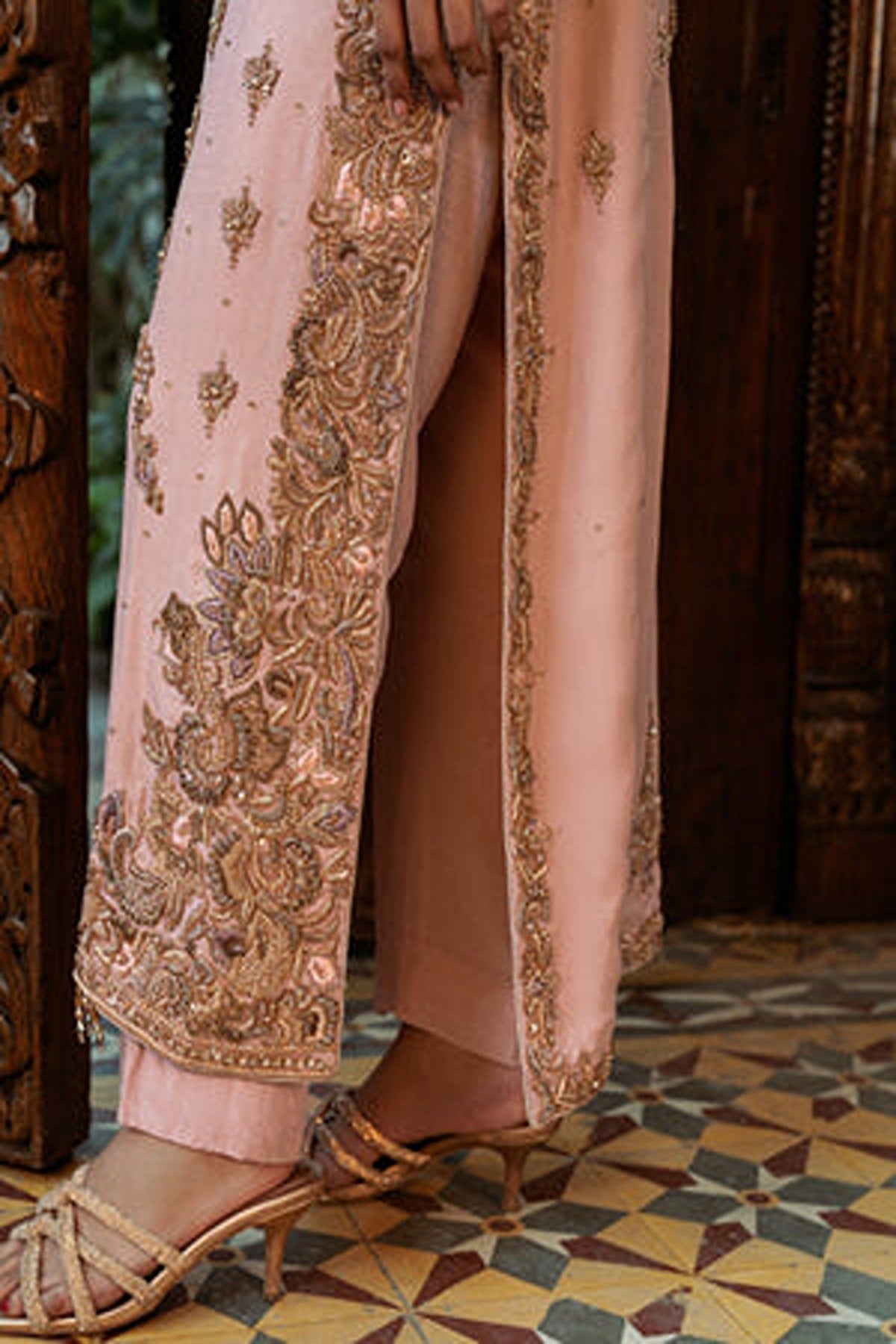 Introducing “Miraal”, a delicately designed blush pink ensemble, a true celebration of femininity and grace. This ensemble features a long kameez paired with straight trousers. The straight-cut kameez is a canvas of intricate craftsmanship, featuring exquisite embroidery in dabka work and resham thread work. Using gold threads, sequins, and beads, the embroidery creates a mesmerizing effect, especially around the neckline, sleeves, and hemline. Adding on, the beautiful contrasting tassels at the hemline elevate the look even more. This exquisite kameez is paired with simple light pink trousers.