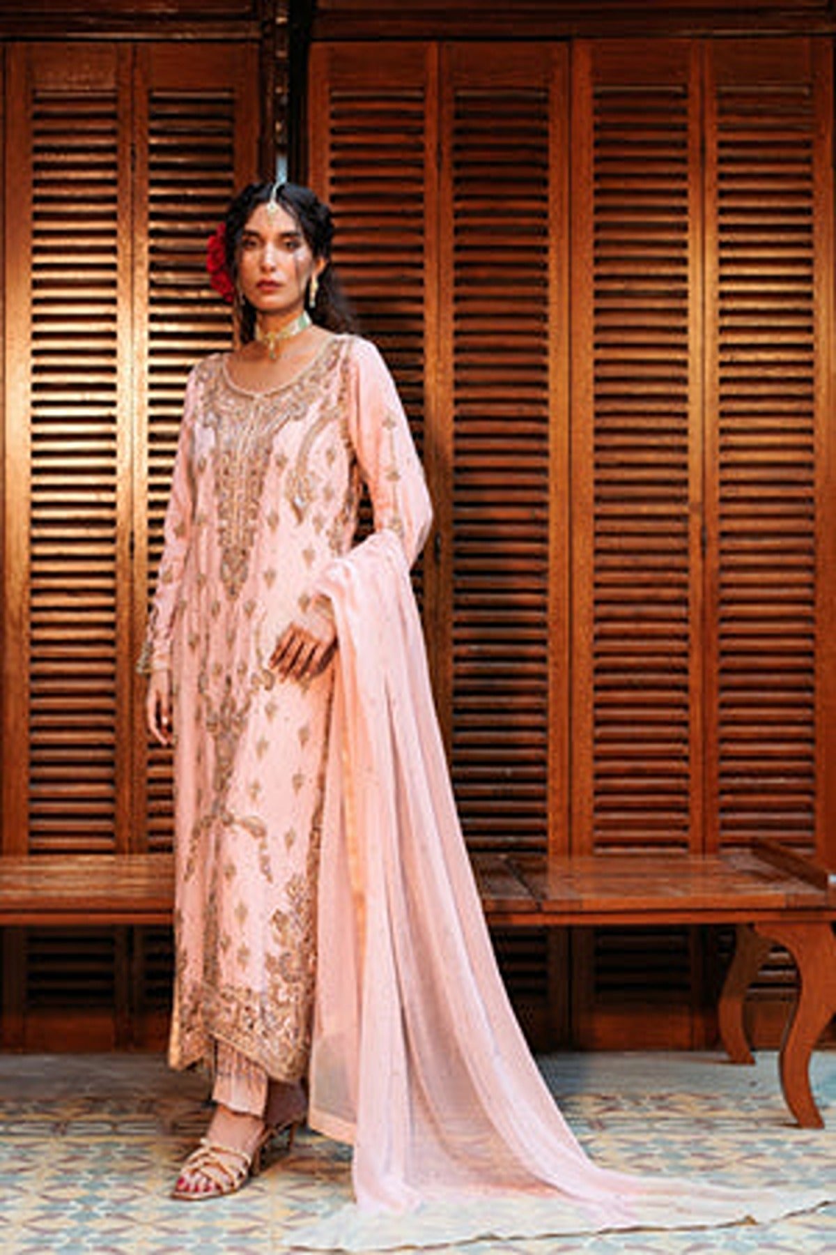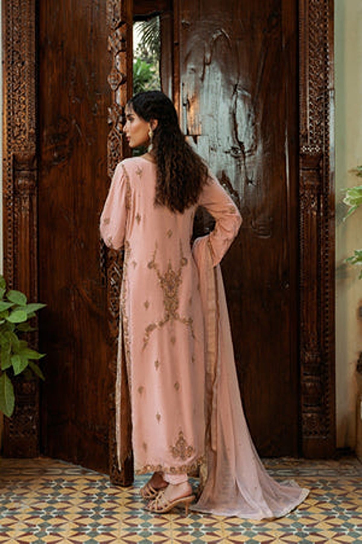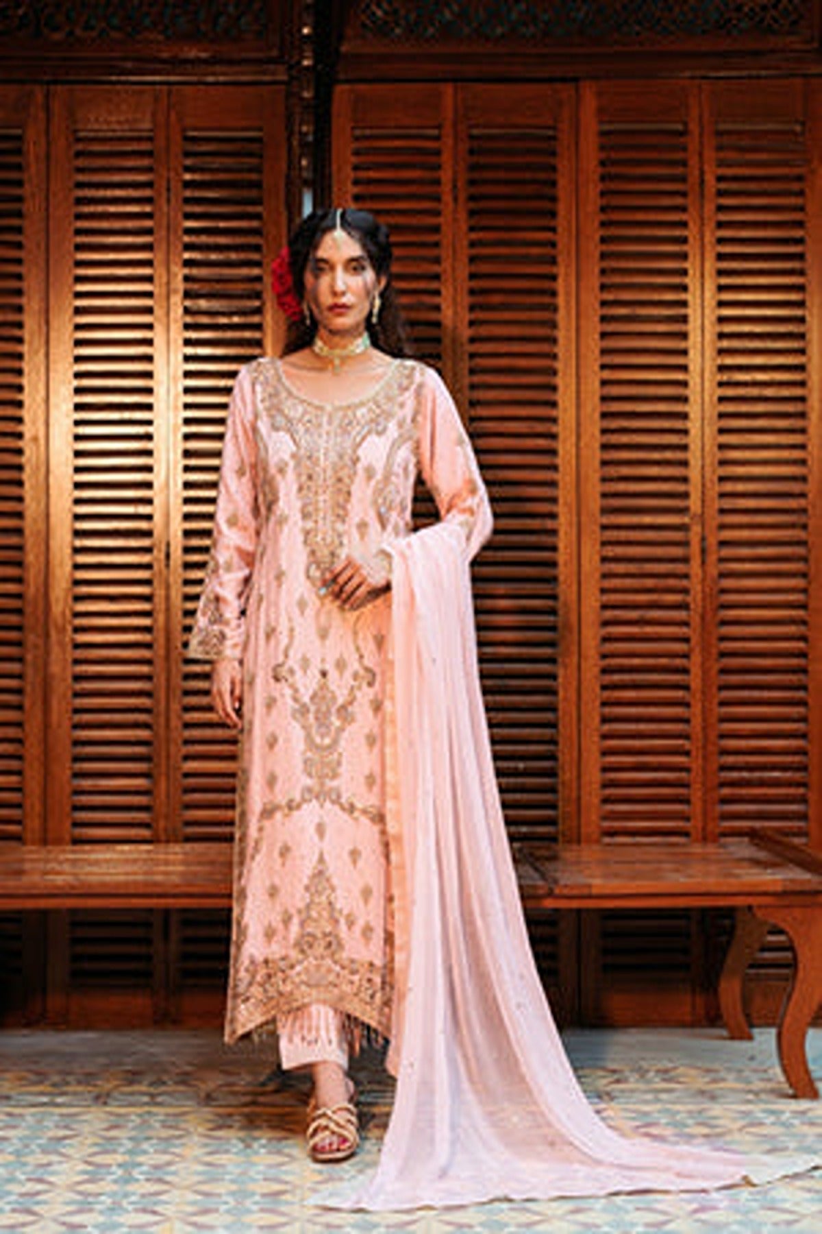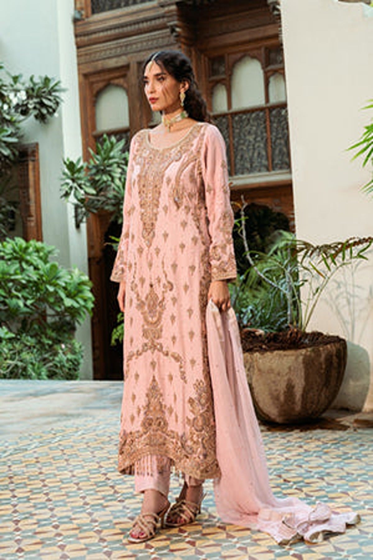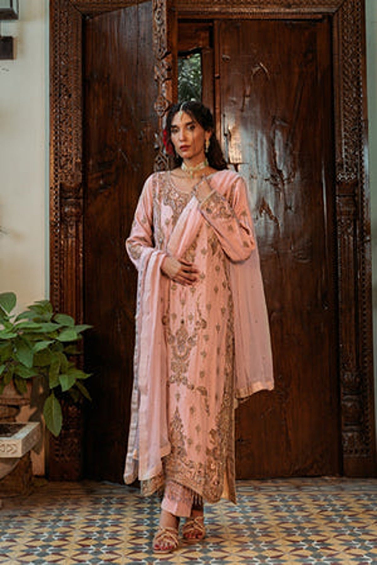 Introducing “Miraal”, a delicately designed blush pink ensemble, a true celebration of femininity and grace. This ensemble features a long kameez paired with straight trousers. The straight-cut kameez is a canvas of intricate craftsmanship, featuring exquisite embroidery in dabka work and resham thread work. Using gold threads, sequins, and beads, the embroidery creates a mesmerizing effect, especially around the neckline, sleeves, and hemline. Adding on, the beautiful contrasting tassels at the hemline elevate the look even more. This exquisite kameez is paired with simple light pink trousers.