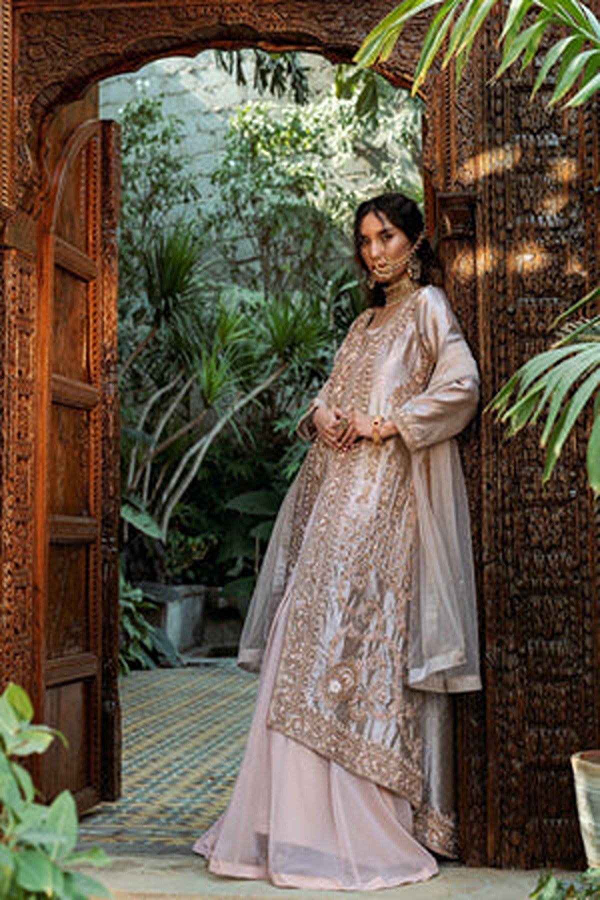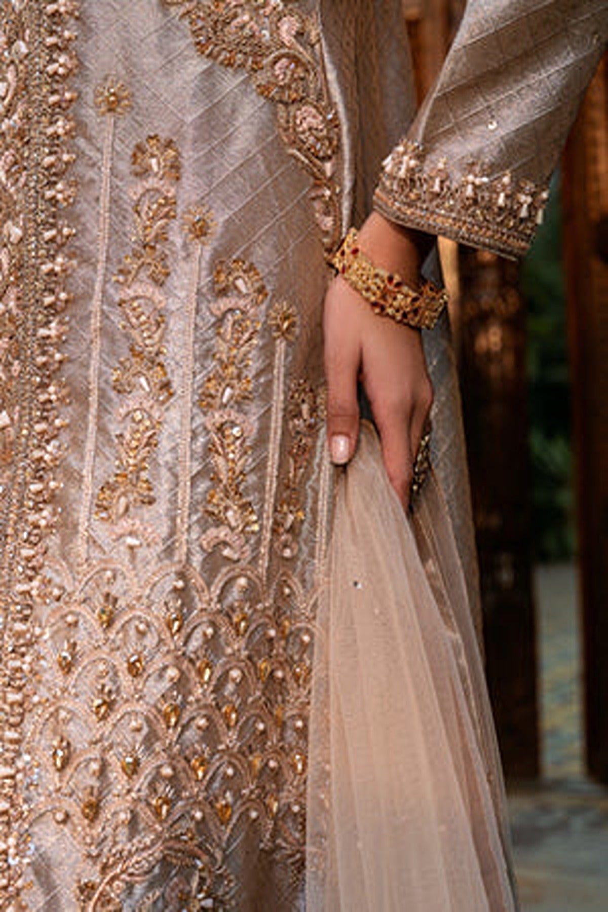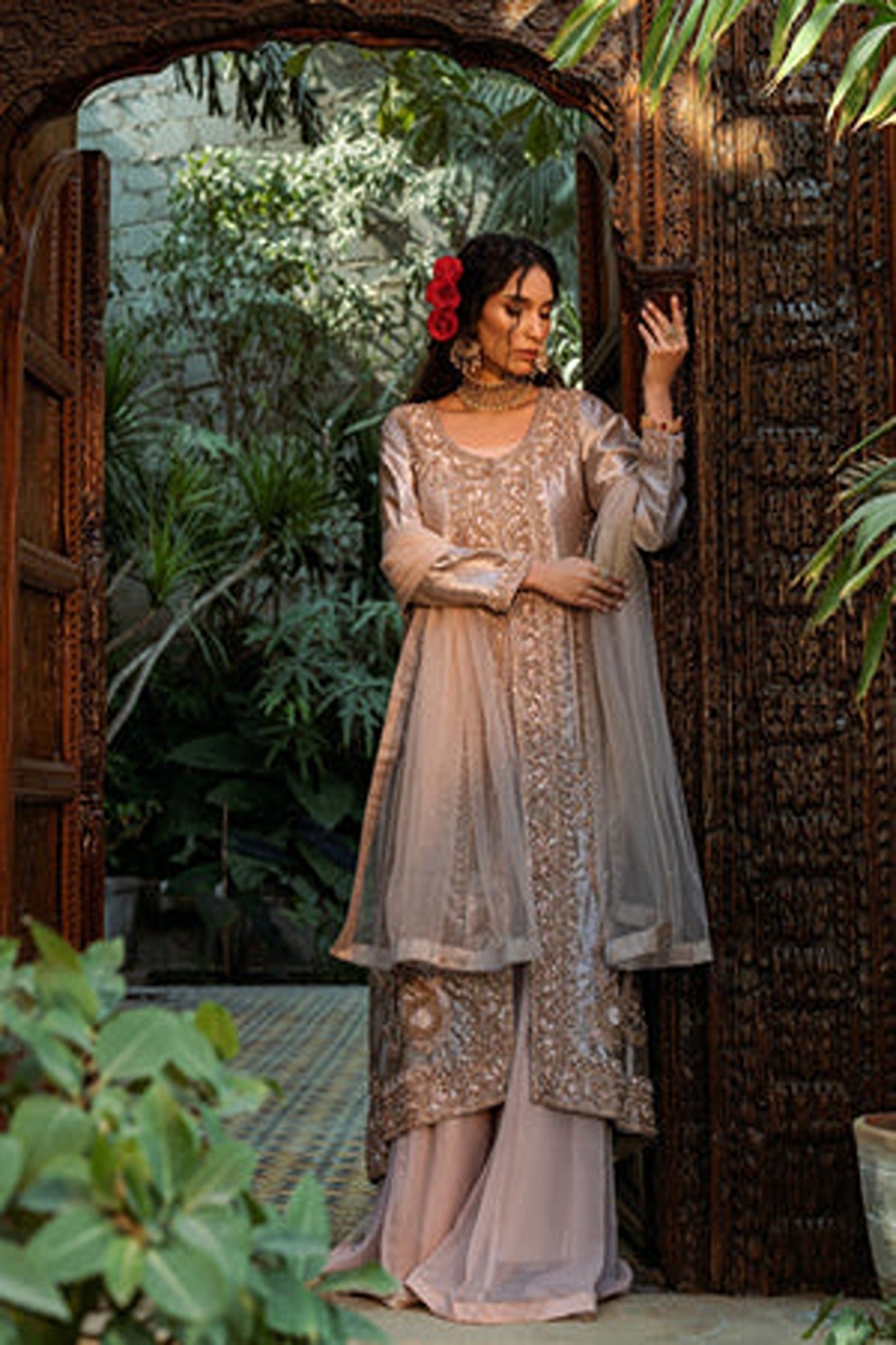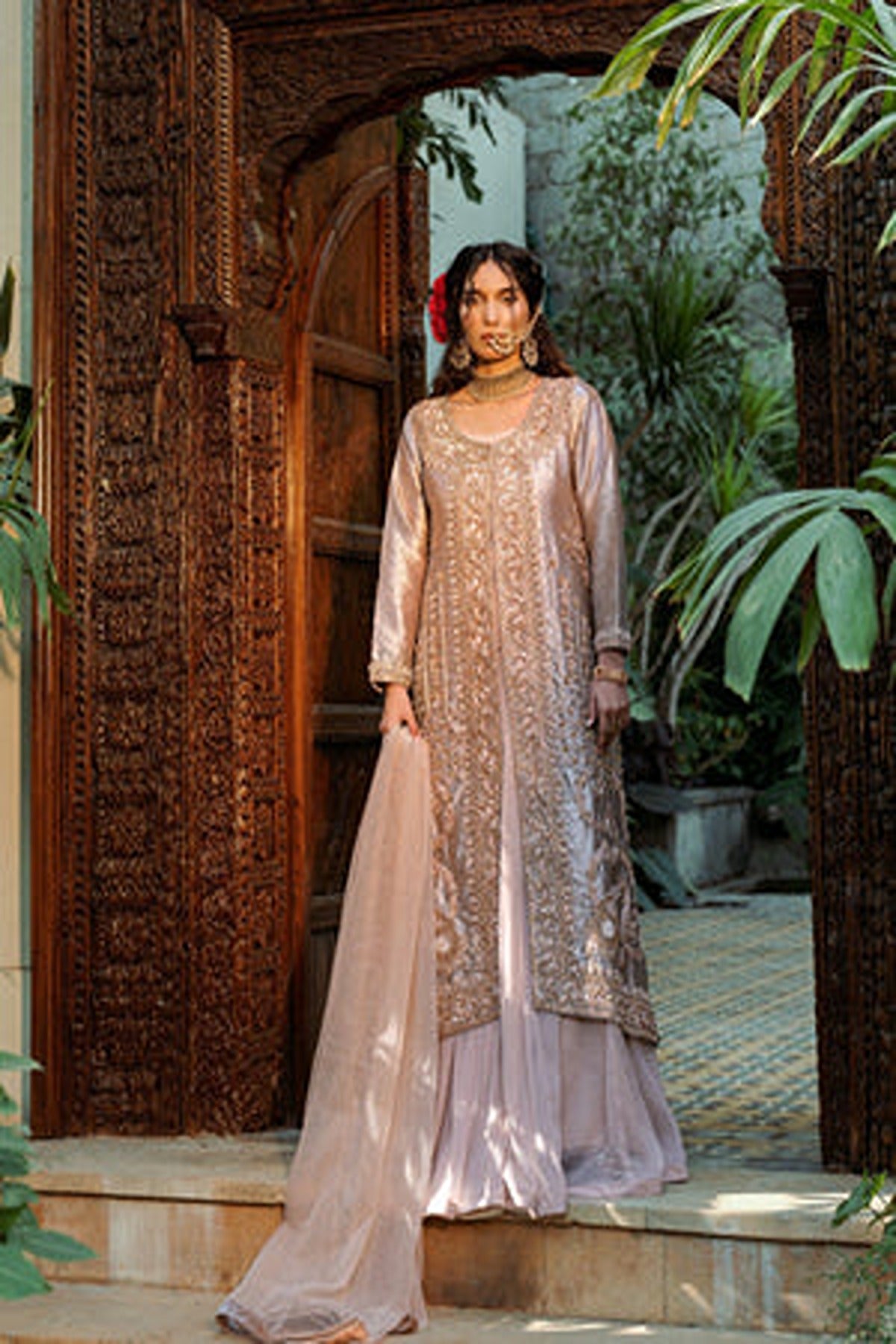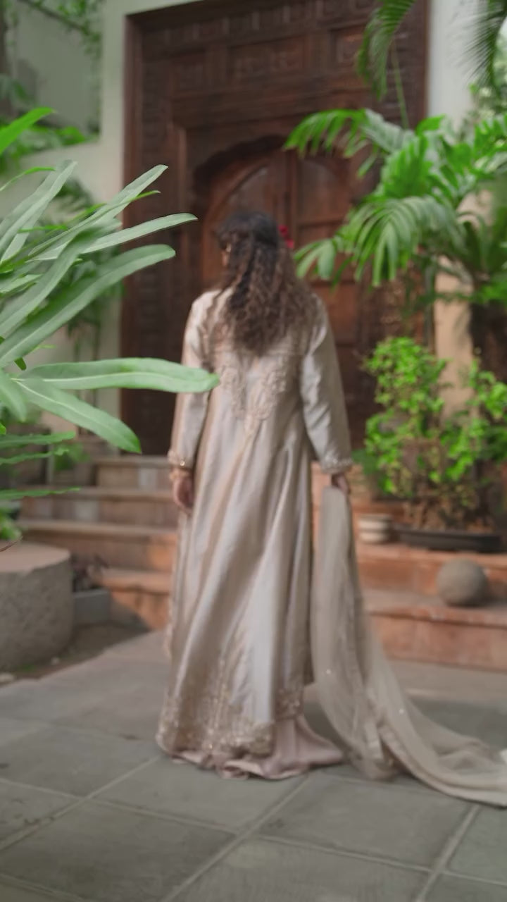 Introducing “Shafaq”, an exquisite rose-gold ensemble. This ensemble features a unique style of front-open kameez with a matching flowy sharara. The long kameez is made in a lustrous satin fabric that radiates grace, detailed with intricate embroidery running along the front panels. The delicate floral and geometric patterns, enhanced with shimmering threadwork and sequins create a luxurious look. The neckline and the borders of the kameez feature detailed floral patterns in delicate resham threadwork and zari work. he full sleeves add a touch of modesty while featuring embroidered cuffs. The kameez is paired with flowy sharara in light pink which complements perfectly with the heavily embroidered kameez. The ensemble is completed with a sheer dupatta in matching hue.