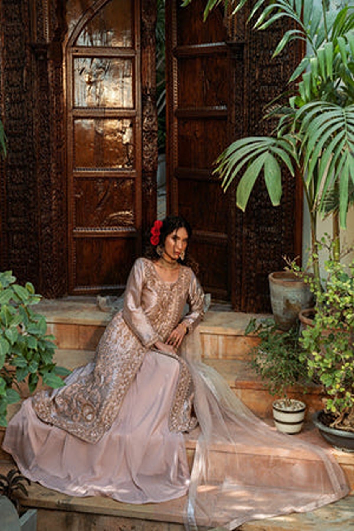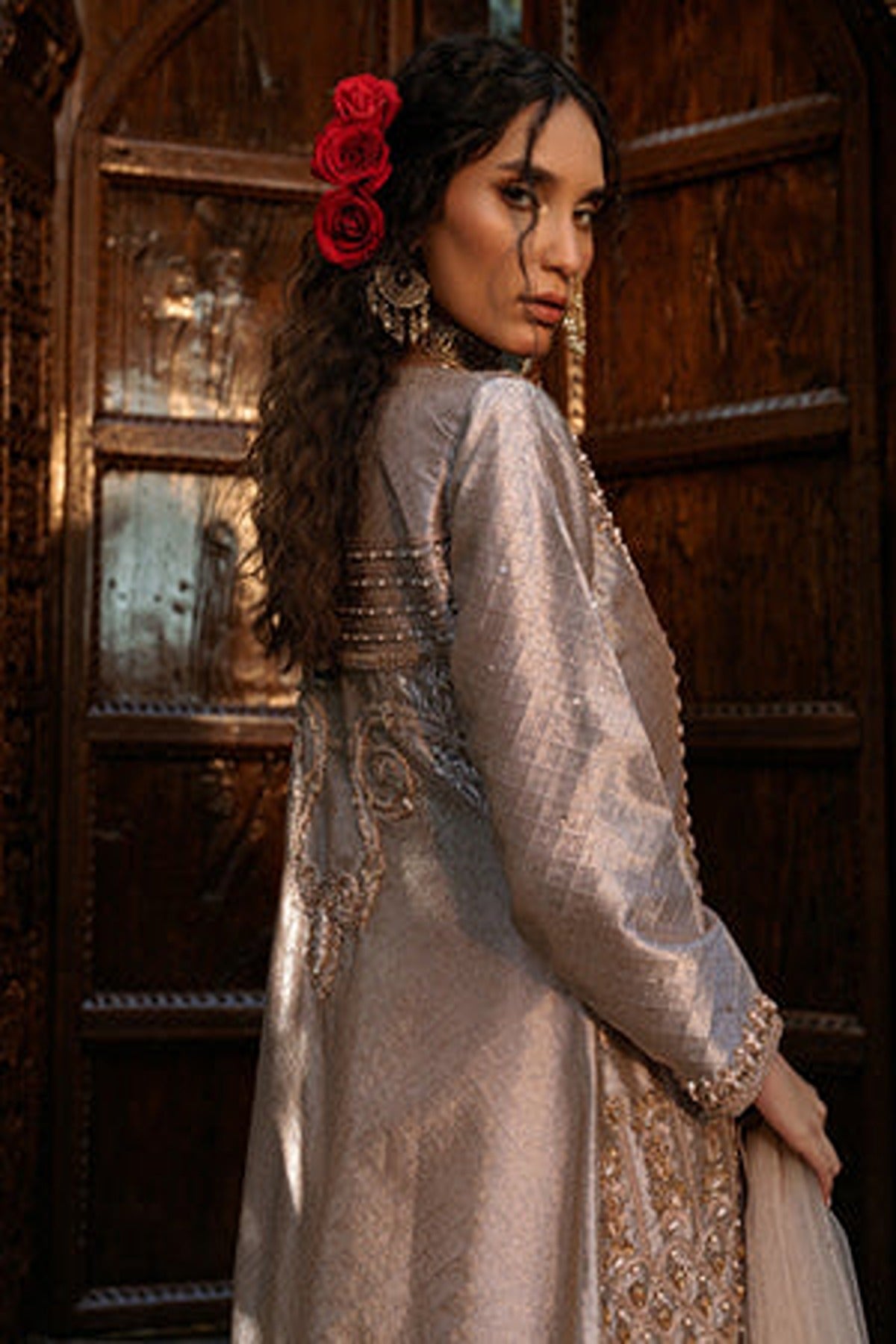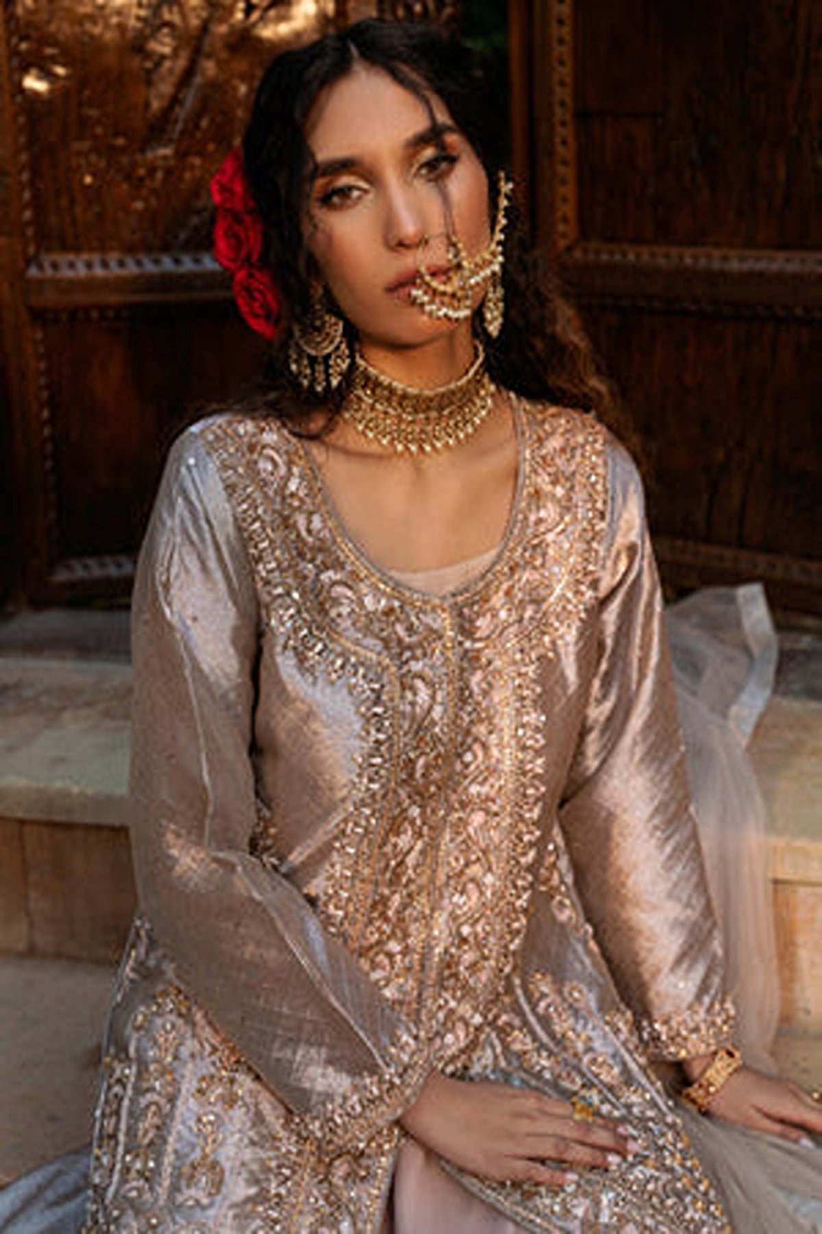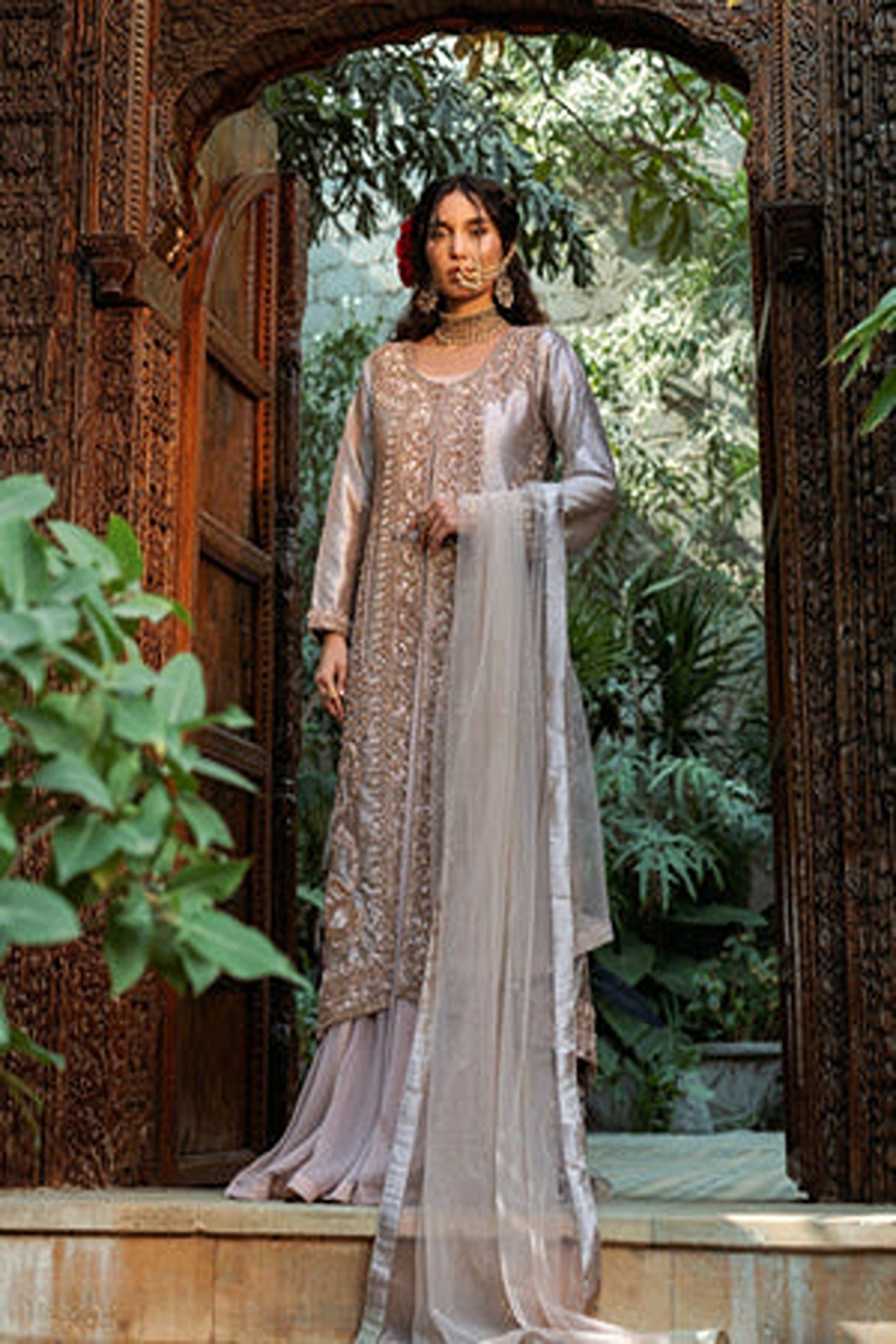 Introducing “Shafaq”, an exquisite rose-gold ensemble. This ensemble features a unique style of front-open kameez with a matching flowy sharara. The long kameez is made in a lustrous satin fabric that radiates grace, detailed with intricate embroidery running along the front panels. The delicate floral and geometric patterns, enhanced with shimmering threadwork and sequins create a luxurious look. The neckline and the borders of the kameez feature detailed floral patterns in delicate resham threadwork and zari work. he full sleeves add a touch of modesty while featuring embroidered cuffs. The kameez is paired with flowy sharara in light pink which complements perfectly with the heavily embroidered kameez. The ensemble is completed with a sheer dupatta in matching hue.