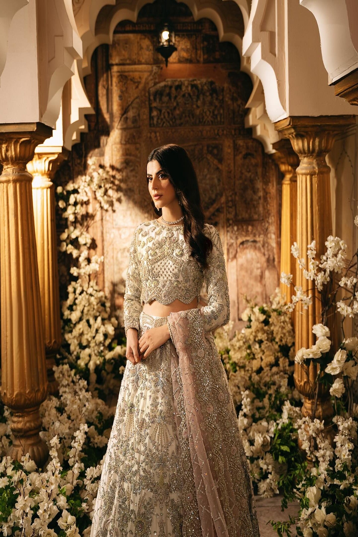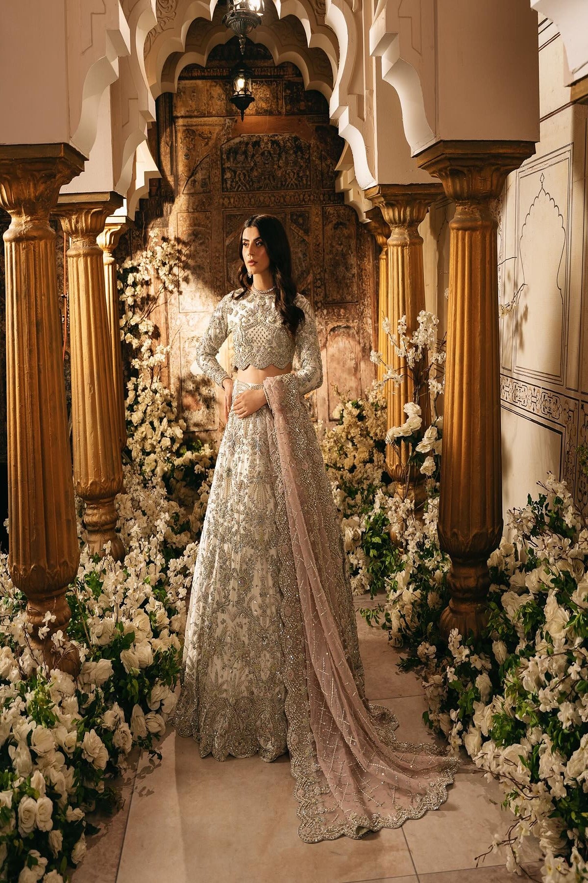 This ensemble features a beautifully crafted lehnga & choli. The lehenga features an array of intricate embroidery, adorned with luxurious embellishments of pearls, sequins, and crystals. The rich embroidery weaves together floral and geometric patterns in soft shimmers, enhancing its grace. The choli is equally captivating, designed with full length sleeves that are intricately decorated with a blend of tilla work, sequins, and beads. Each element, from the embroidery on the sleeves to the beautifully detailed neckline contrasts with the lehnga. Completing this magnificent look is a light pink delicately embroidered dupatta, adorned with a border of fine embellishments.