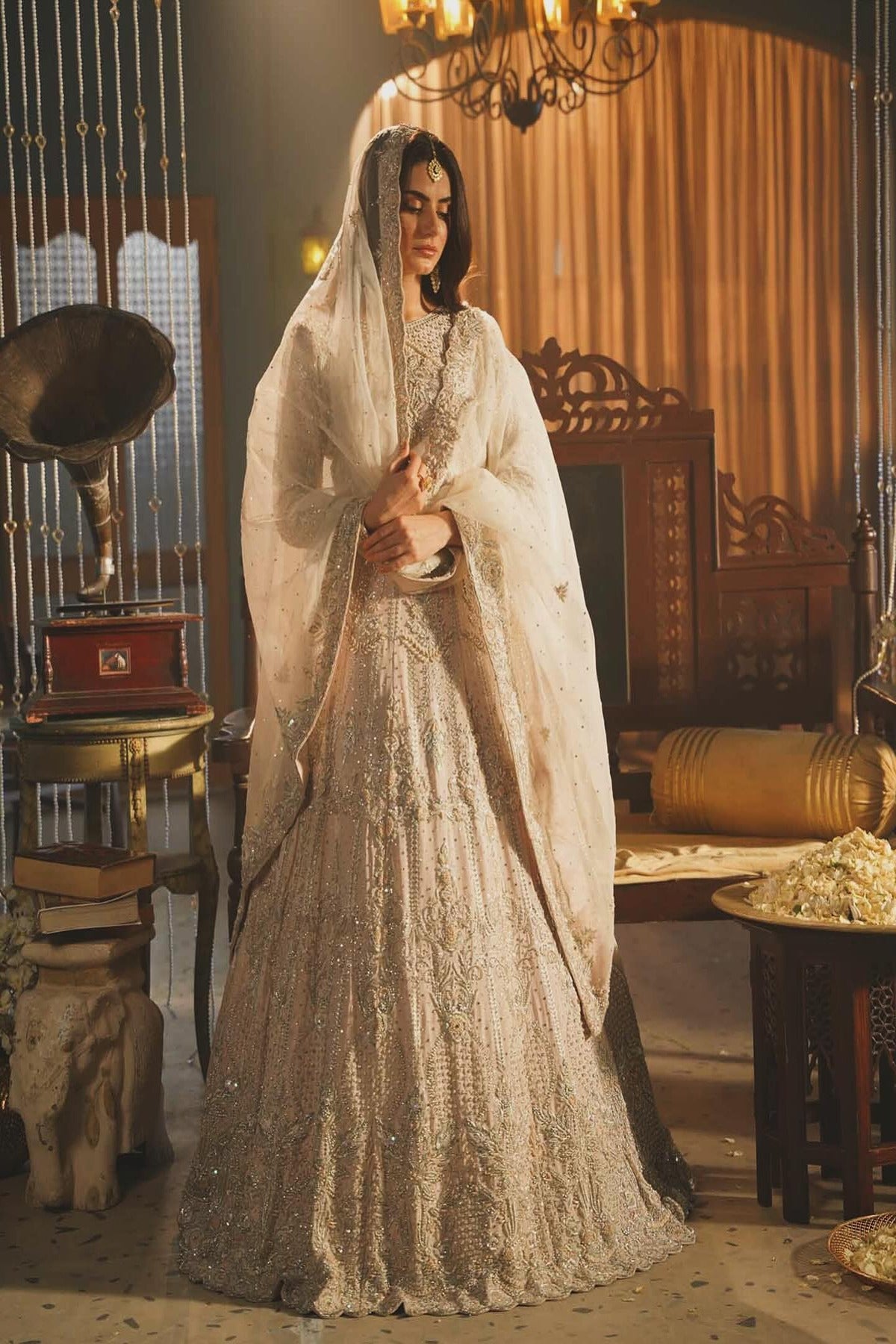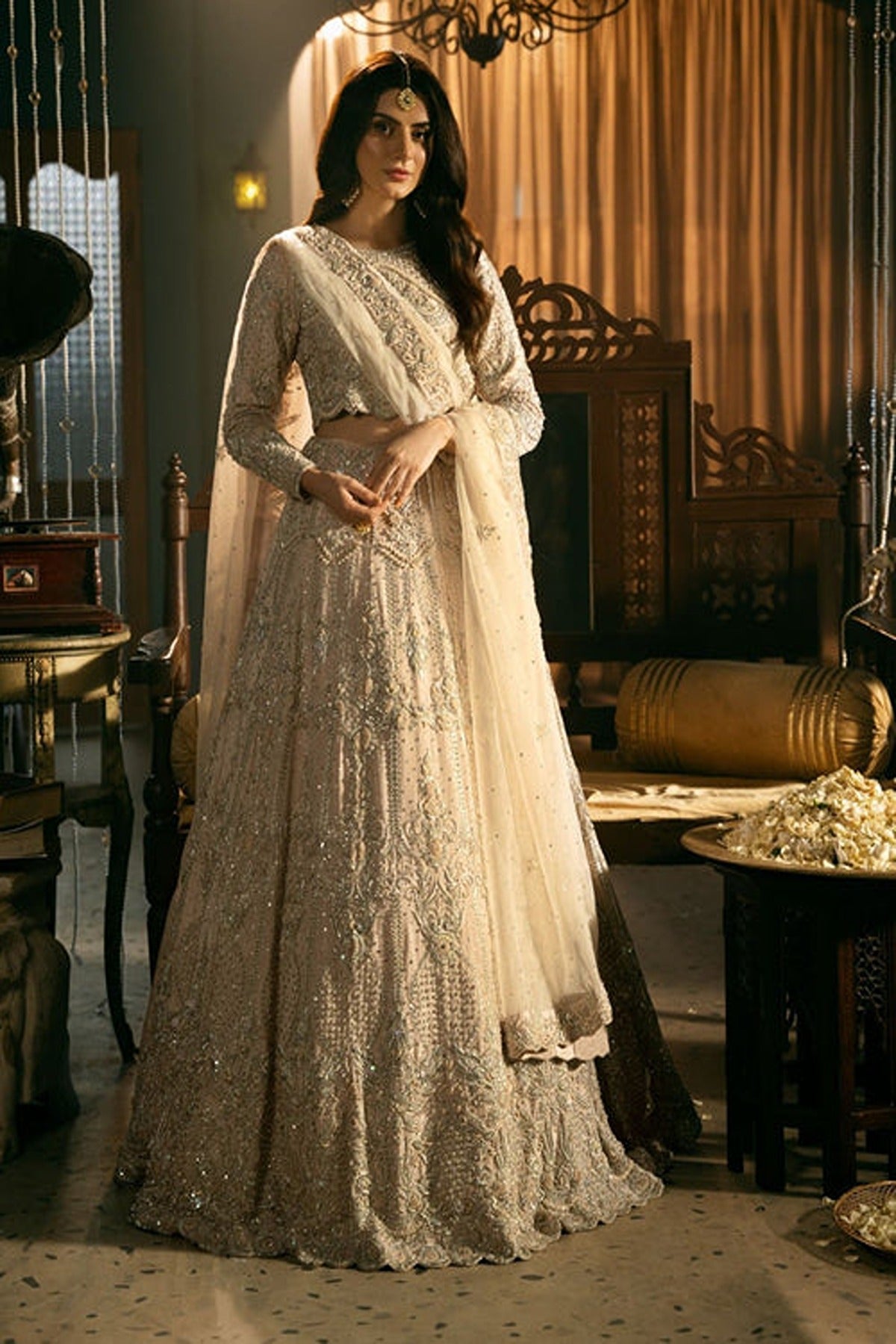 Introducing our beautiful ensemble, "Heer". This masterpiece features intricate craftsmanship of tilla, zardozi, and zari work on both the lehenga and choli. This exquisitely crafted lehenga is adorned with shimmering silver and champagne gold embellishments. The delicate embroidery features floral motifs, all meticulously accented with crystal and beadwork. Each part of the lehenga is detailed with these ornate embellishments, creating an elegant, all-over sparkle that captures light from every angle. The intricate and detailed arrangement of embroidery on the choli matches perfectly with the lehenga. The full sleeves are embellished with sparkling stonework and beaded crystals, offering a sophisticated shimmer. Completing the look is a soft, sheer light pink dupatta, delicately sprinkled.