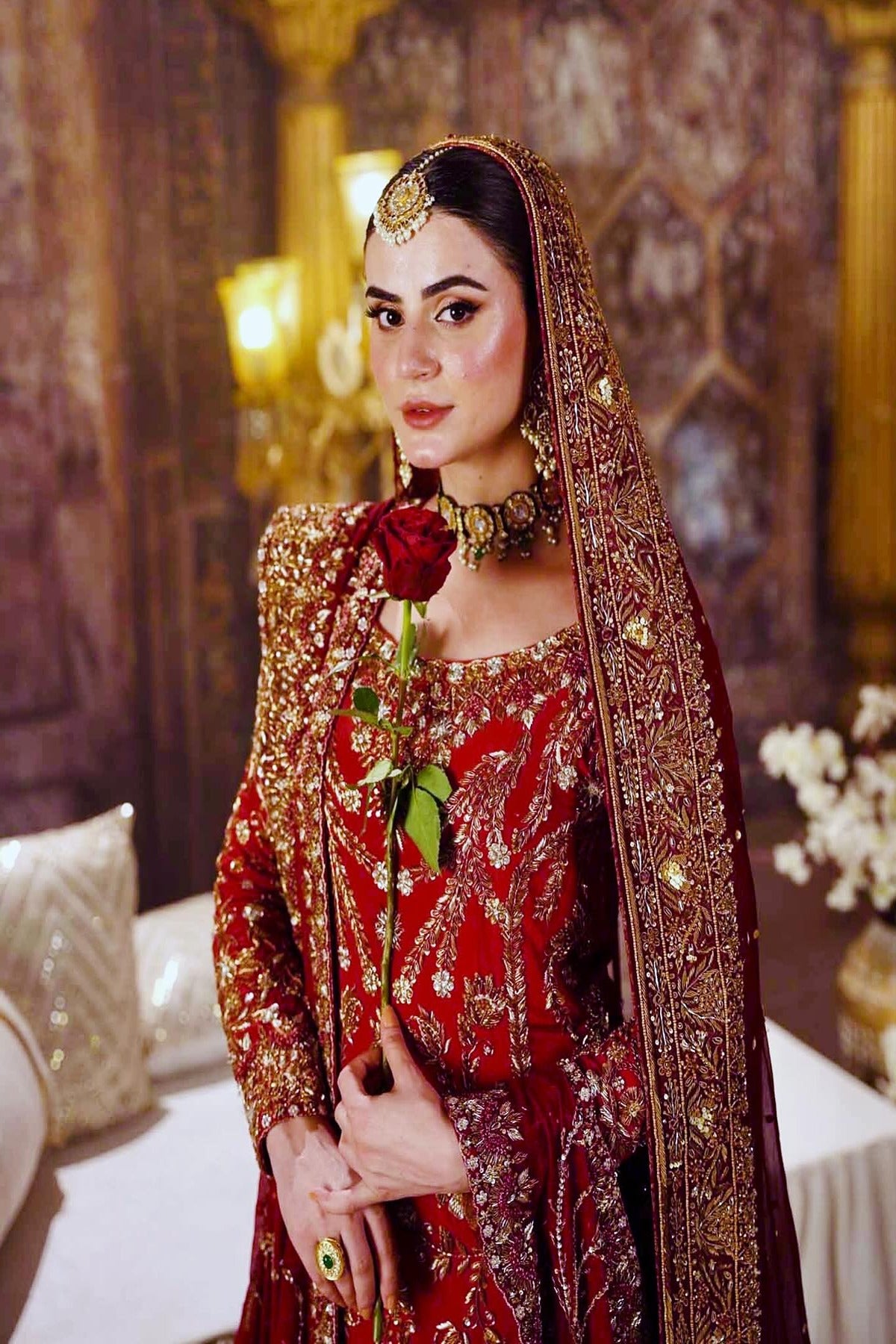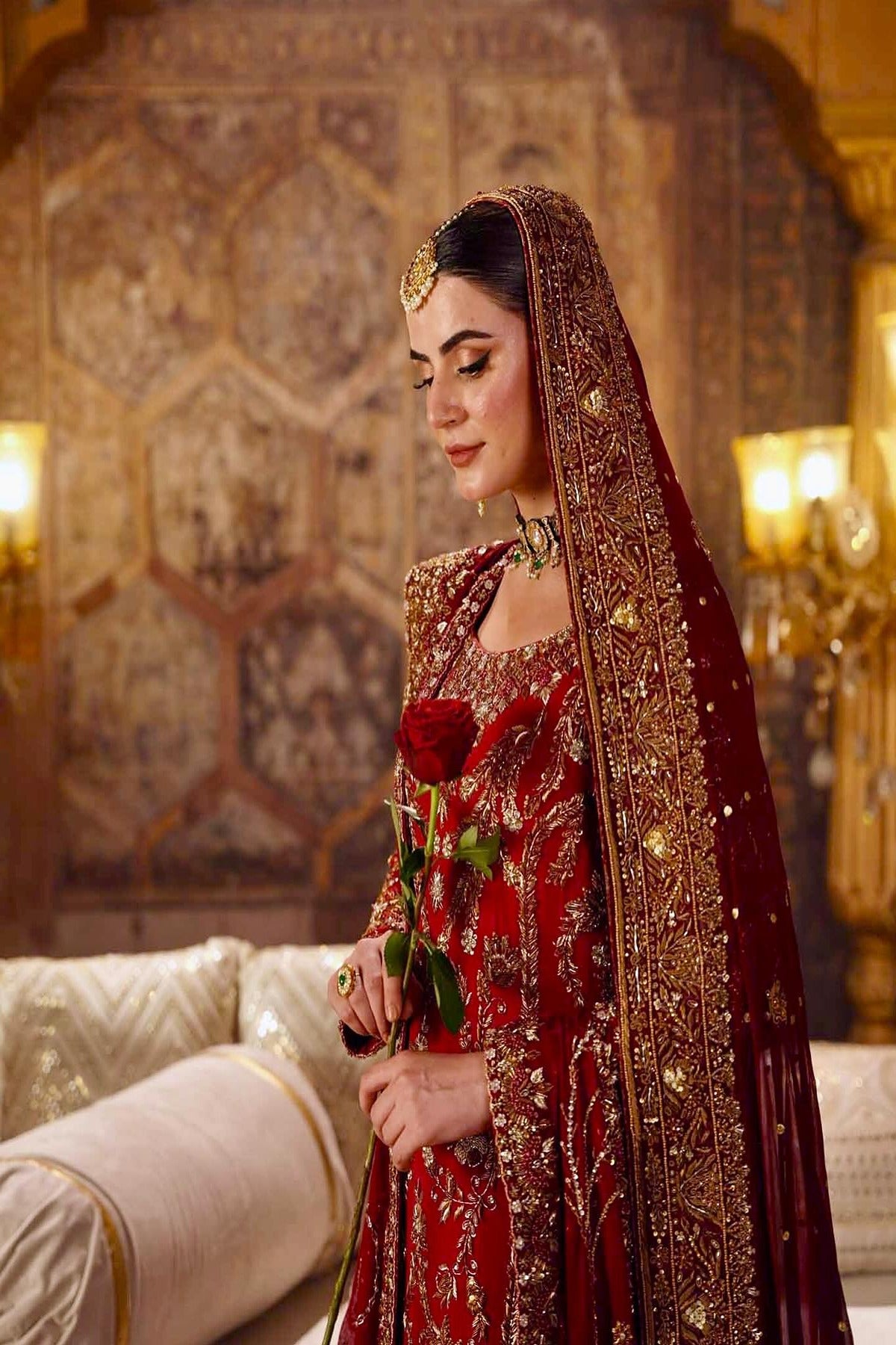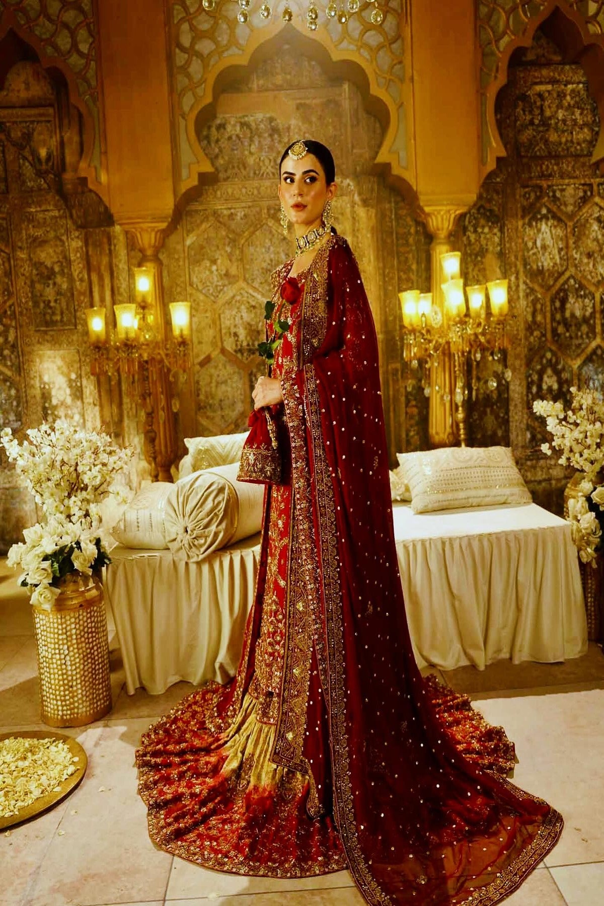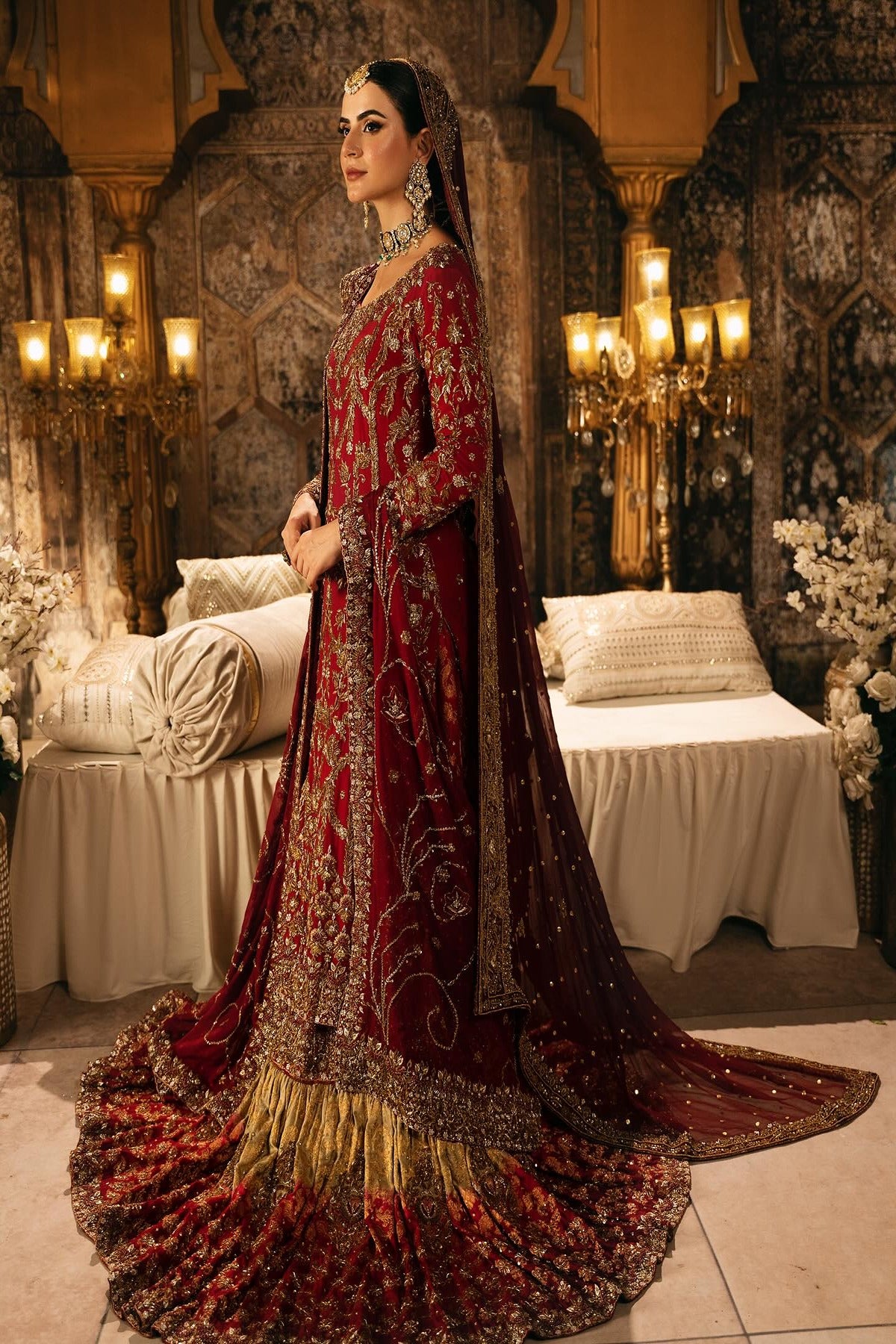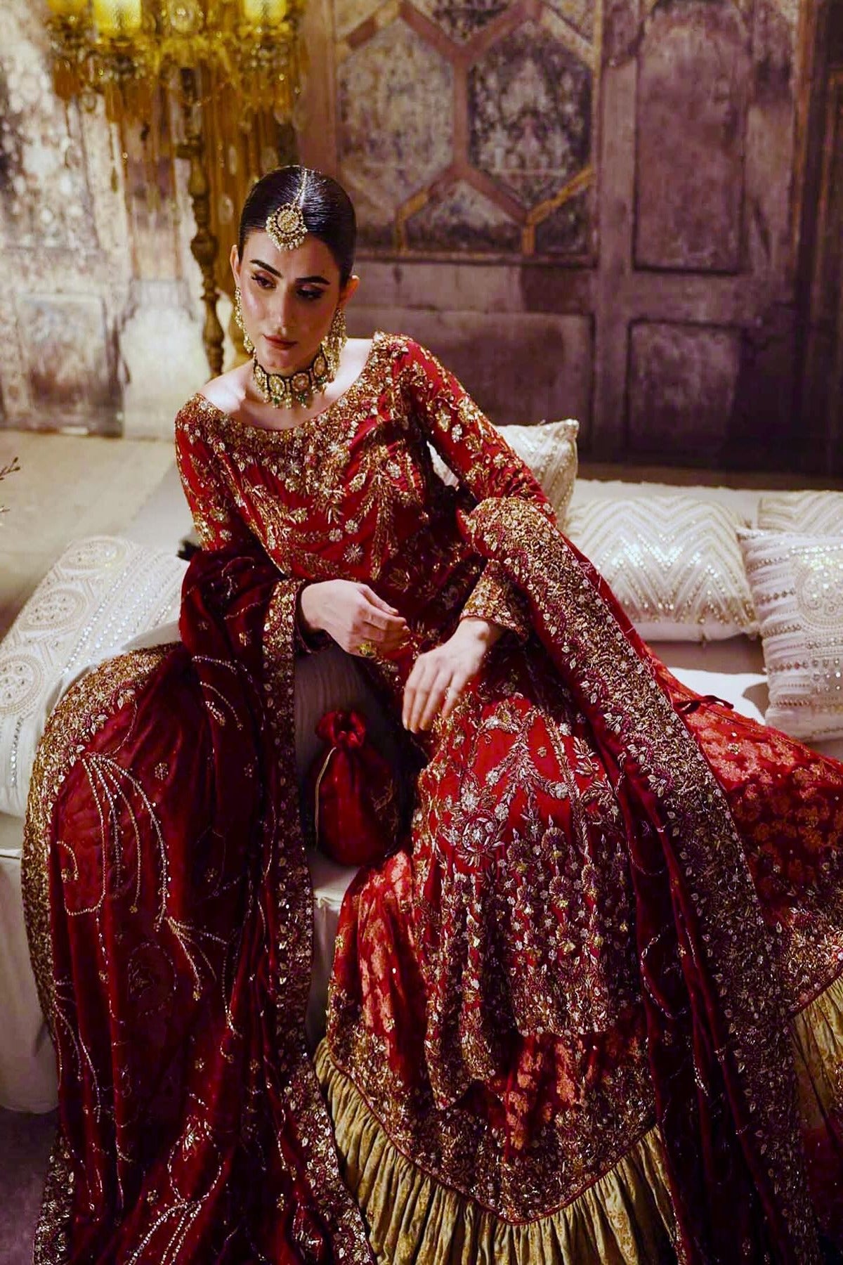 This ensemble features a stunning crimson red long shirt adorned with intricate embroidery. The rich detailing across the shirt showcases a beautiful interplay of zari, sequins, and tilla work, with delicate motifs of florals and vines cascading down the length. The shirt’s charm is enhanced by its ornate neckline and intricate sleeves. Paired with it, is a farshi sharara, which brings a sense of traditional grandeur to the outfit. The farshi sharara is adorned with lavishly embroidered borders and detailed motifs that complement the overall design.The dupatta, a true highlight of this ensemble, is a statement piece on its own. The edges are delicately bordered with intricate detailing, while the entire dupatta is scattered with fine embellishments.