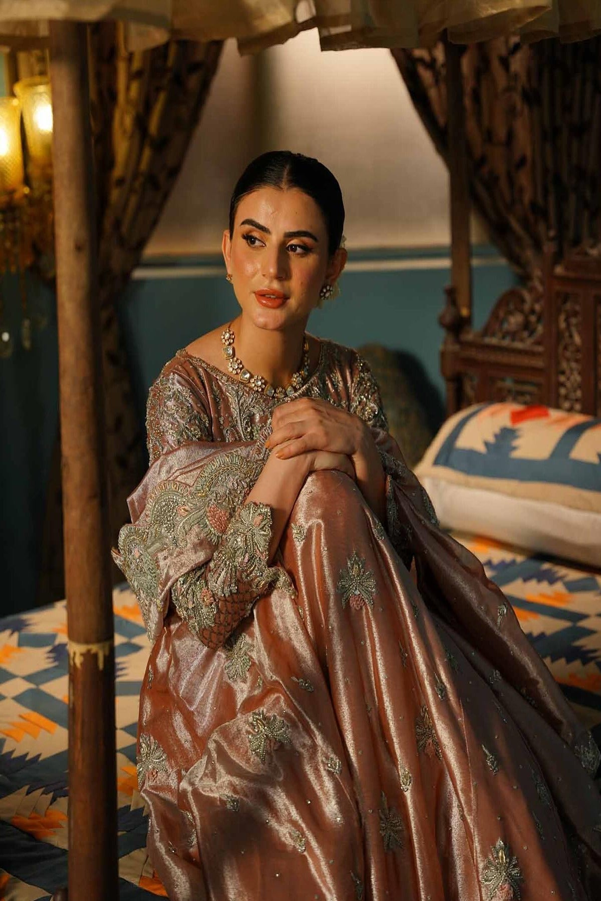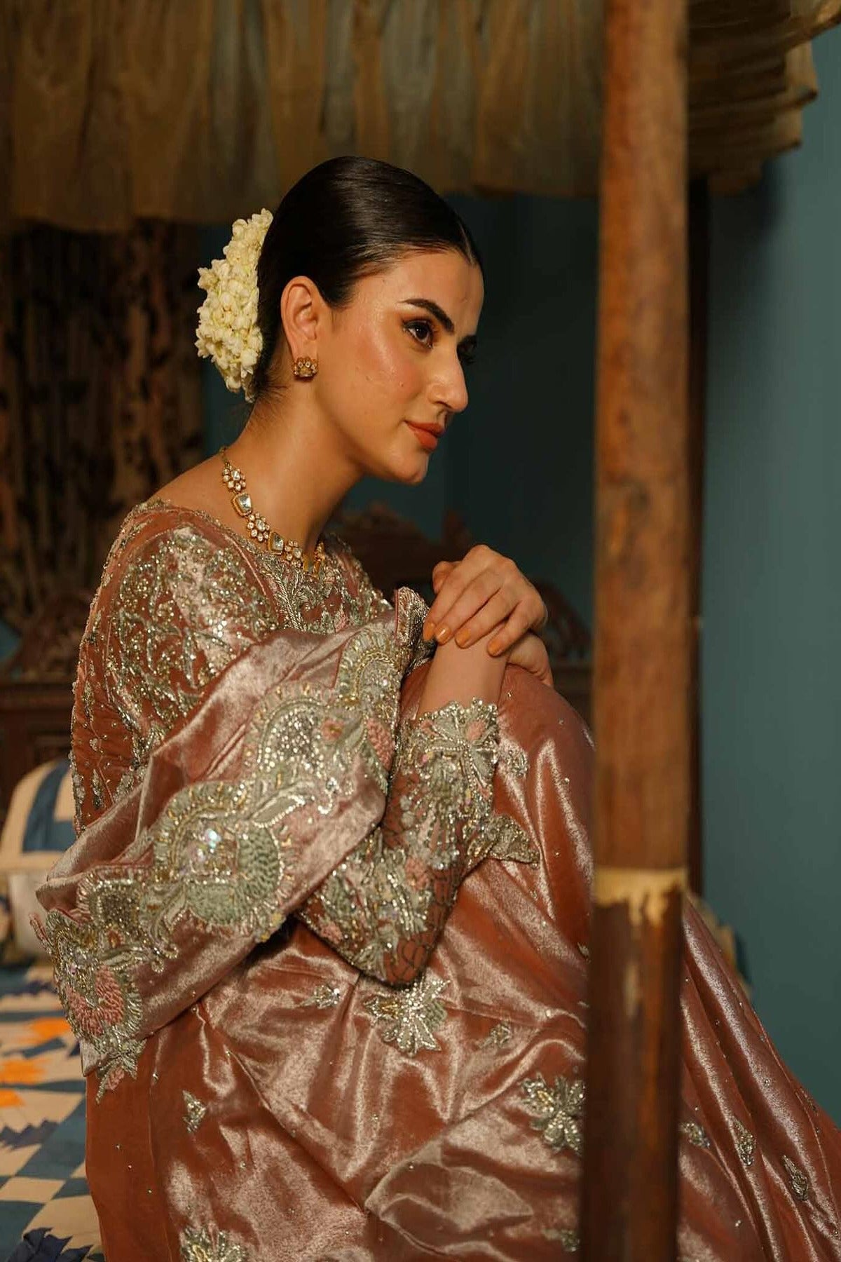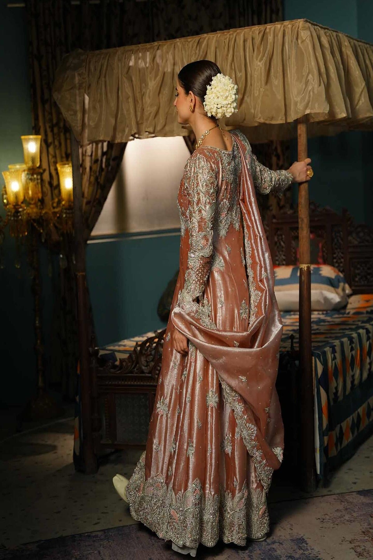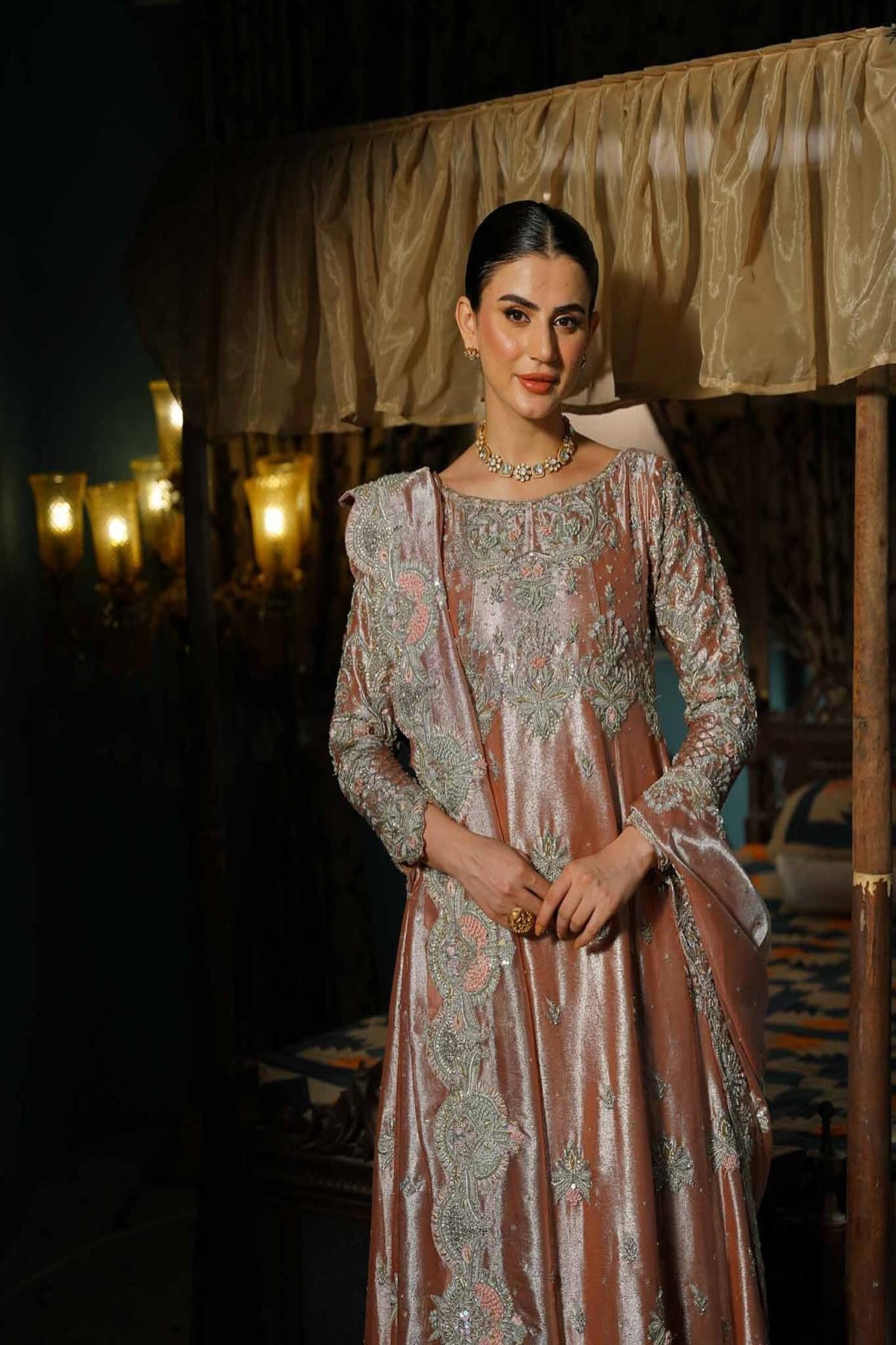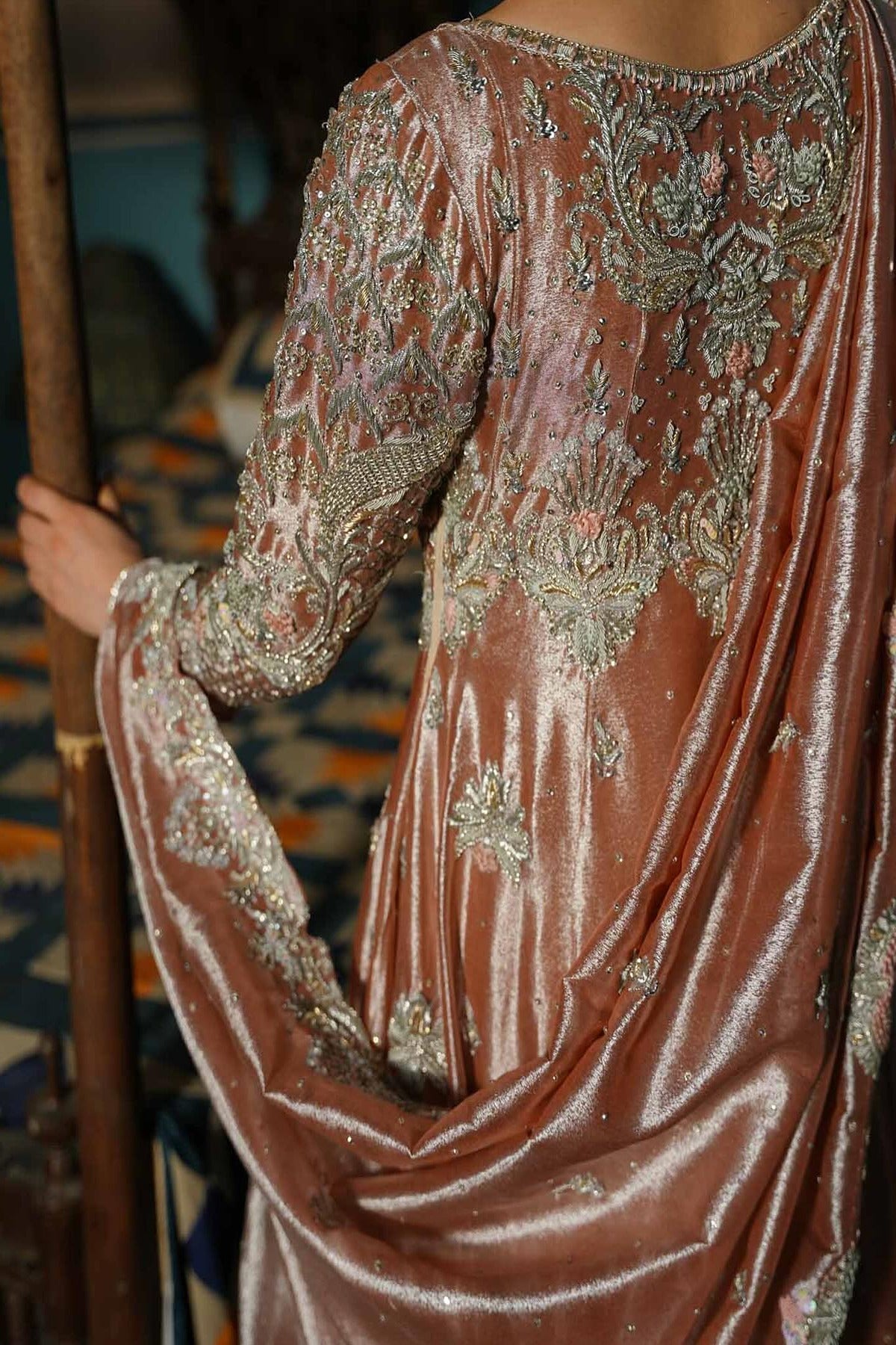 This ensemble is a rose-gold pishwas, made from a rich, luminous silk fabric that exudes a soft look. The exquisite silver threadwork embroidery adorns the whole pishwas including the neckline and sleeves. The intricate detailing consists of floral motifs. Each element of the embroidery is further enhanced by subtle beads and sequins, adding a luxurious shimmer. The hemline of the frock is framed by a wide, ornate border that mirrors the delicate embroidery on the sleeves and neckline. Paired with a matching dupatta, this ensemble takes the sophistication up a notch. The dupatta features scattered motifs, echoing the intricate design elements of the pishwas. Its embroidered border adds a finishing touch, making it a perfect complement to the rest of the outfit.