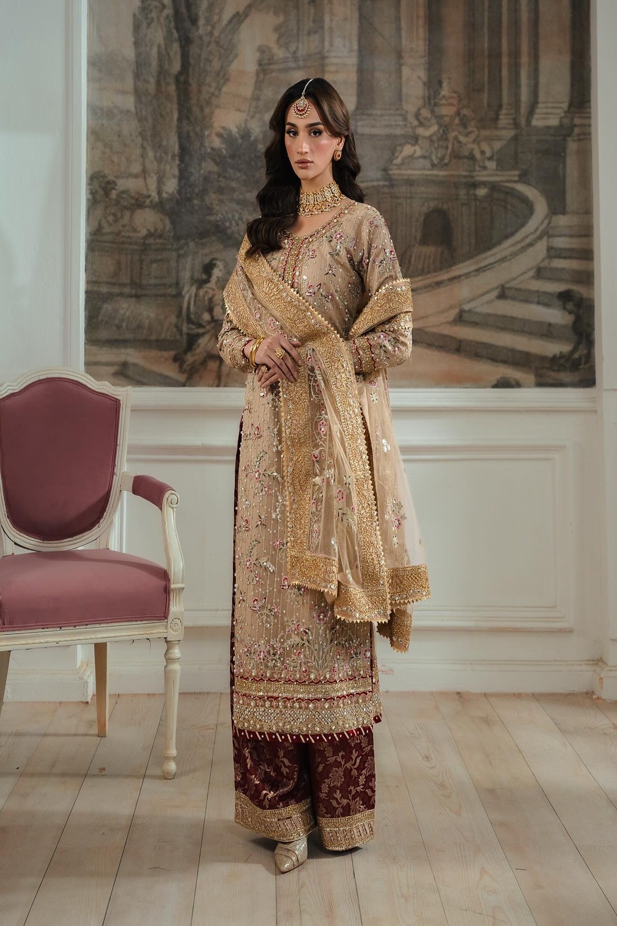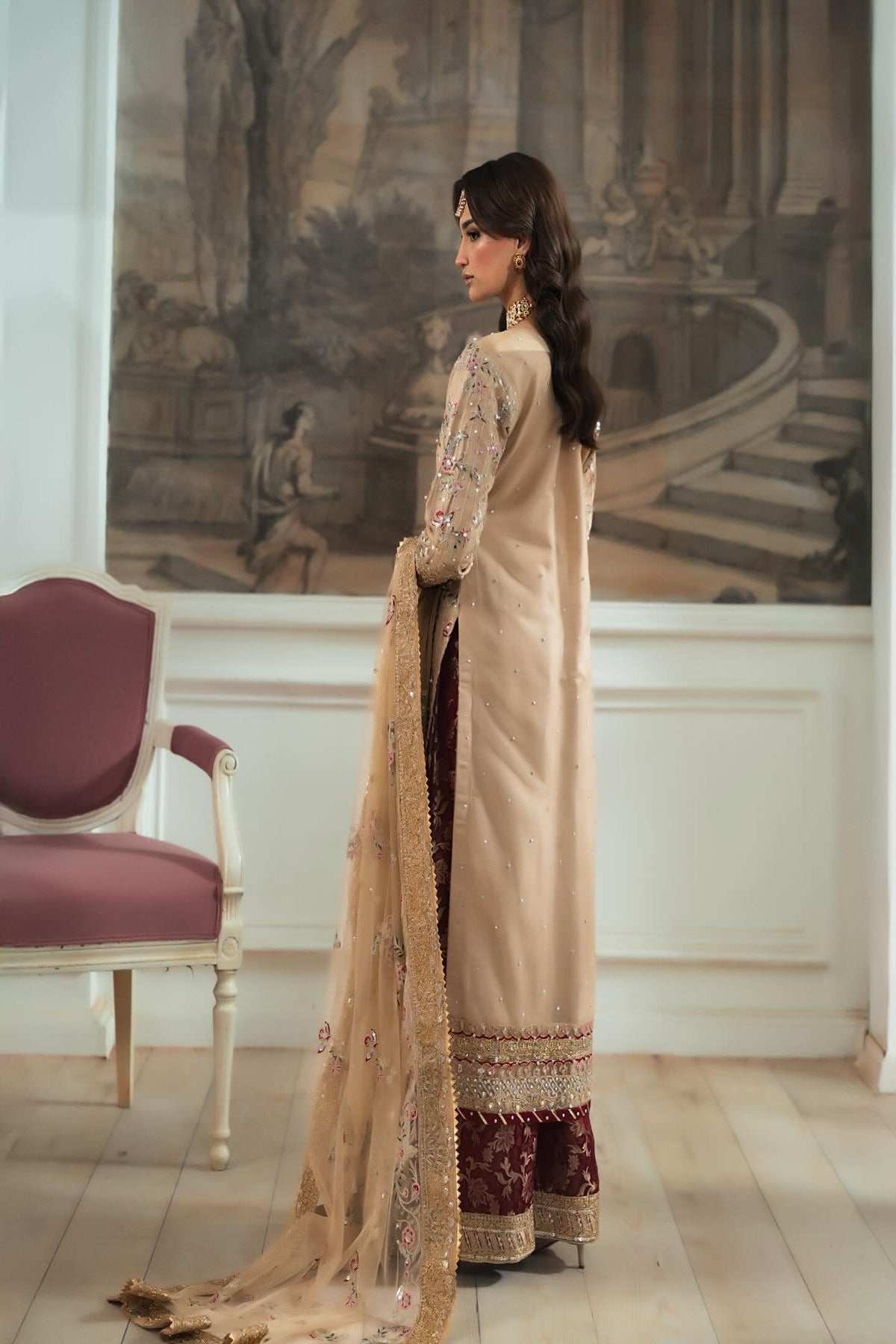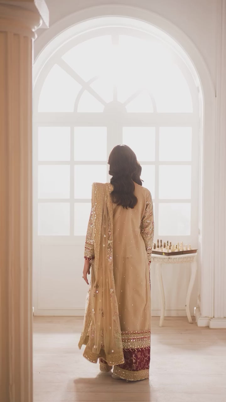 Introducing “Bahisht”, a statement piece that embraces the modern allure. This ensemble features a beige long kameez with contrasting maroon wide trousers.