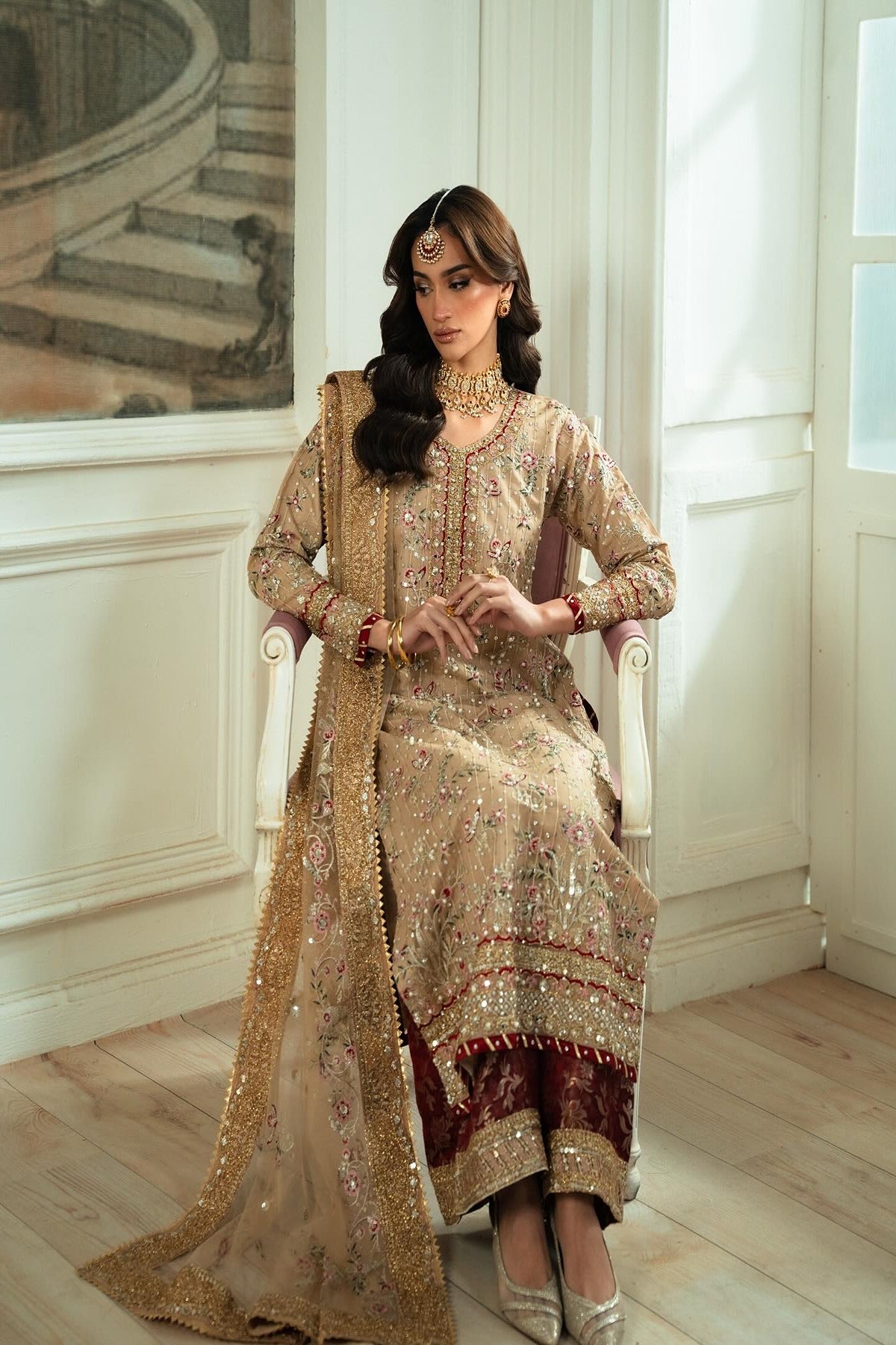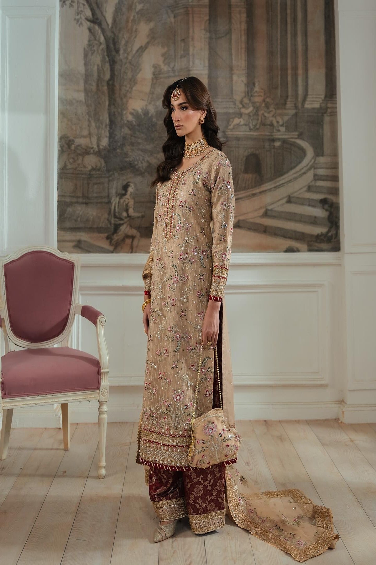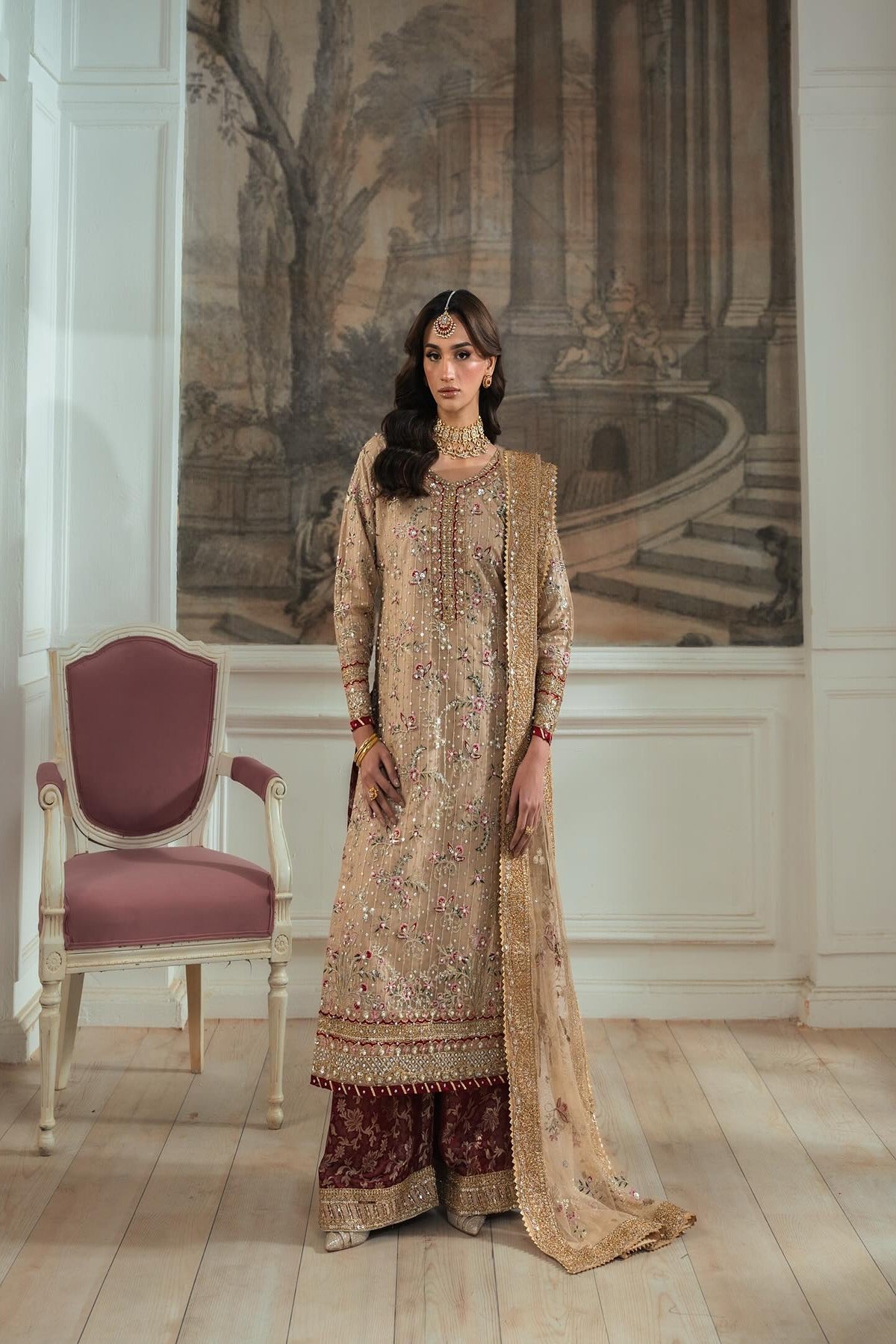 Introducing “Bahisht”, a statement piece that embraces the modern allure. This ensemble features a beige long kameez with contrasting maroon wide trousers.