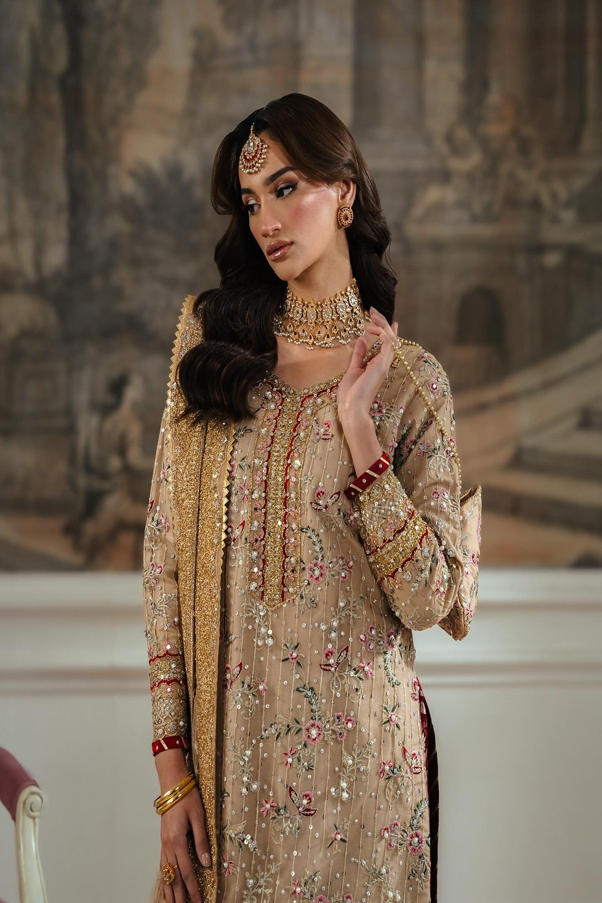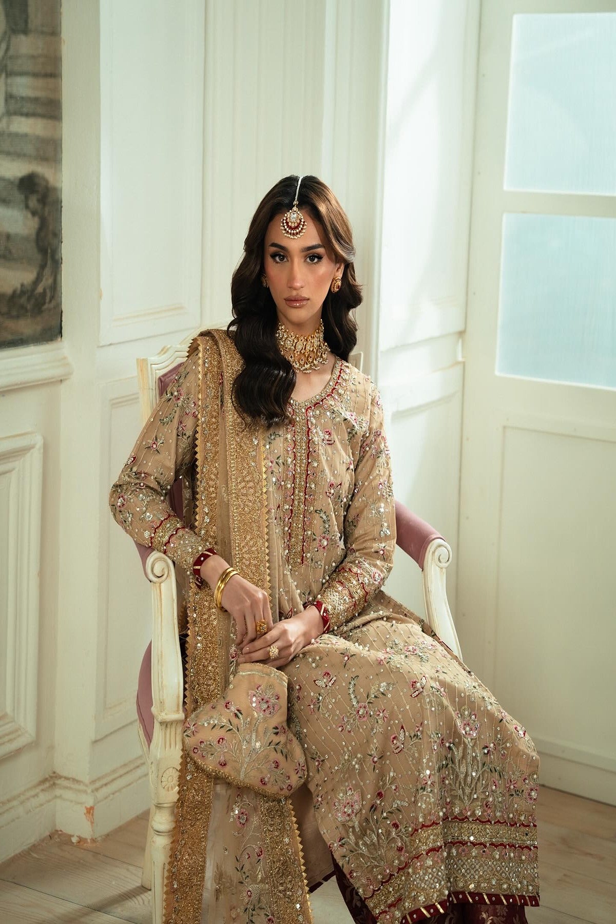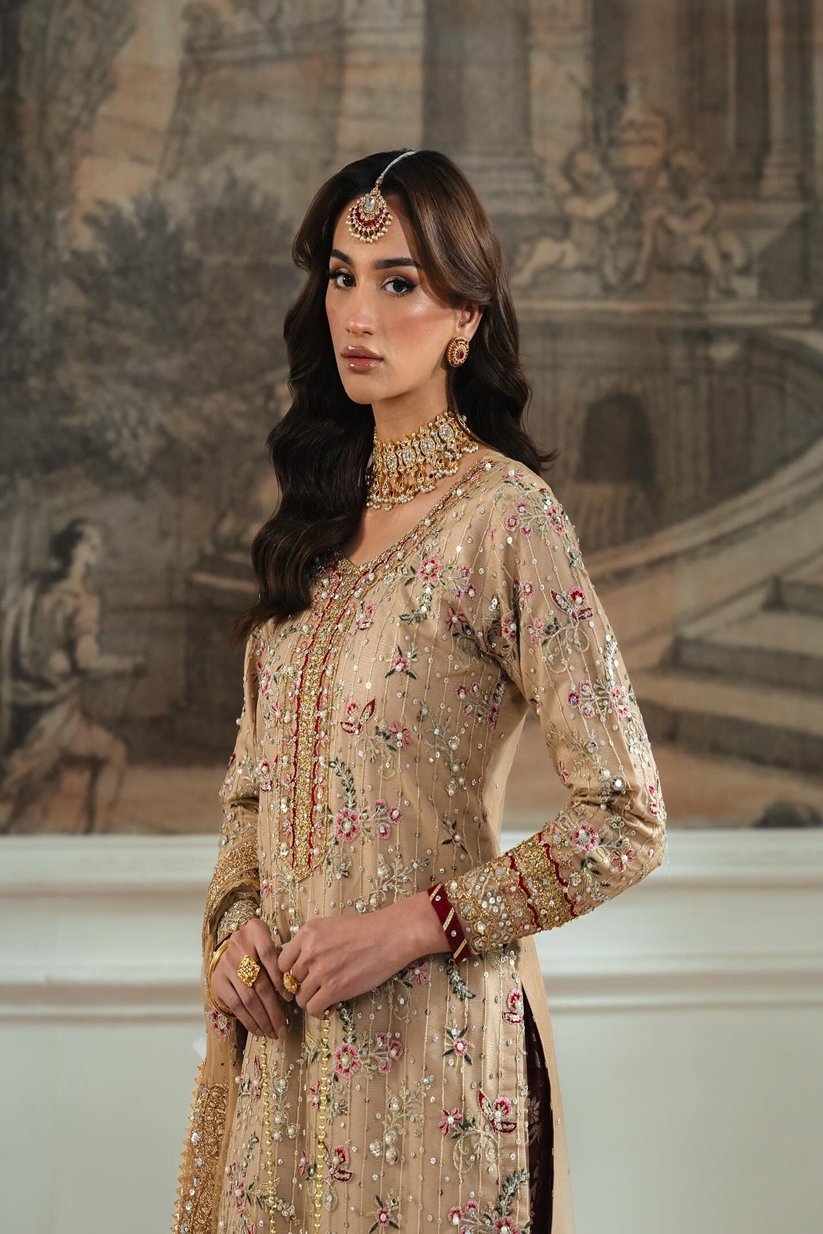 The kameez showcases embroidered floral motifs in delicate resham threadwork, shimmering sequins, and beadwork. The embroidery features intricate zari and dabka work with soft accents of pink, green, and gold that add subtle vibrancy to the design. The hemline is enriched with a heavily embroidered border featuring geometric and floral patterns, further enhanced with gorgeous beadwork. Paired with the kameez are rich maroon trousers made from jamawar fabric featuring floral patterns and adorned with intricately embroidered borders. Completing the look is a sheer net dupatta in a soft beige hue. The dupatta is adorned with delicate floral embroidery, gold borders, and scattered floral motifs and sequins.