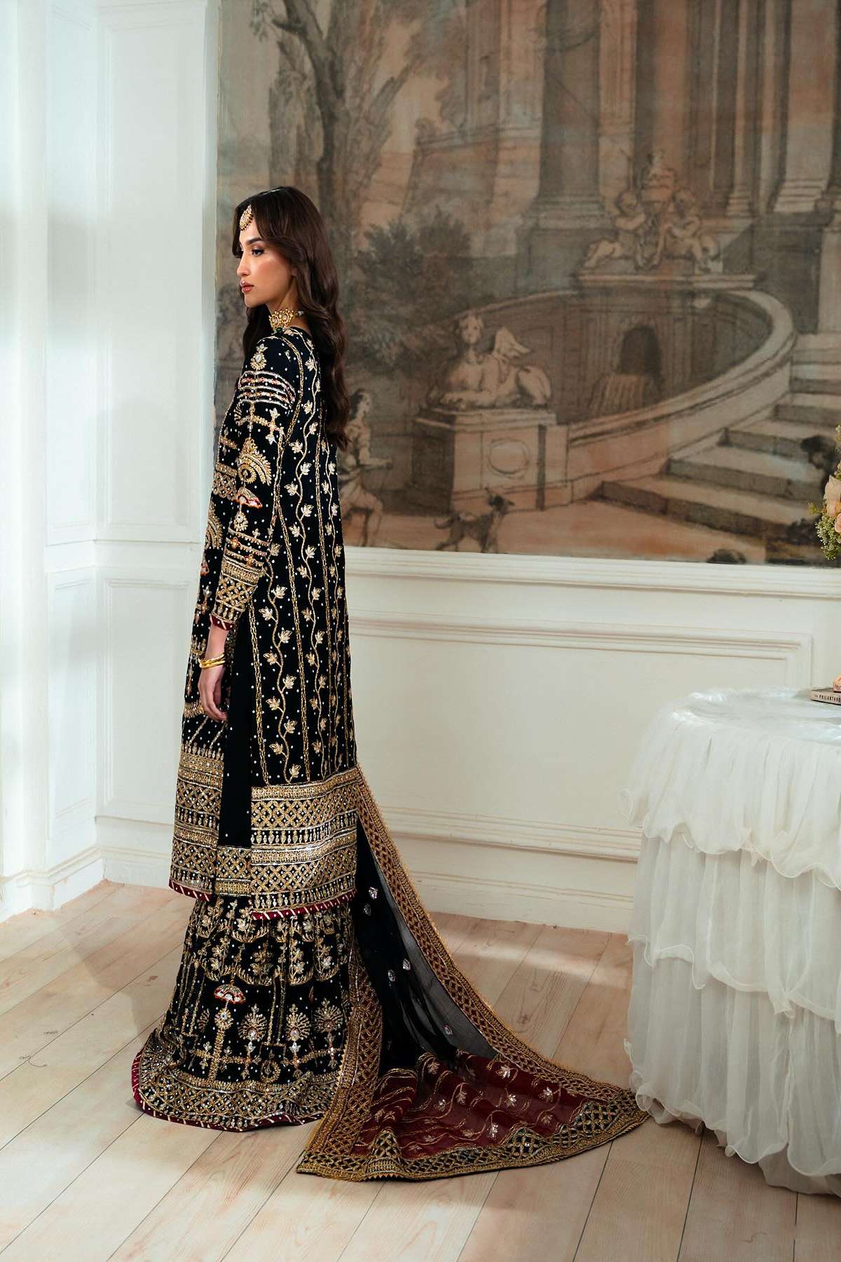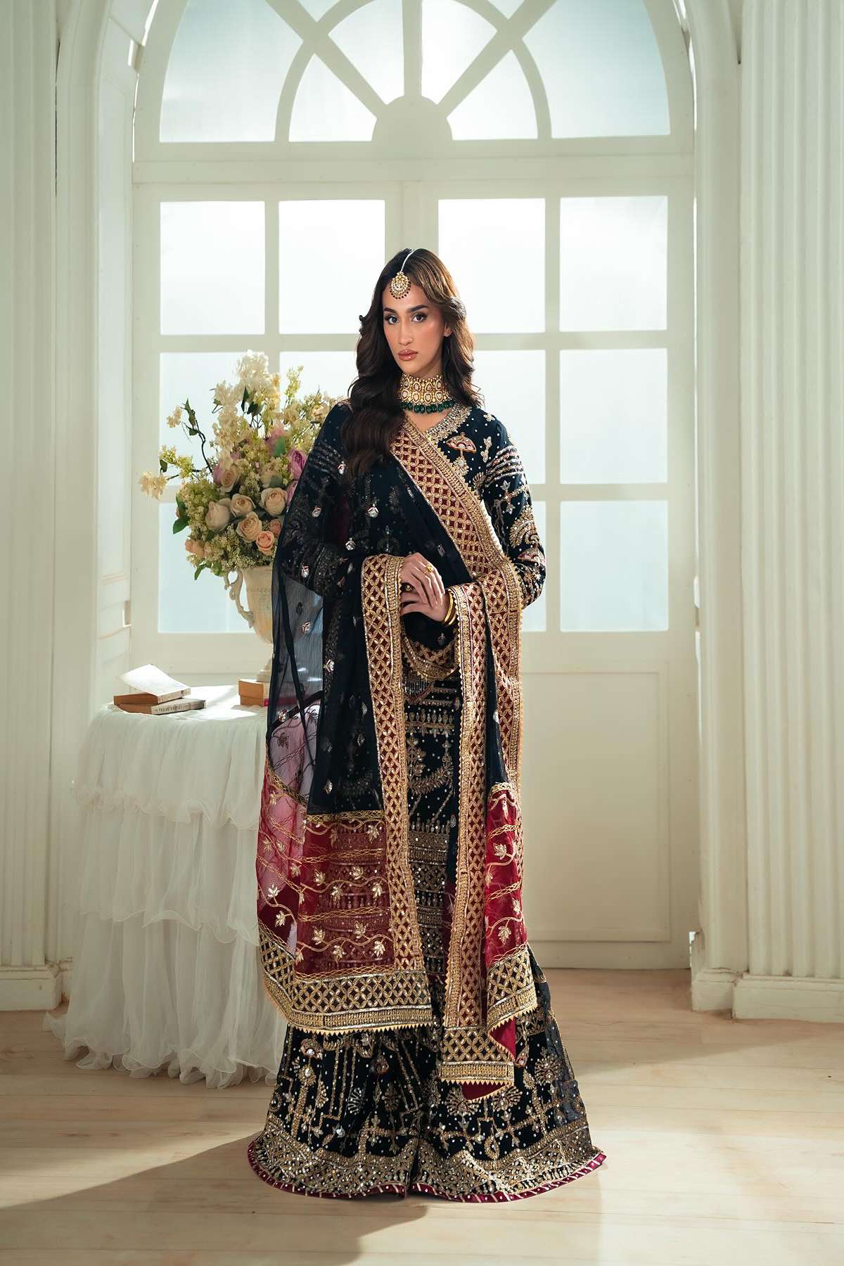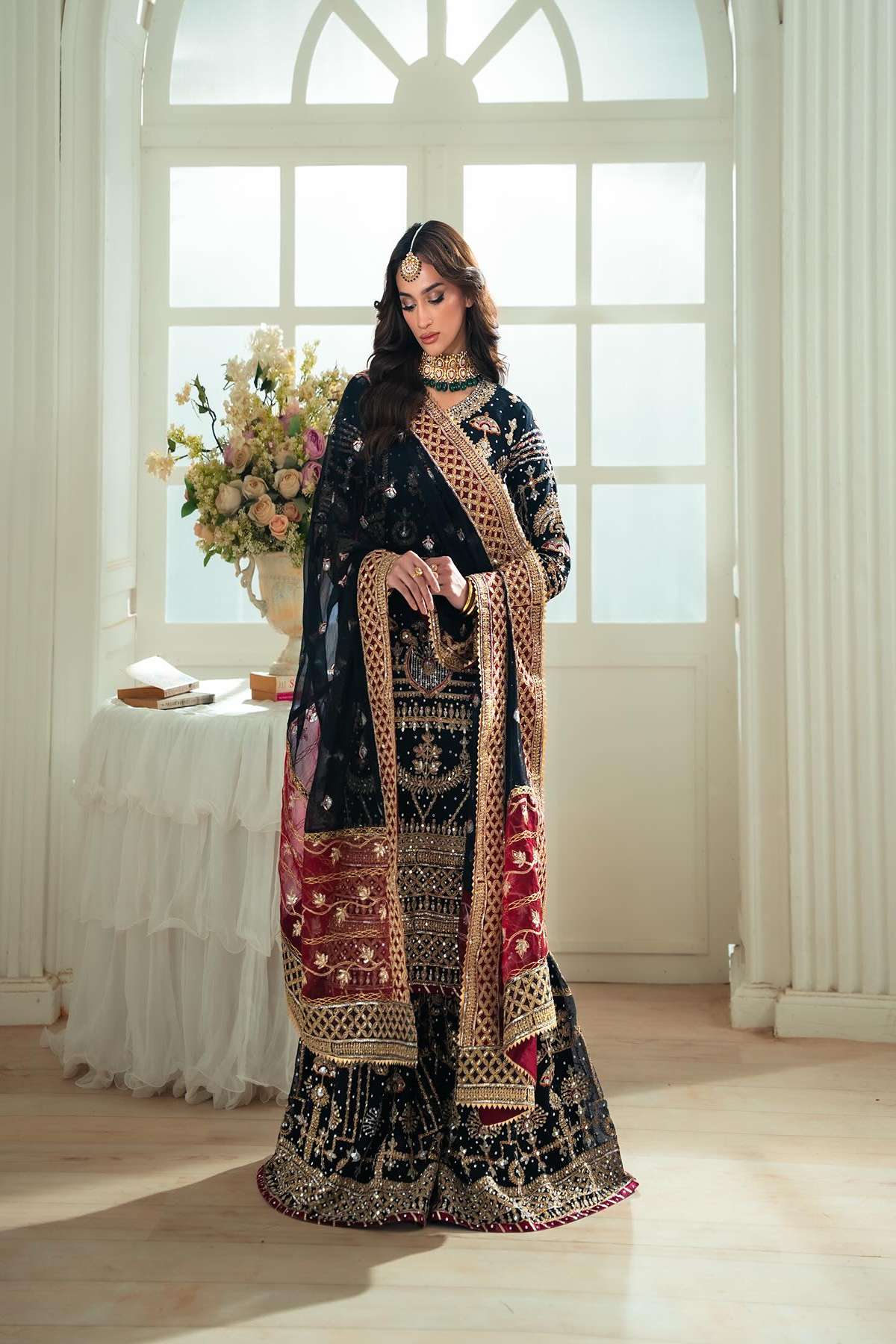 impeccable craftsmanship. This ensemble features a long black kameez and a matching lehenga.
