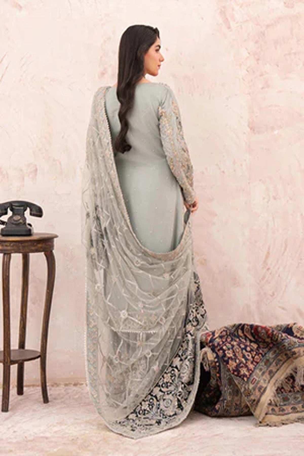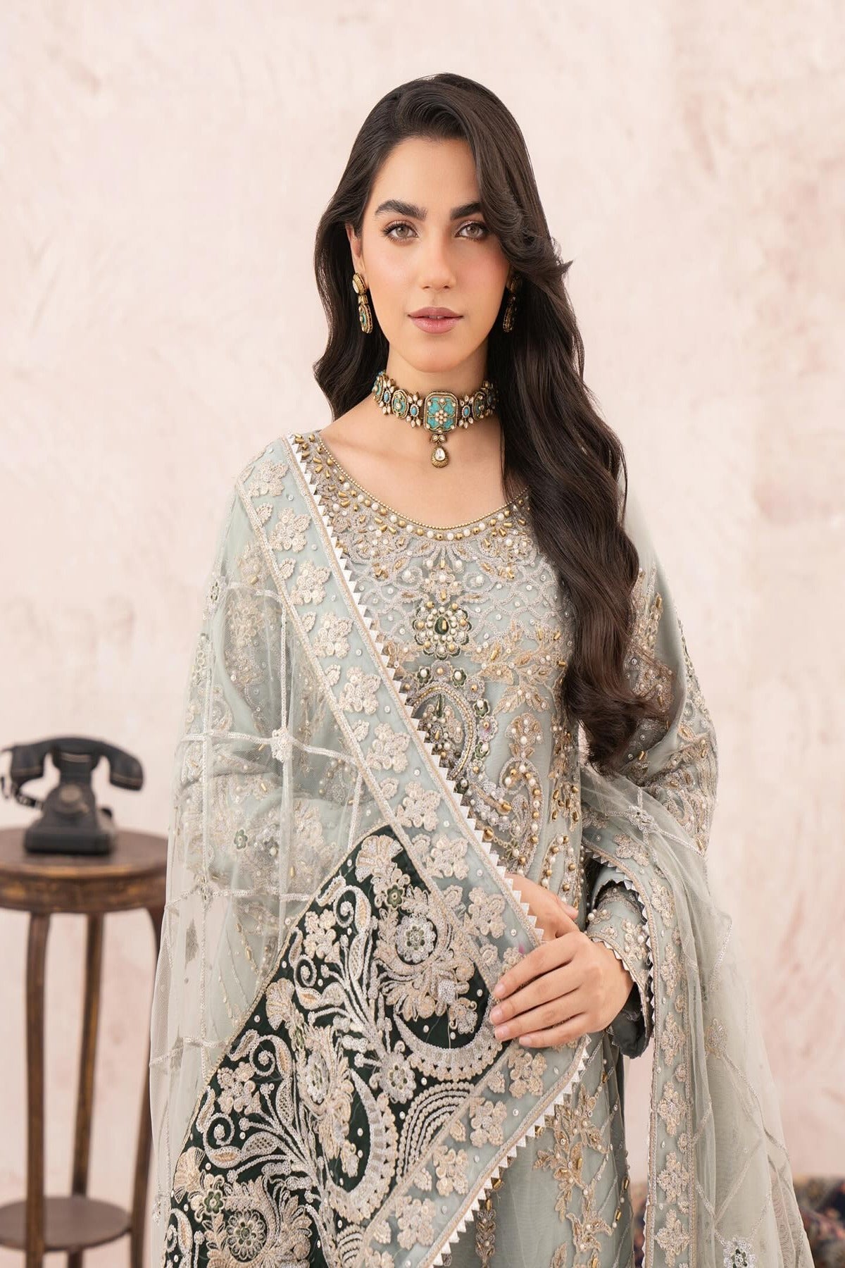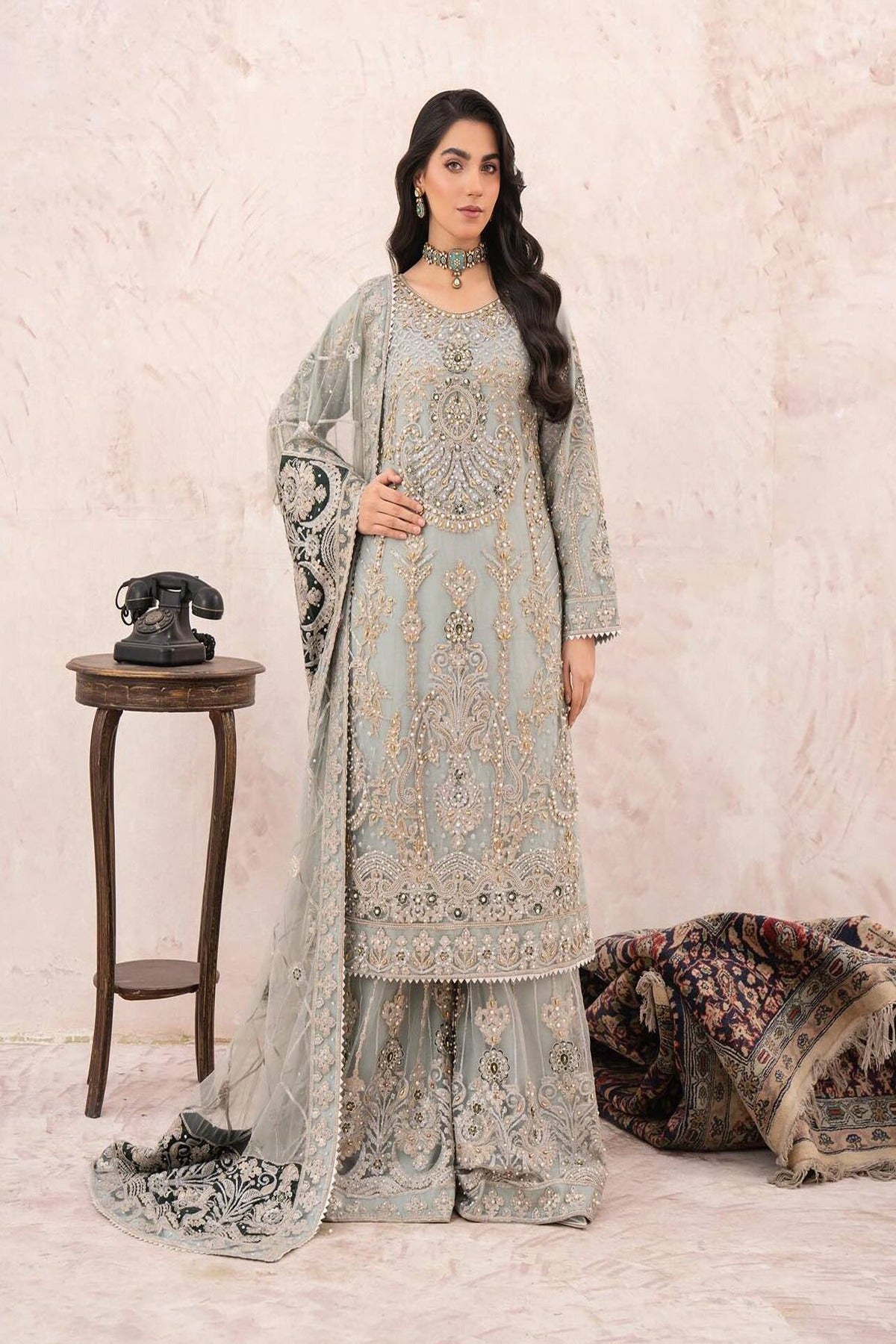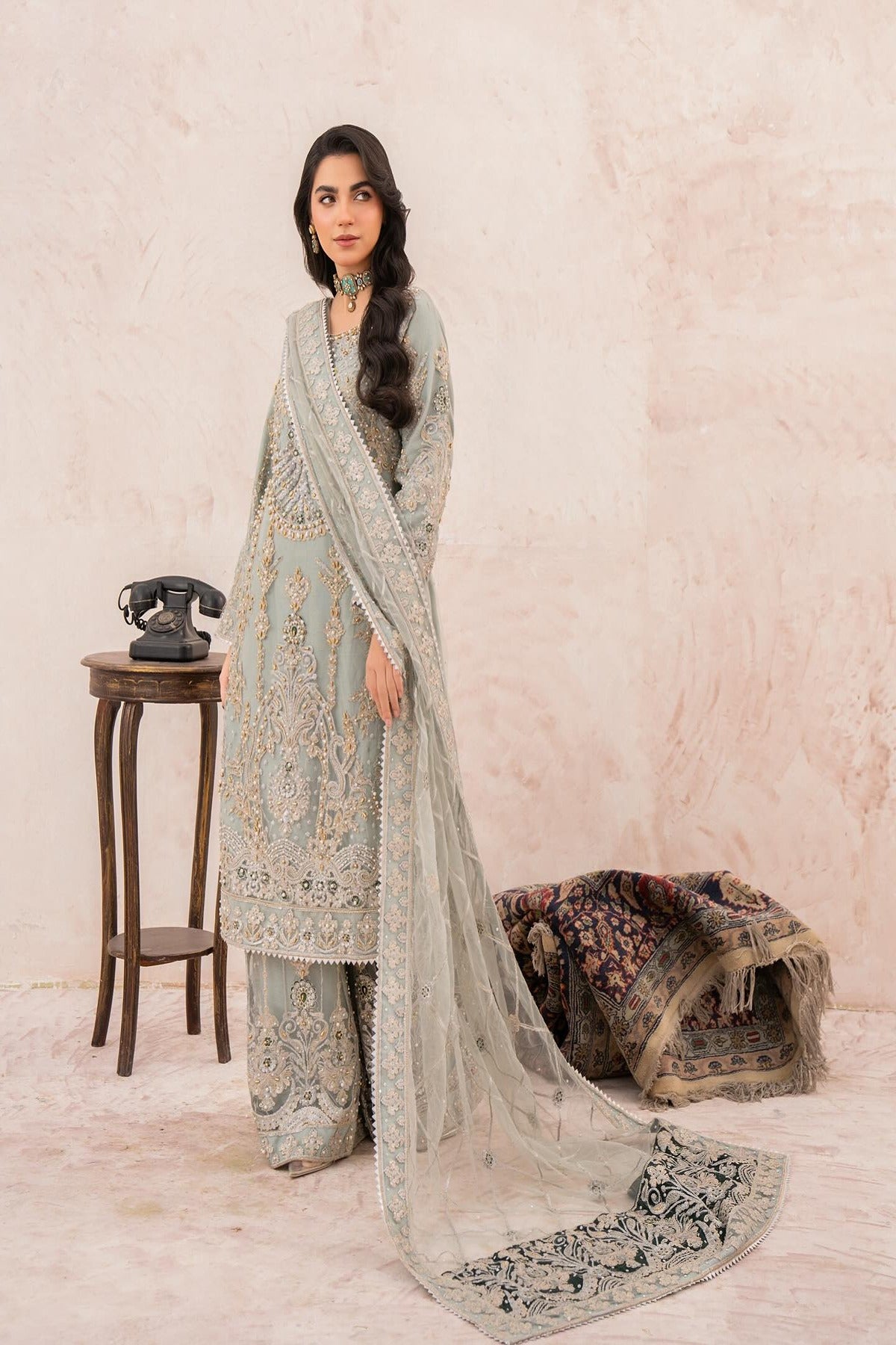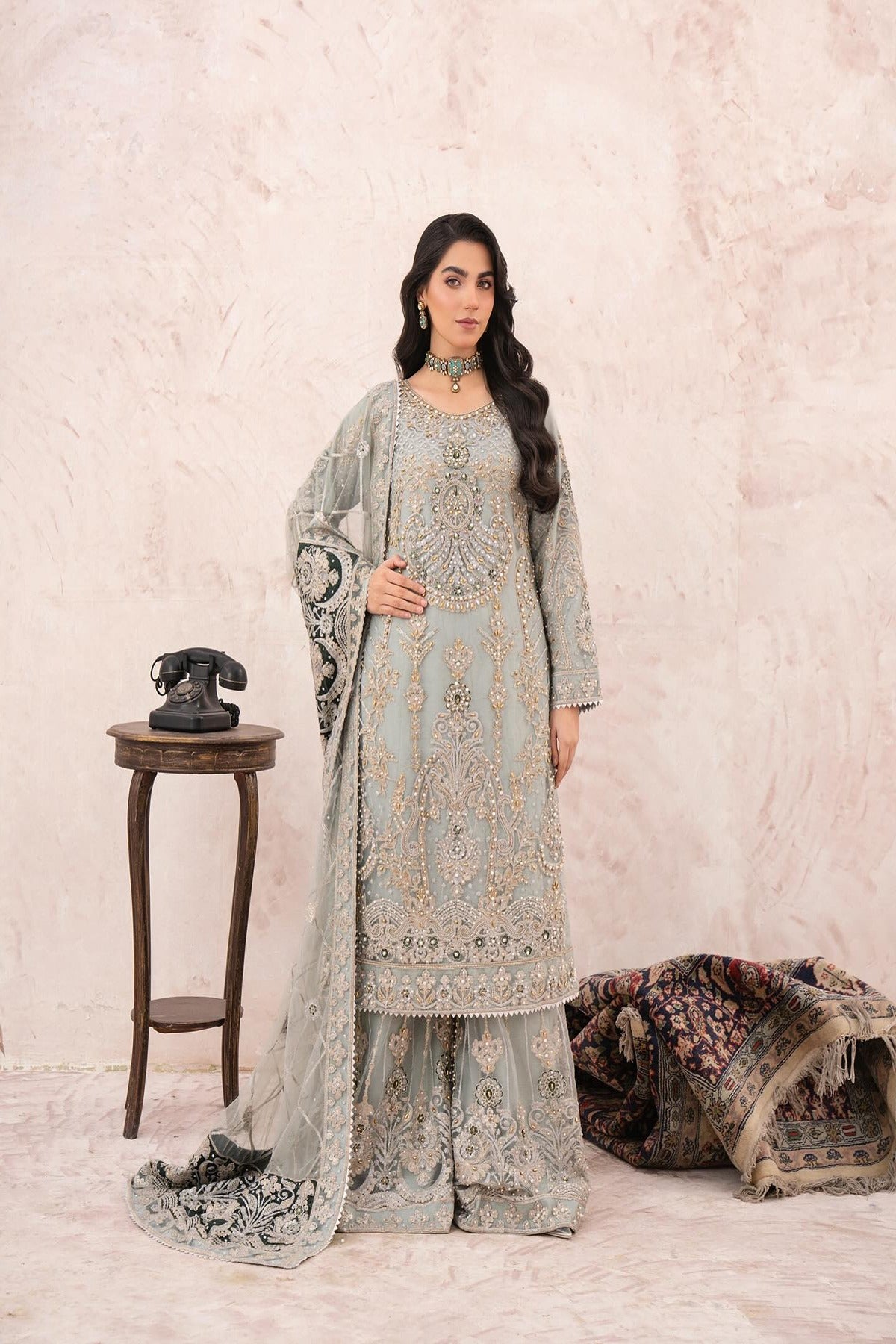 Jahnvi, this oft seafoam ensemble is a perfect blend of tradition and sophistication. The straight-cut shirt is adorned with intricate embroidery in champagne gold, pearls, and hints of emerald, creating a regal yet delicate look. Paired with matching wide-leg pants and a fully embellished dupatta, this outfit is ideal for wedding festivities and formal evening events.
