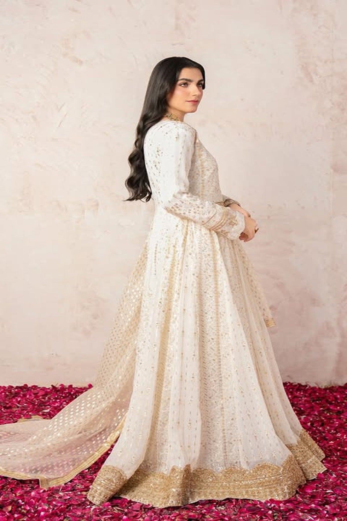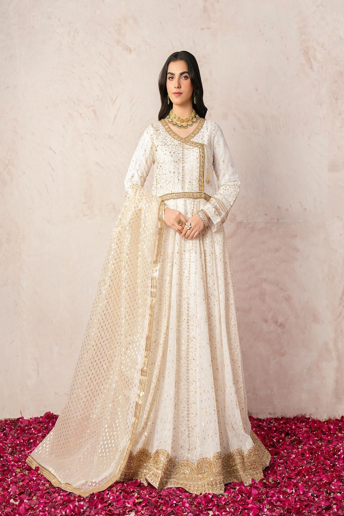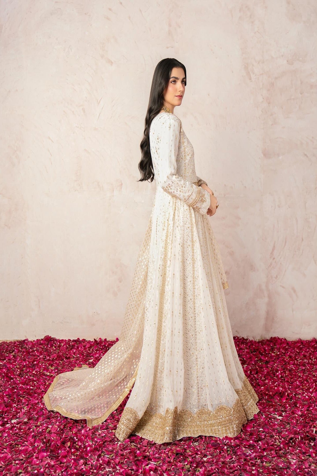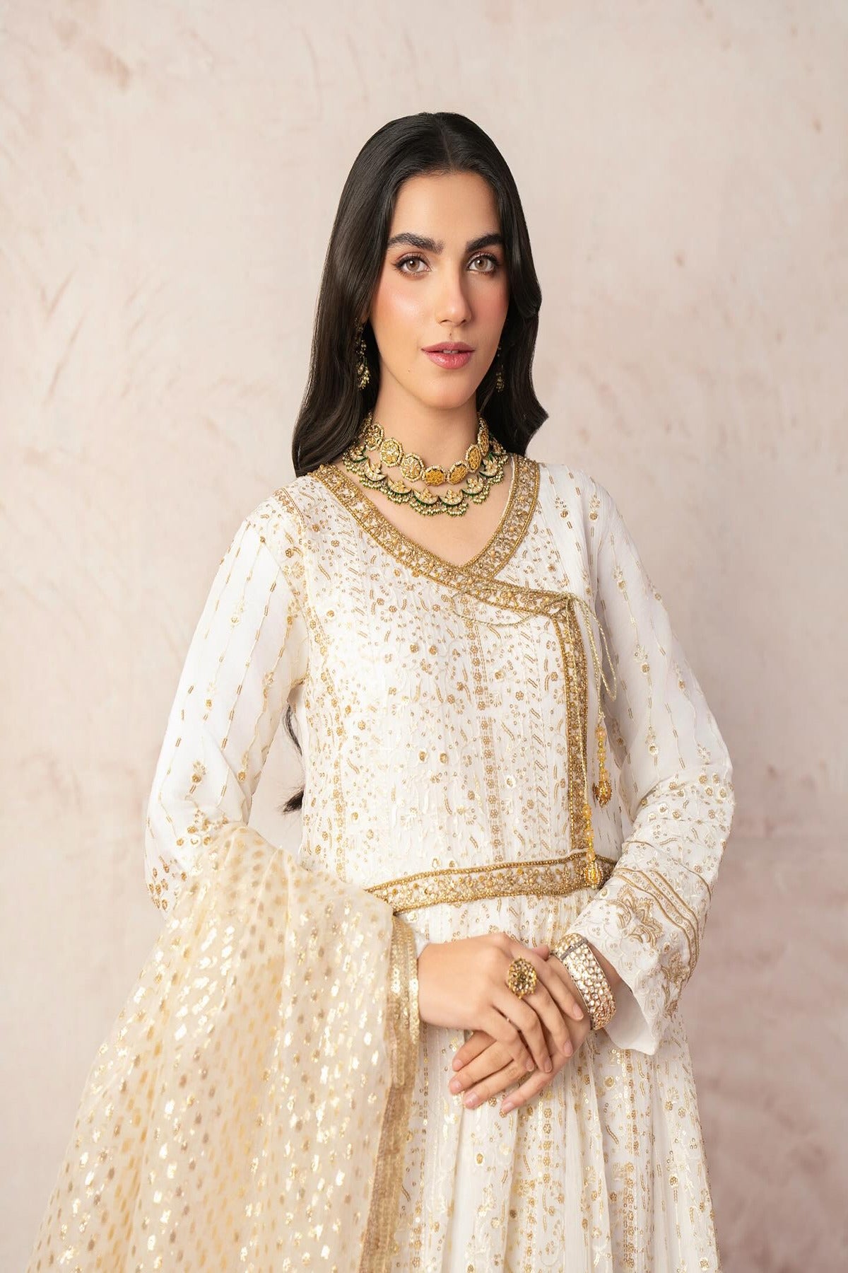 Mehrma is a festive favourite crafted in delicate chiffon with its flowing angrakha silhouette, kissed with golden details and timeless grace. Like poetry in motion, it celebrates the beauty of tradition with every twirl.