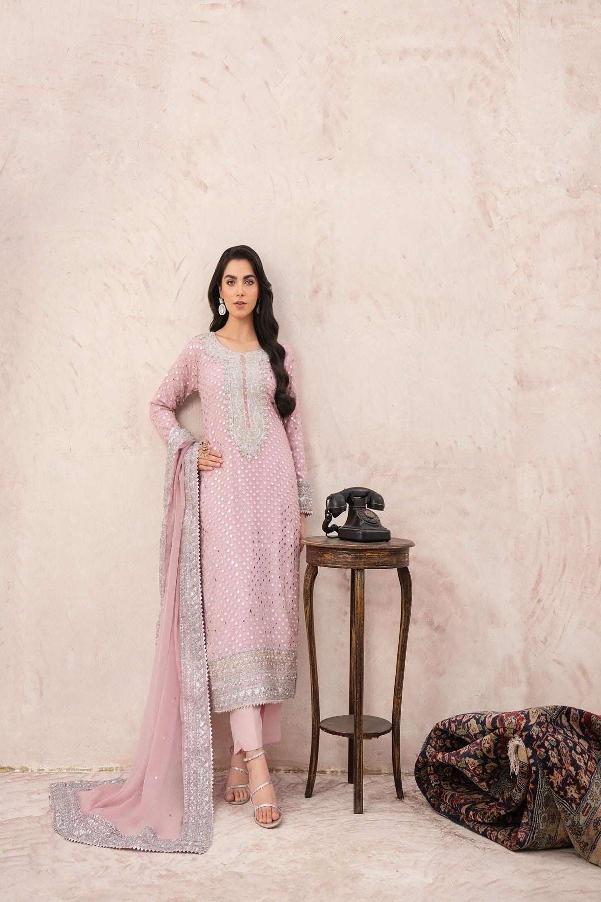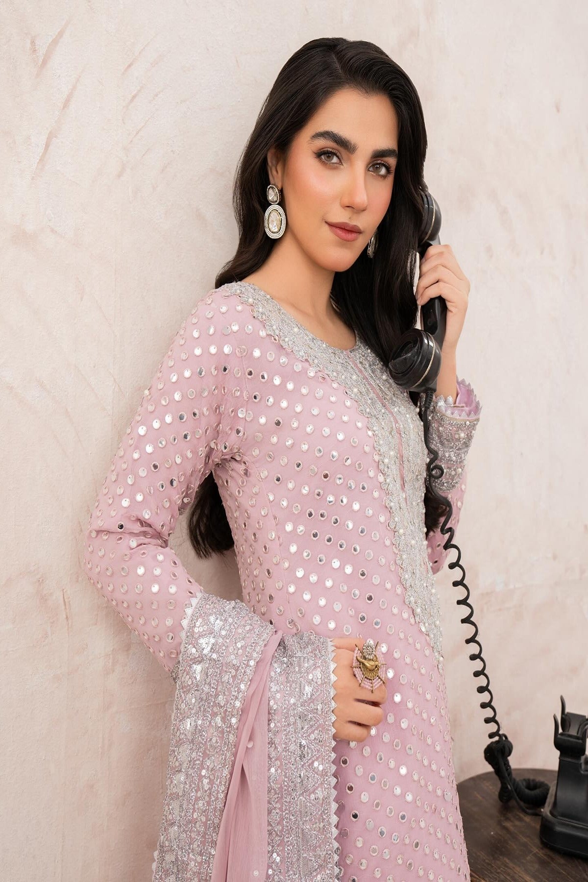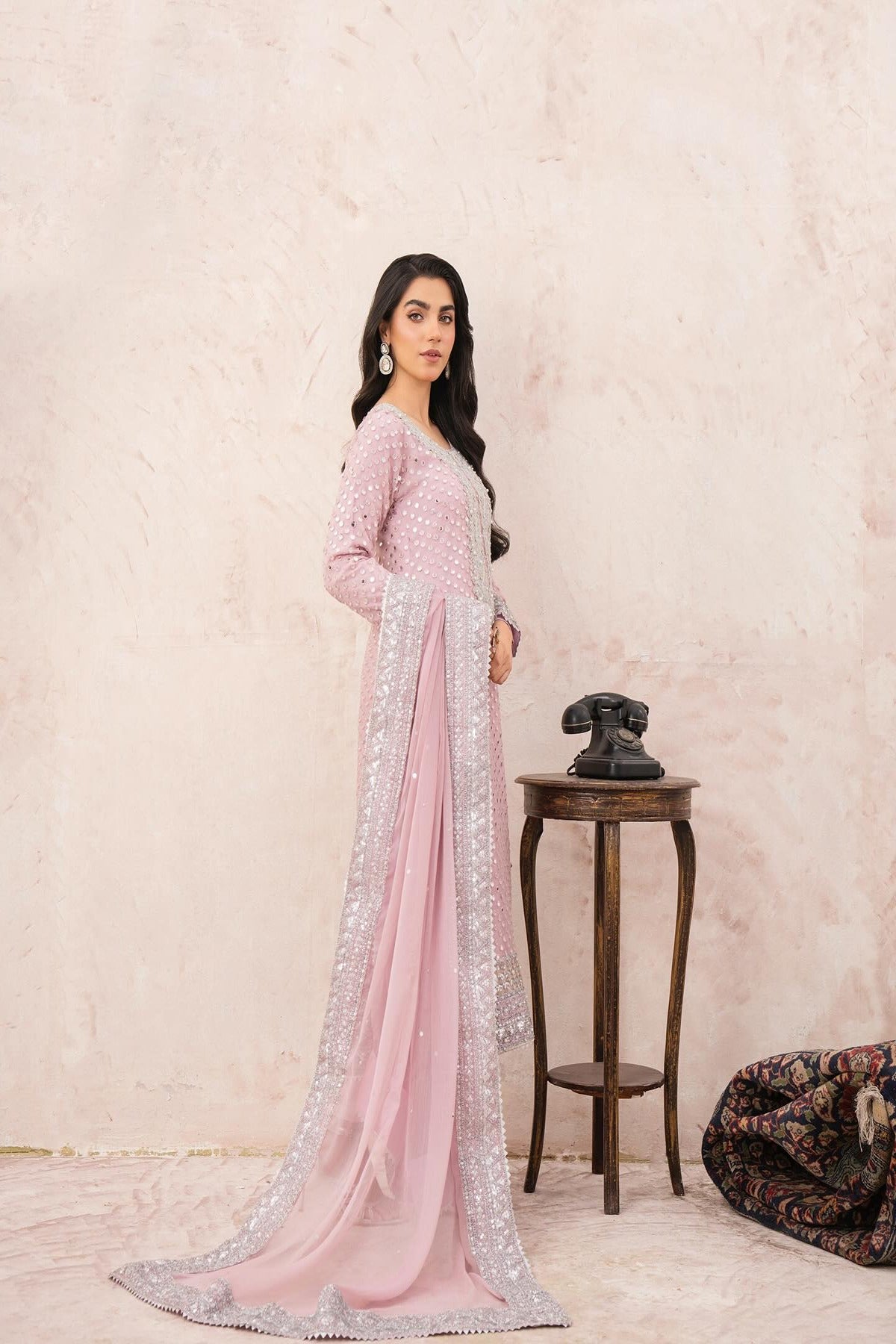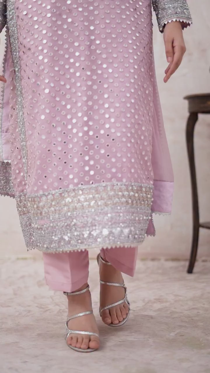 “Roohi”, a graceful long silhouette in soft pink adorned with all-over silver mirror work and thread embellishments. The look is completed with a sheer dupatta finished with an ornate silver border, making it a perfect pick for pre-wedding festivities and intimate celebrations.