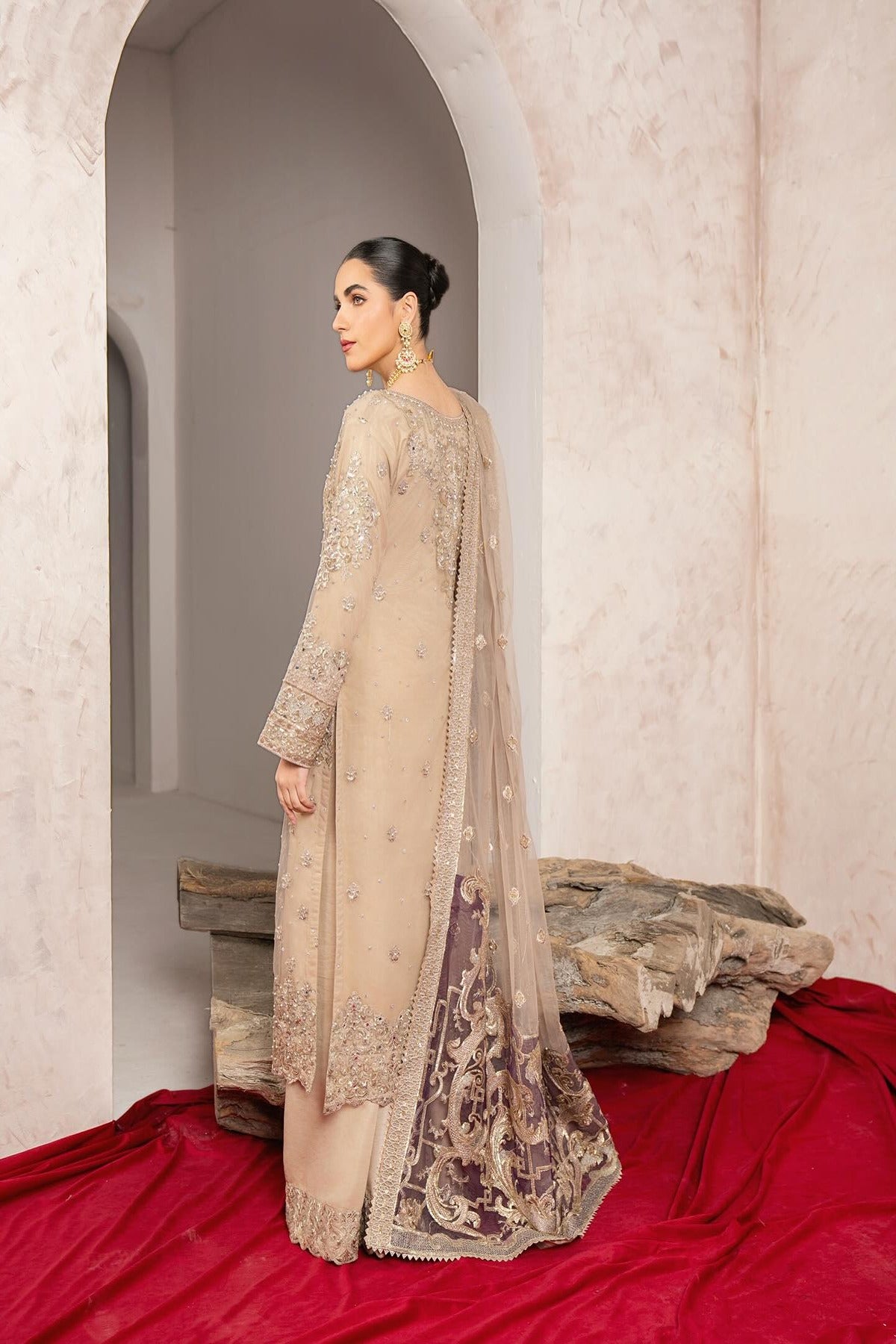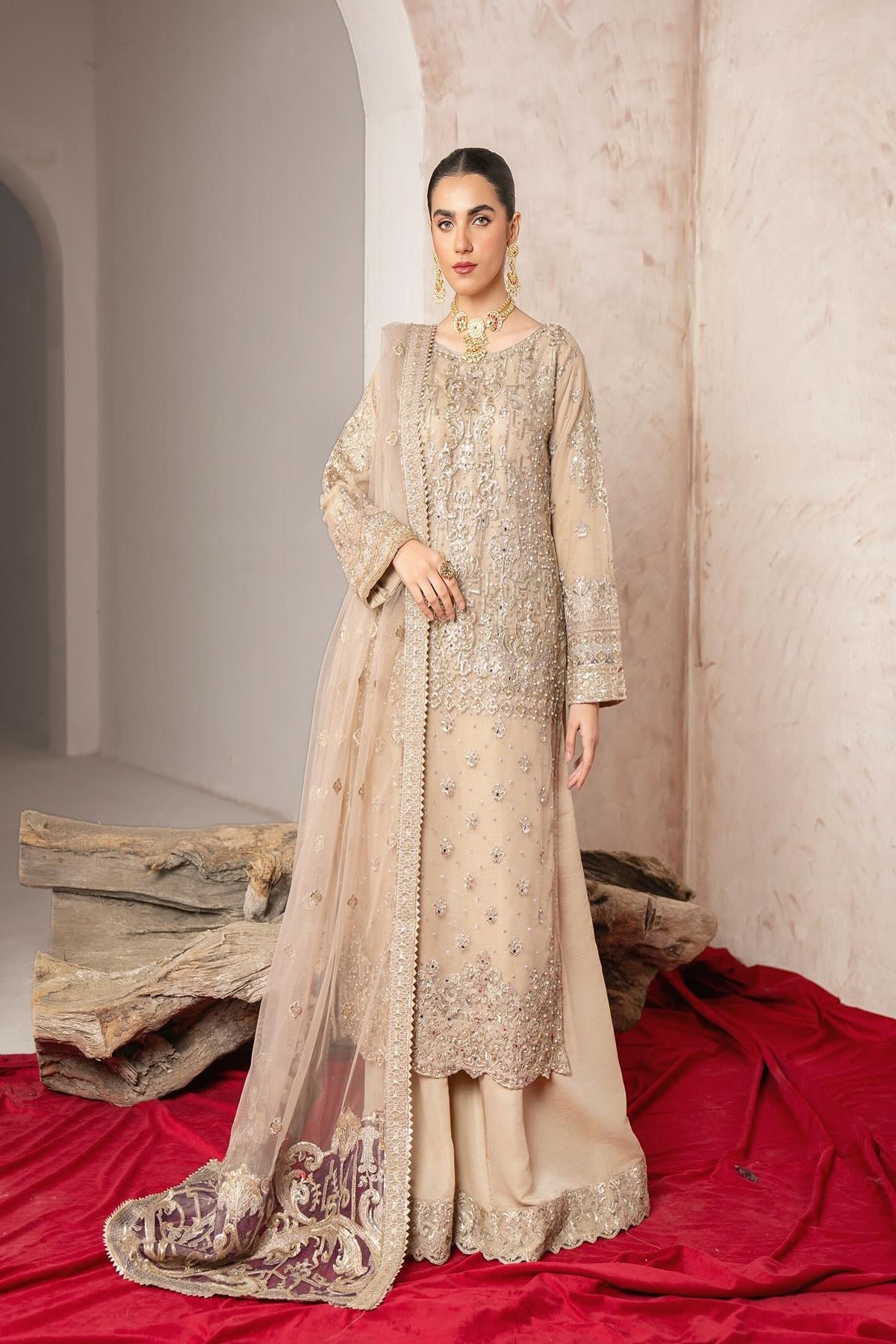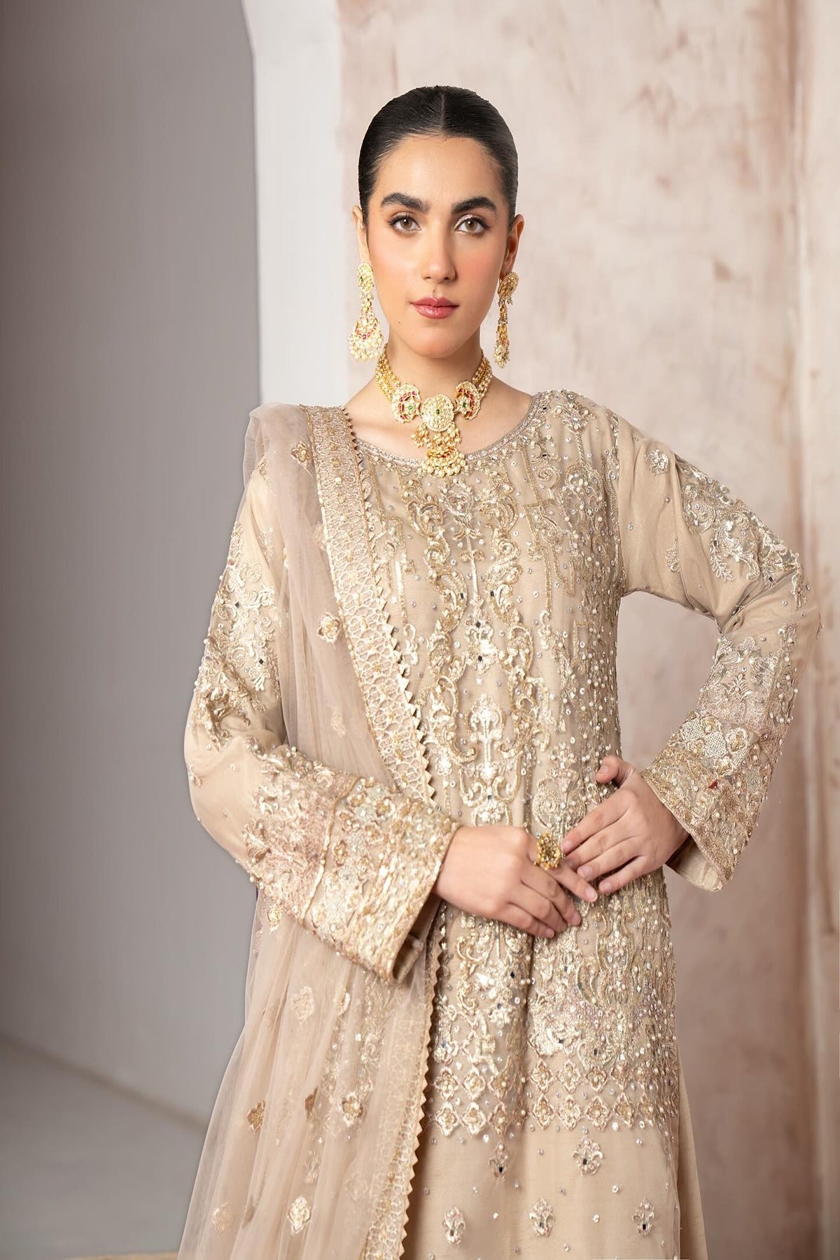 Zareena is a timeless ensemble crafted in a soft beige hue, adorned with intricate handwork that shimmers with silver and antique gold embellishments. The long kameez is paired with a richly detailed bottom and a net dupatta featuring embroidered borders and regal motifs. A blend of tradition and sophistication, Zareena is perfect for intimate festivities and wedding soirées.