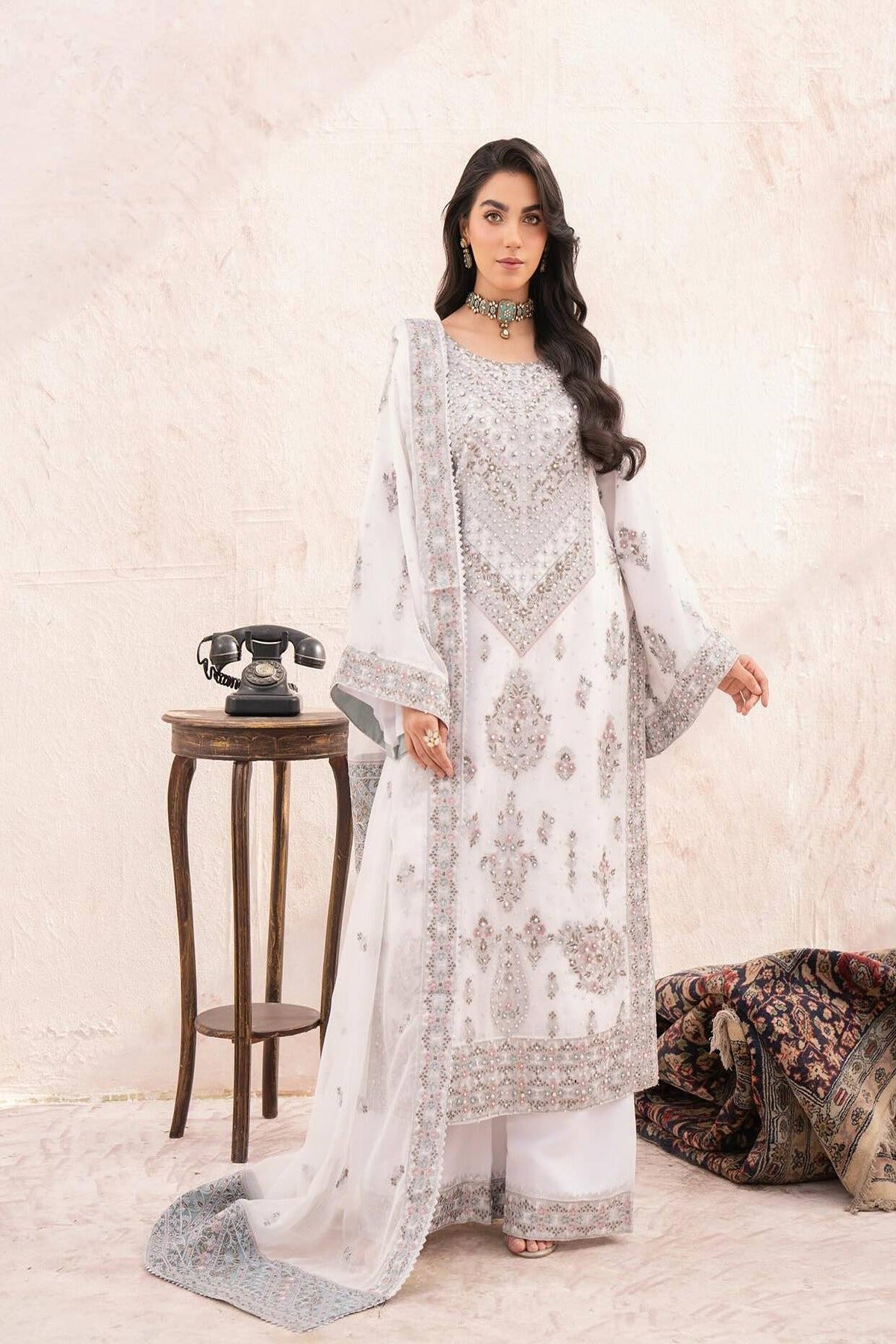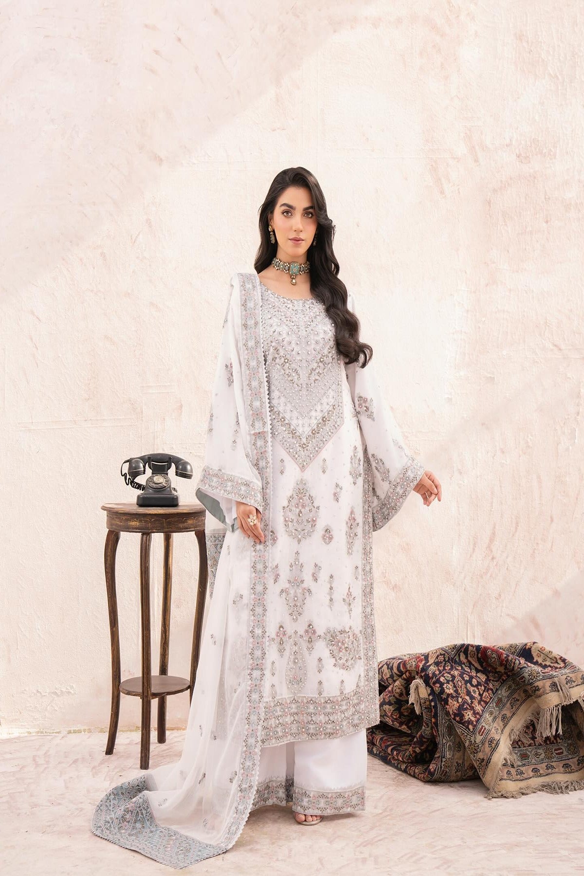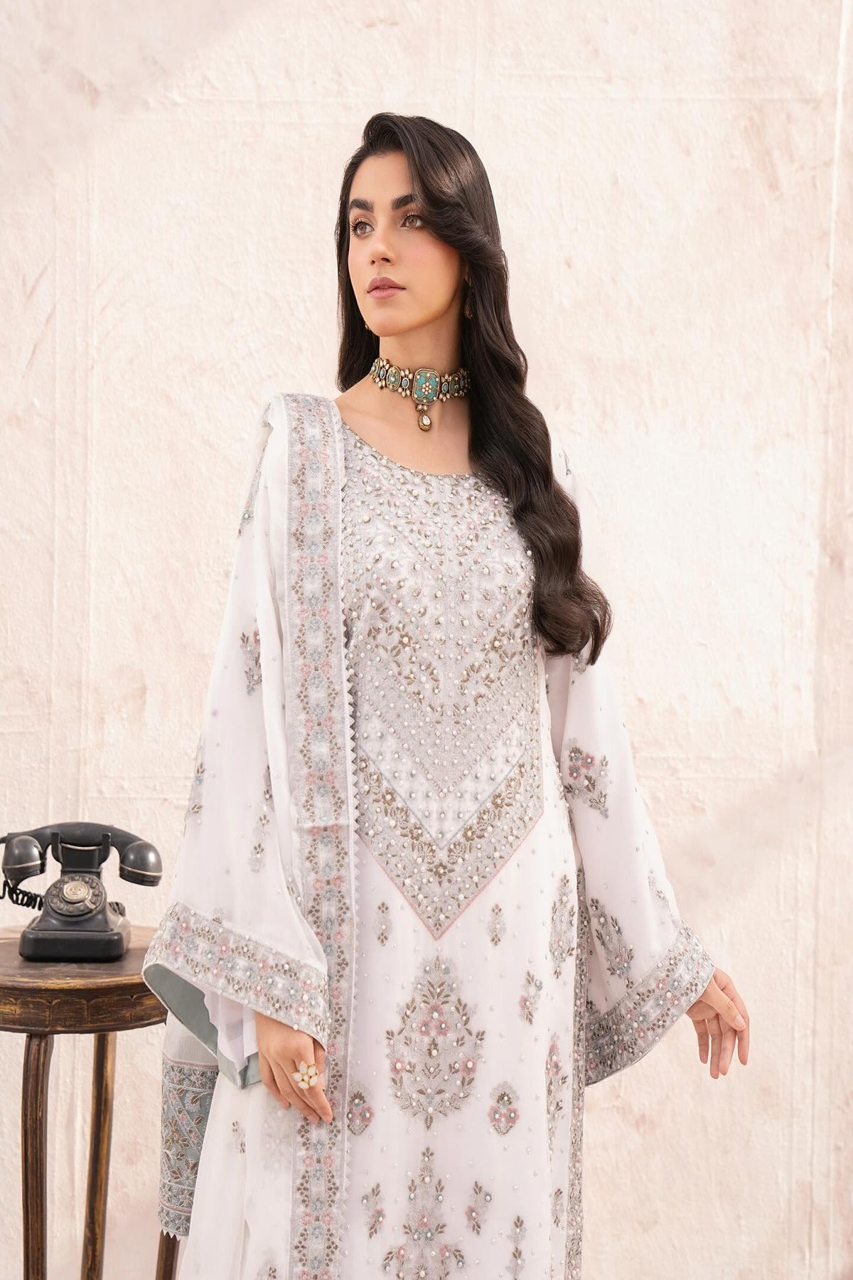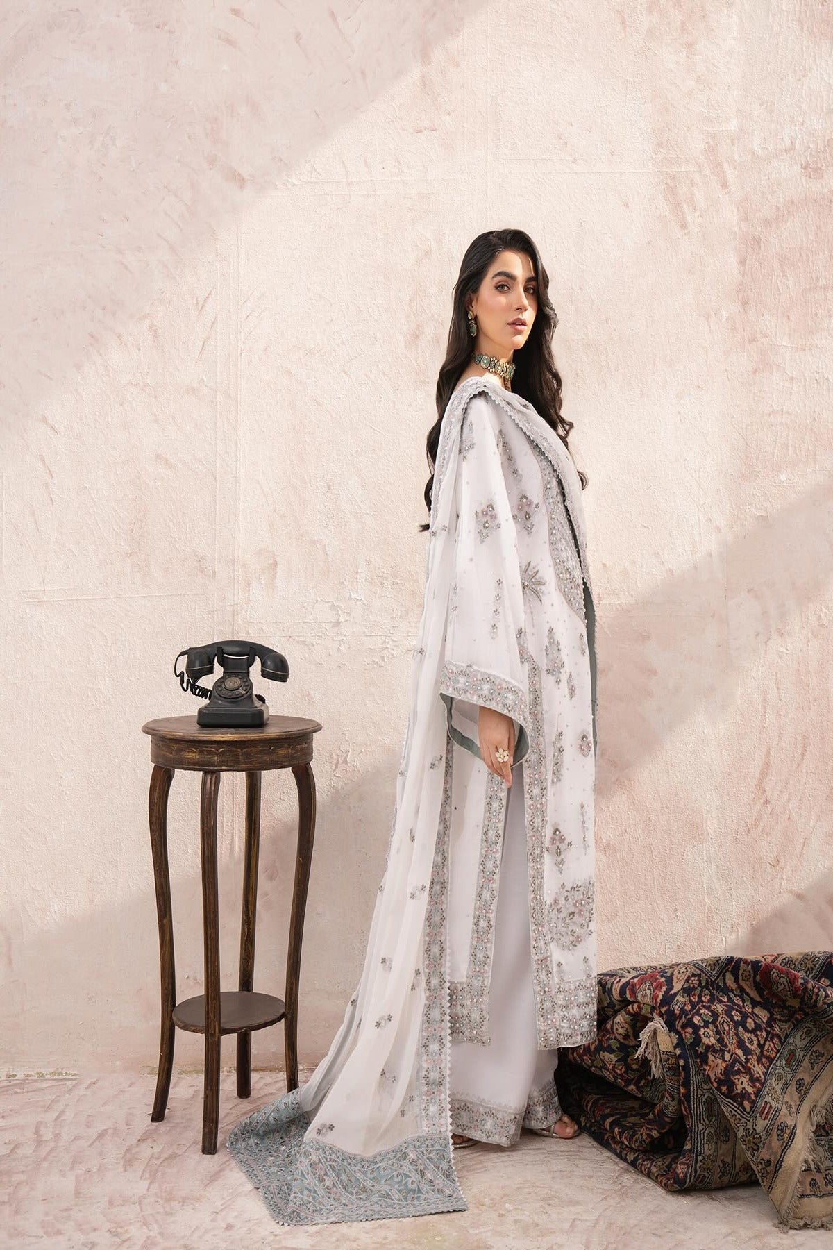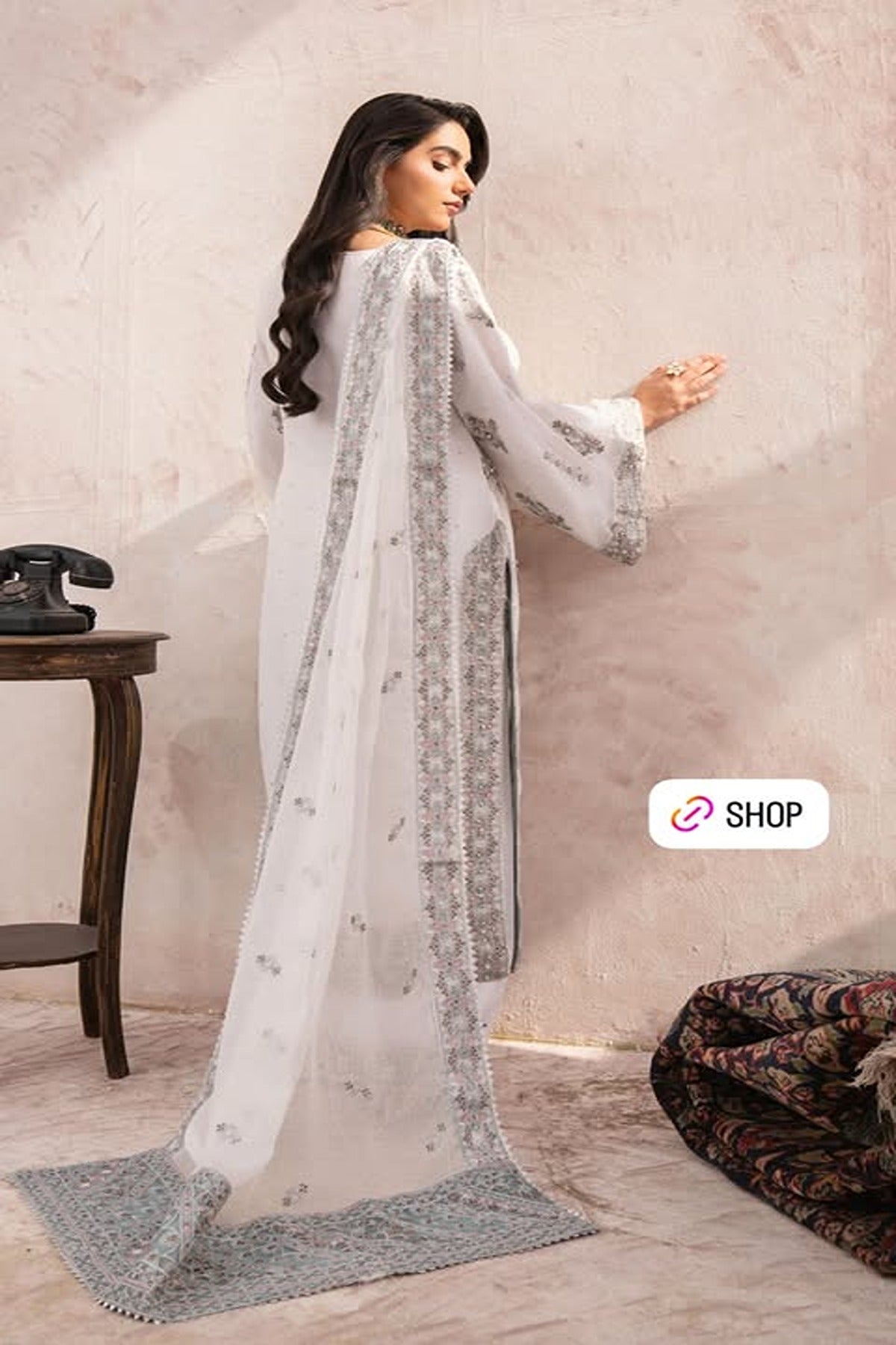 Zimaal, an legant white ensemble featuring intricate silver and pastel pink embroidery arranged in a symmetrical, ornate pattern. The shirt is styled with a straight cut and paired with wide-leg trousers and a matching embellished dupatta. Refined and versatile, it’s an ideal pick for daytime festivities and intimate wedding events.