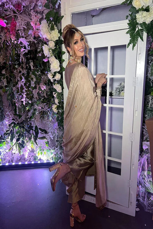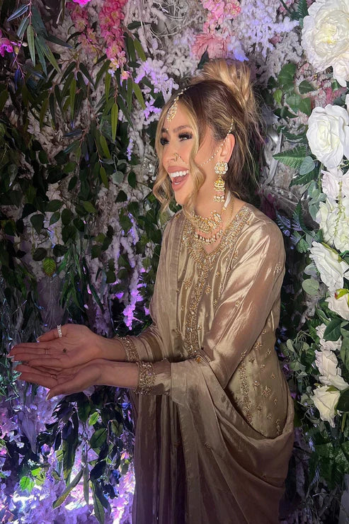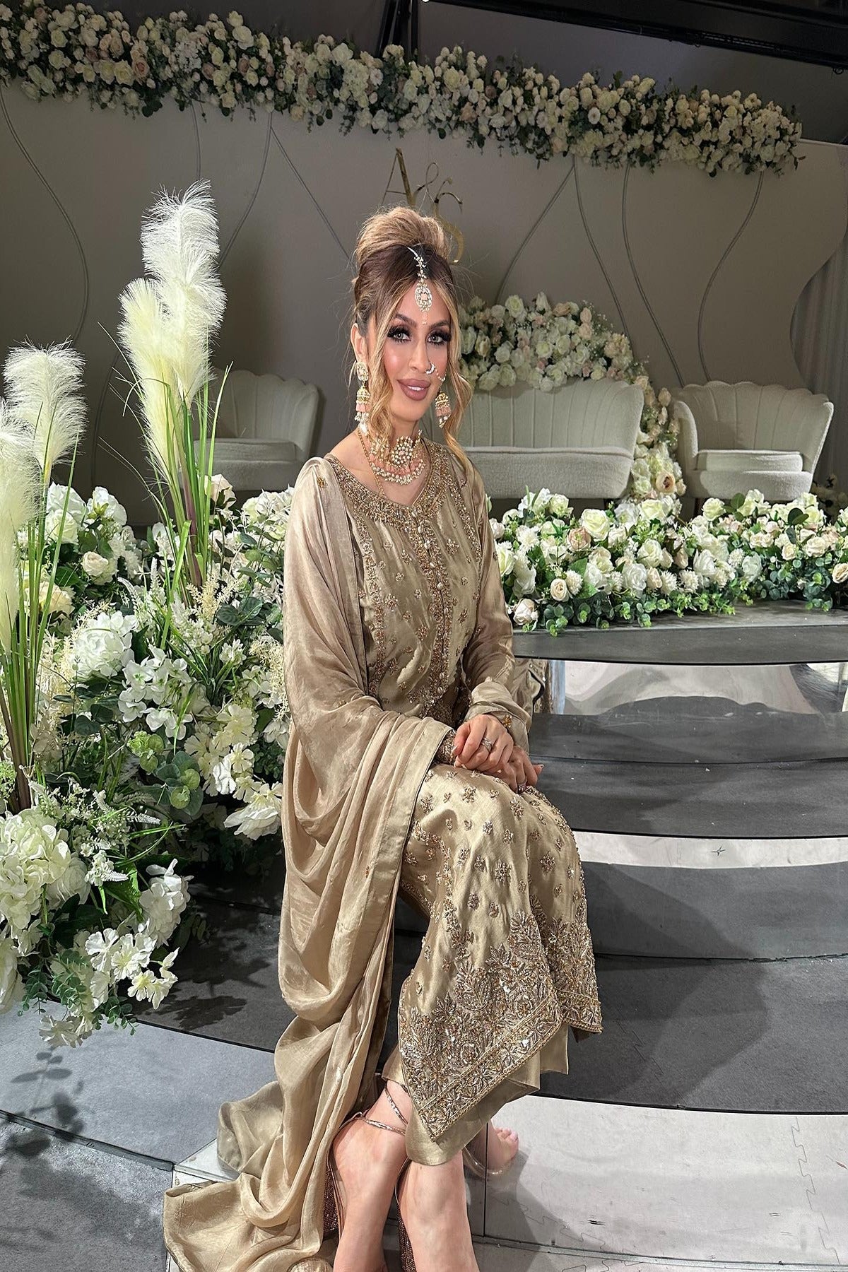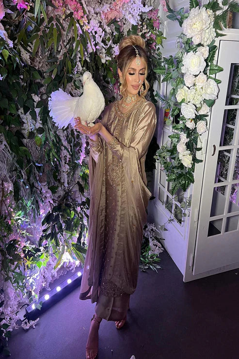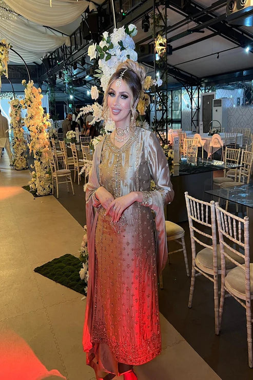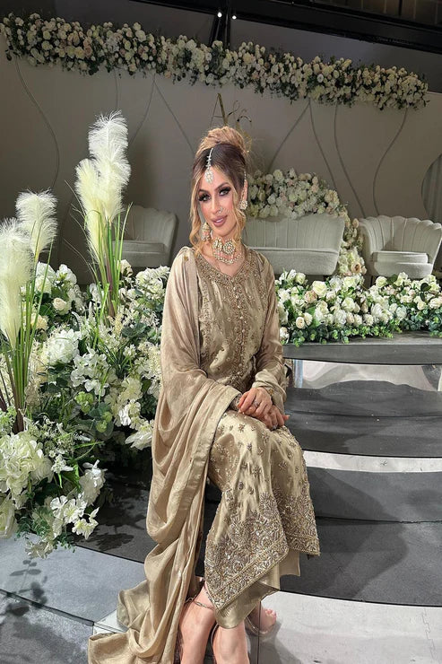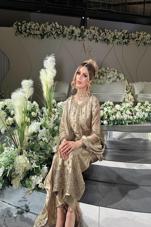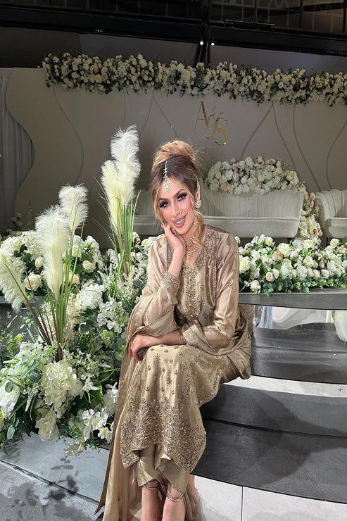 This luxurious three-piece ensemble is meticulously crafted from the finest premium tassel silk, exuding elegance and sophistication. The shirt is adorned with exquisite hand-embellishments, featuring intricate dabka, shimmering sequins, delicate zari, and sparkling crystals, creating a statement look that is both regal and timeless.