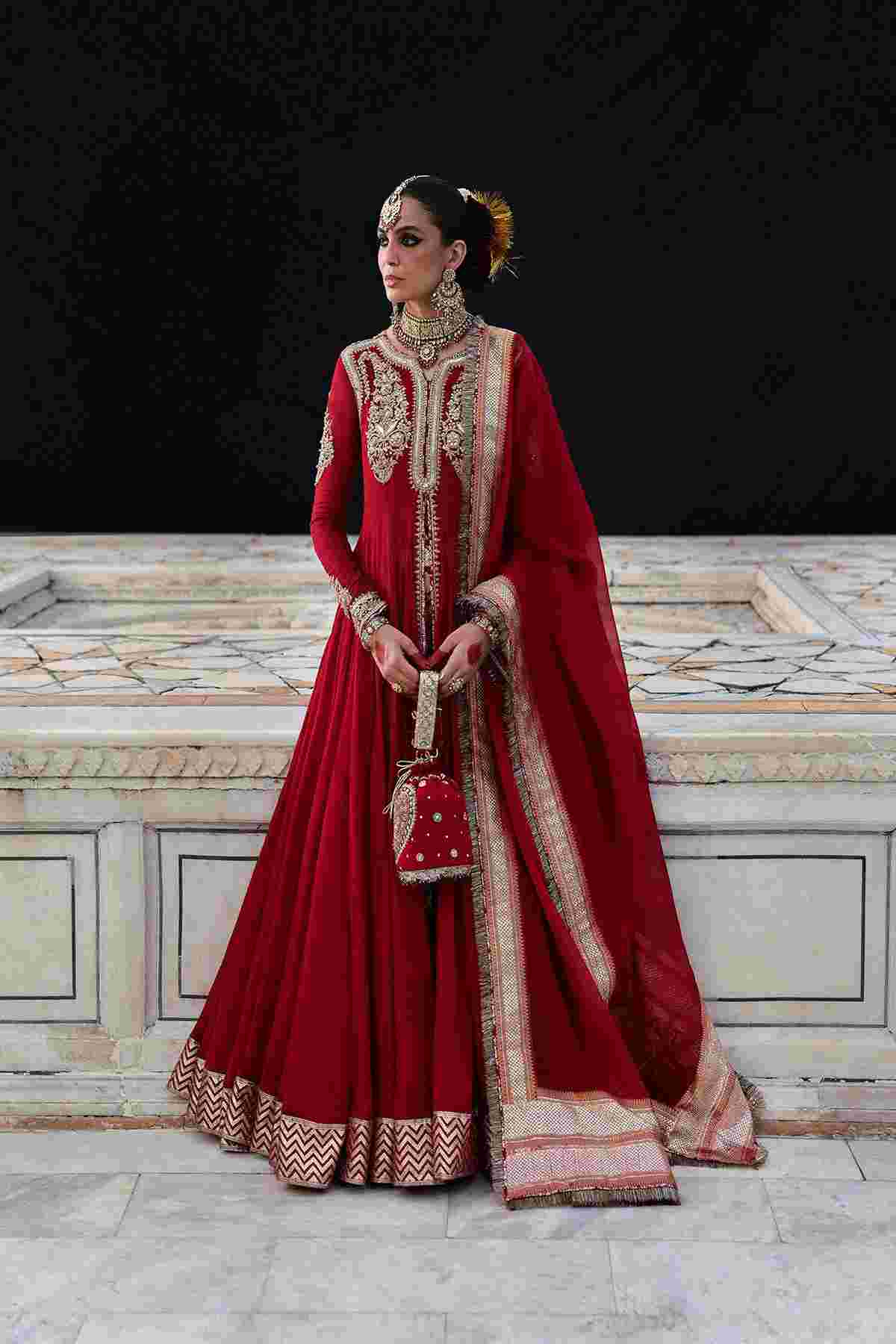 This red chanderi front-slit peshwas adds a modern twist to the classic pishwas, making it perfect for brides or fashion-forward wedding dresses that maintain traditional elegance with a hint of drama and movement. The front slit showcases the churidar, making it a statement outfit for nikkah or baraat. The bodice is heavily embellished. The addition of beautifully designed sleeve borders elevates the outfit, adding finesse and balancing the overall visual rhythm. A beautifully designed sleeve border adds finesse, balances heavy bodices or dupattas, and completes the overall visual rhythm of the outfit. The red color is a timeless and deeply rooted part of South Asian wedding culture, symbolizing love, prosperity, and new beginnings.